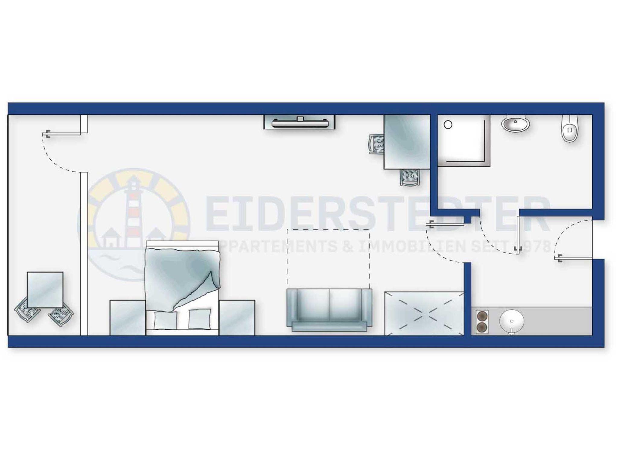 Modernes Studio-Appartement Dünensonne im Bad in St. Peter-Ording mit Balkon und zentraler Lage.