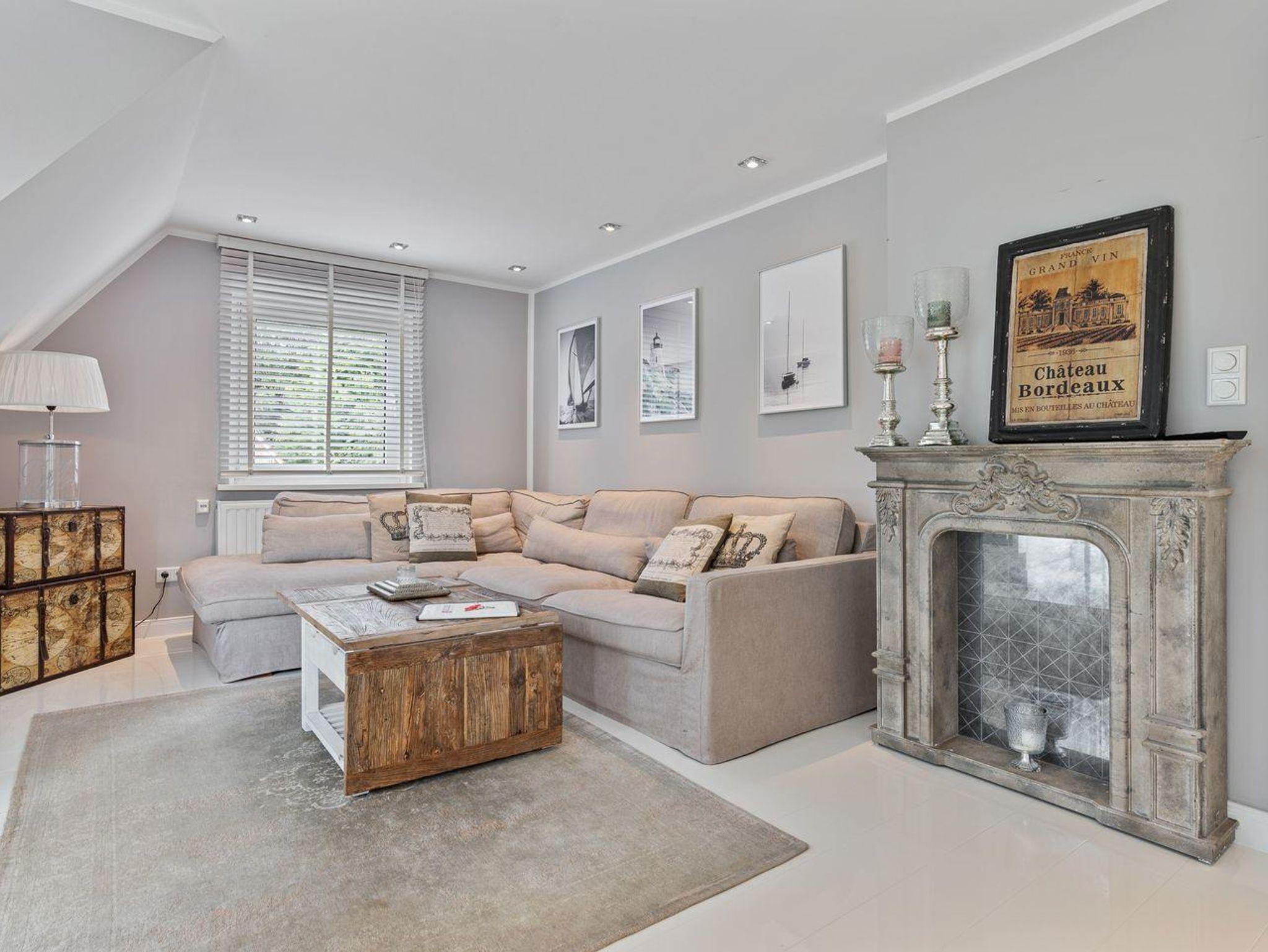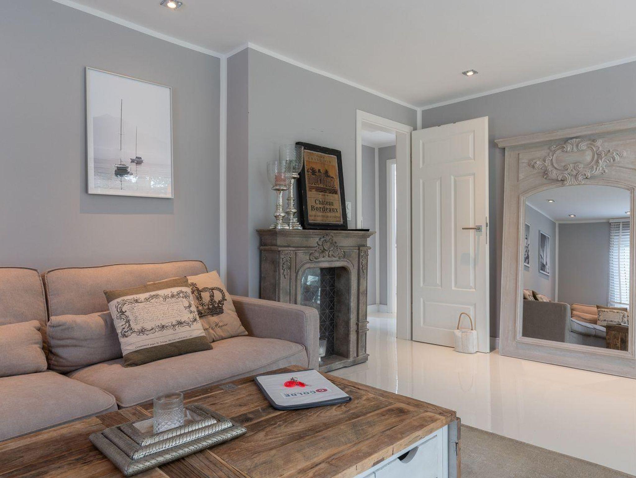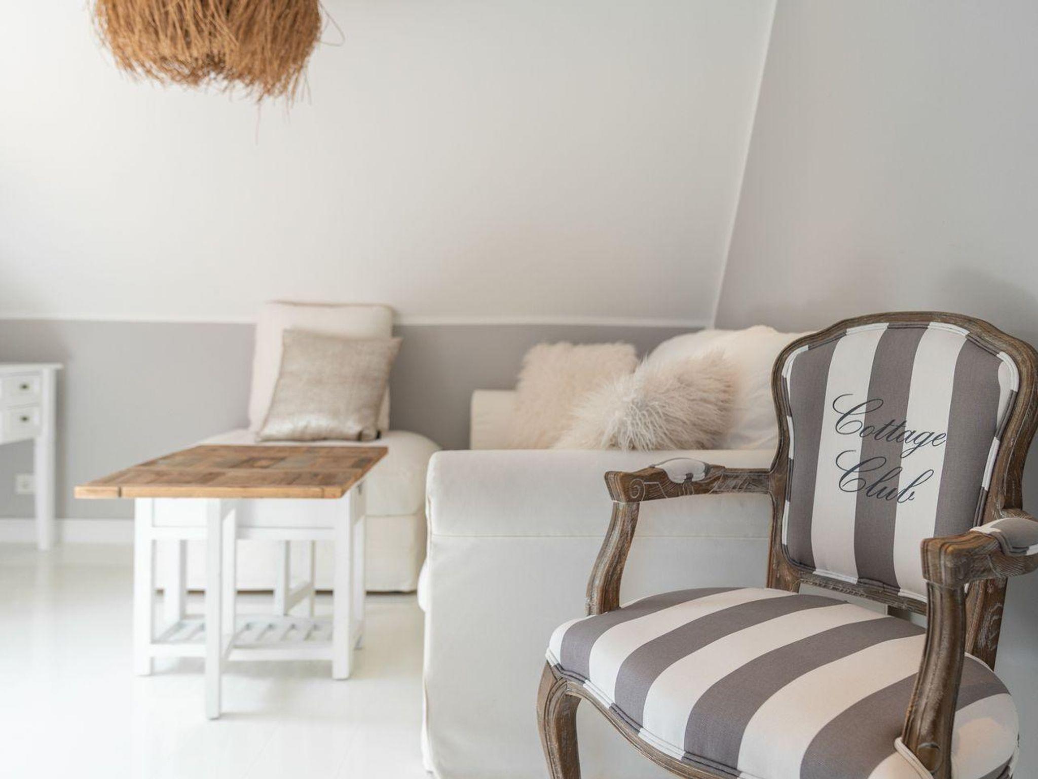 Der Wohnbereich ist hell und stilvoll im Rivièra Maison Stil eingerichtet. In diesem Bereich finden Sie eine gemütliche Eckcouch mit einem Couchtisch und einen Esstisch mit 4 Stühlen. Die Küche ist voll ausgestattet mit einem Herd und Backofen, einer Dunstabzugshaube, einer Einbauküche, Geschirr, einer Kaffeemaschine, Kochtöpfen, einem Kühlschrank, einem Toaster und einem Wasserkocher.