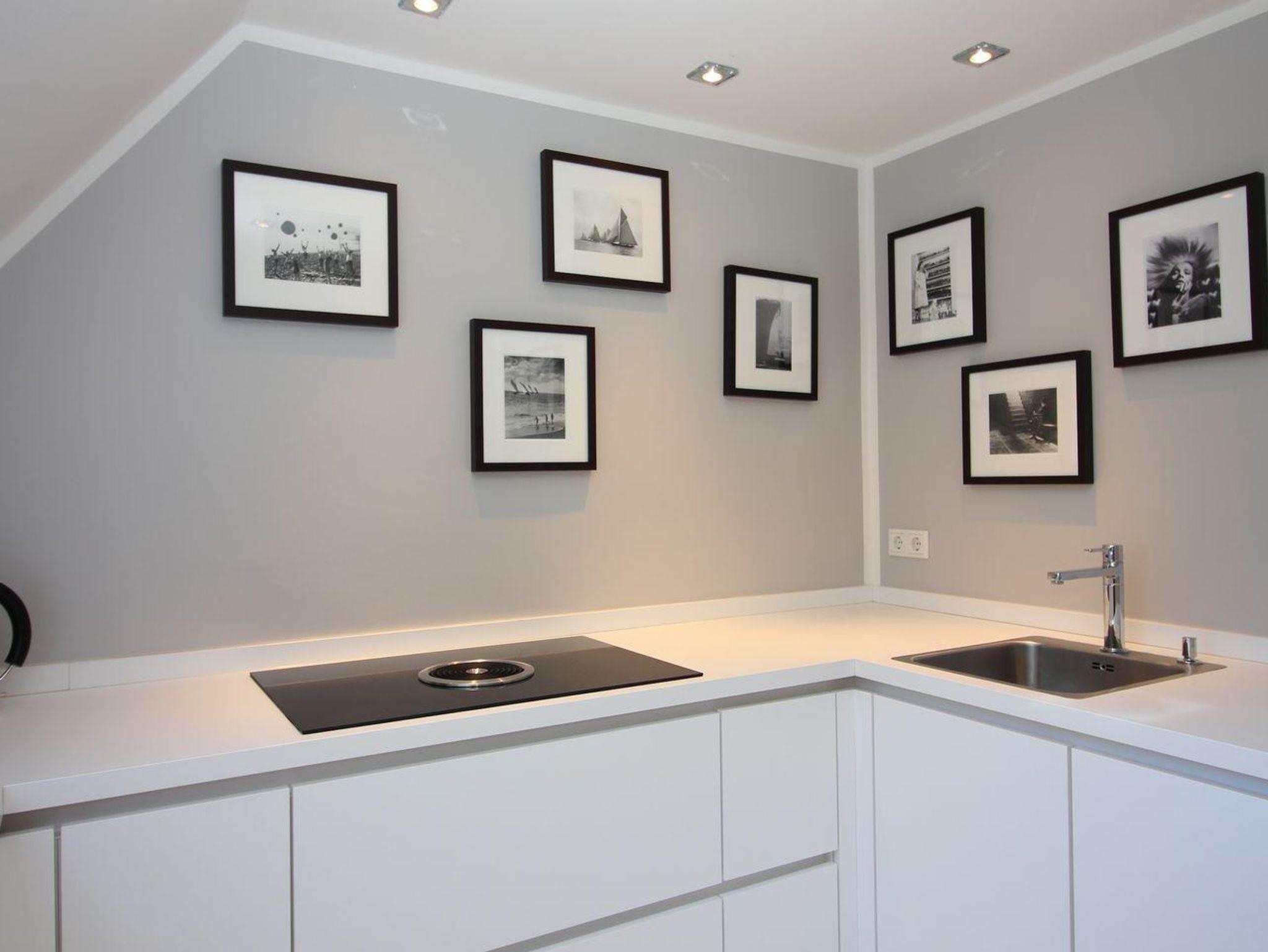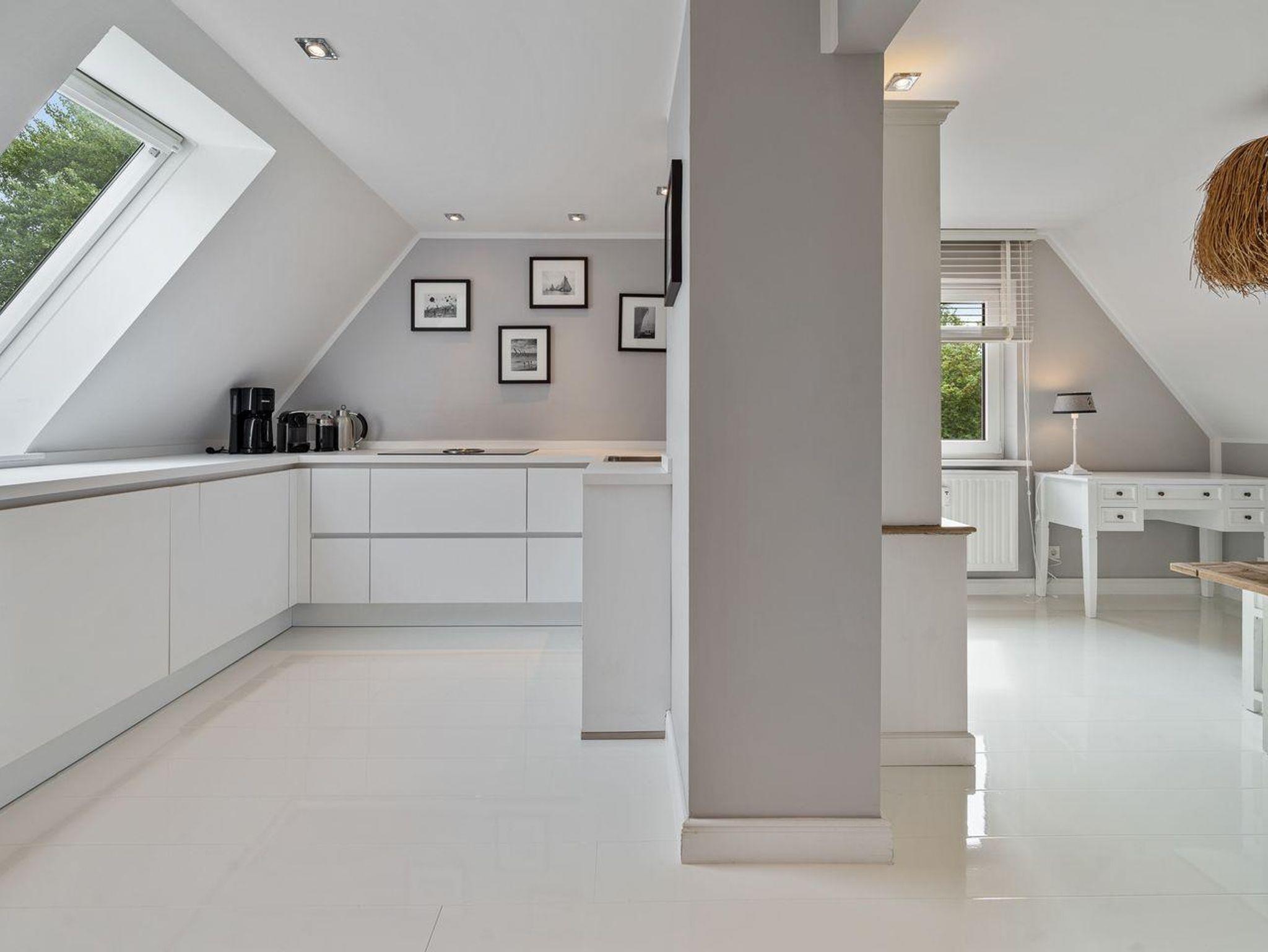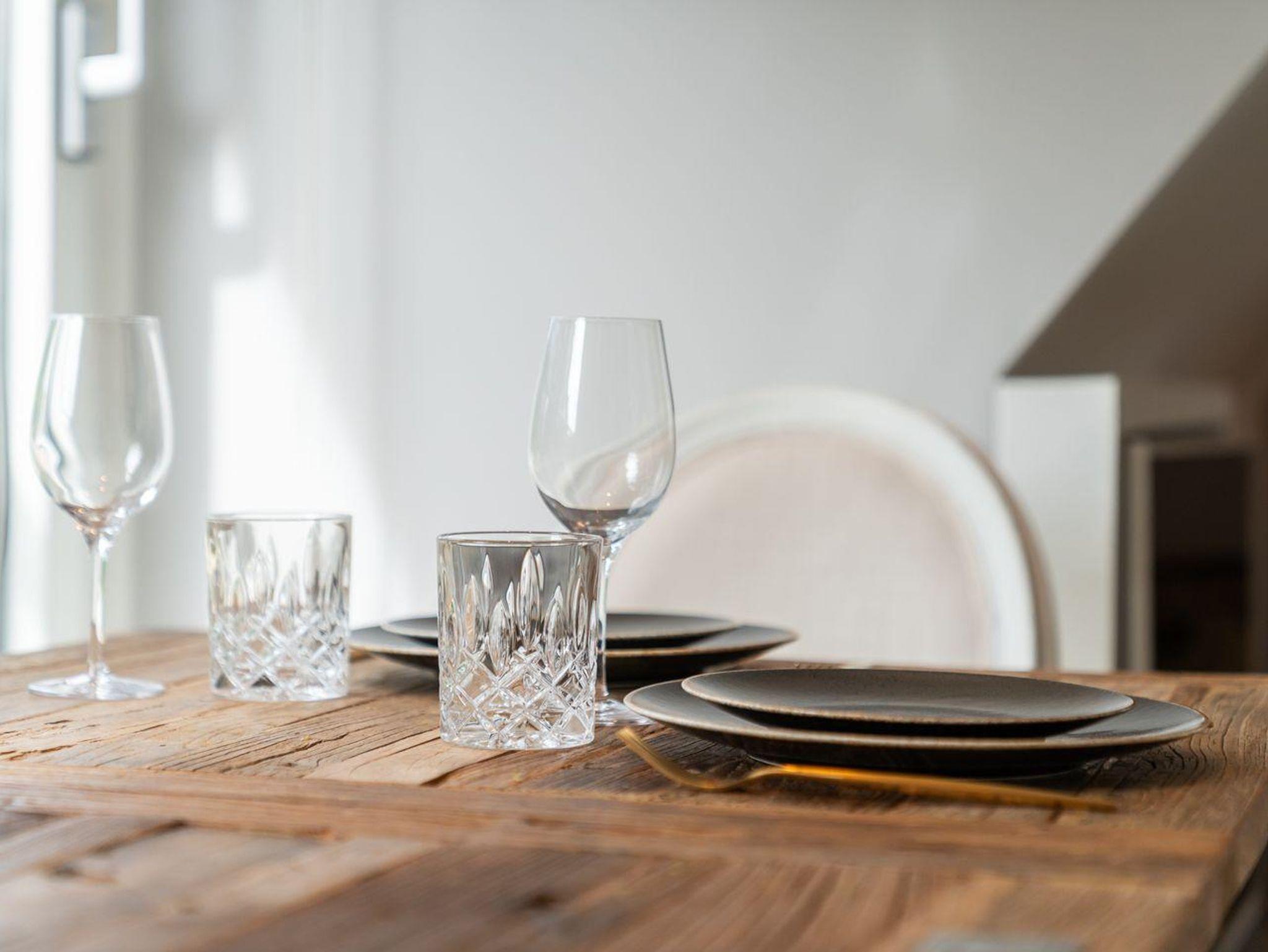 Der Wohnbereich ist hell und stilvoll im Rivièra Maison Stil eingerichtet. In diesem Bereich finden Sie eine gemütliche Eckcouch mit einem Couchtisch und einen Esstisch mit 4 Stühlen. Die Küche ist voll ausgestattet mit einem Herd und Backofen, einer Dunstabzugshaube, einer Einbauküche, Geschirr, einer Kaffeemaschine, Kochtöpfen, einem Kühlschrank, einem Toaster und einem Wasserkocher.