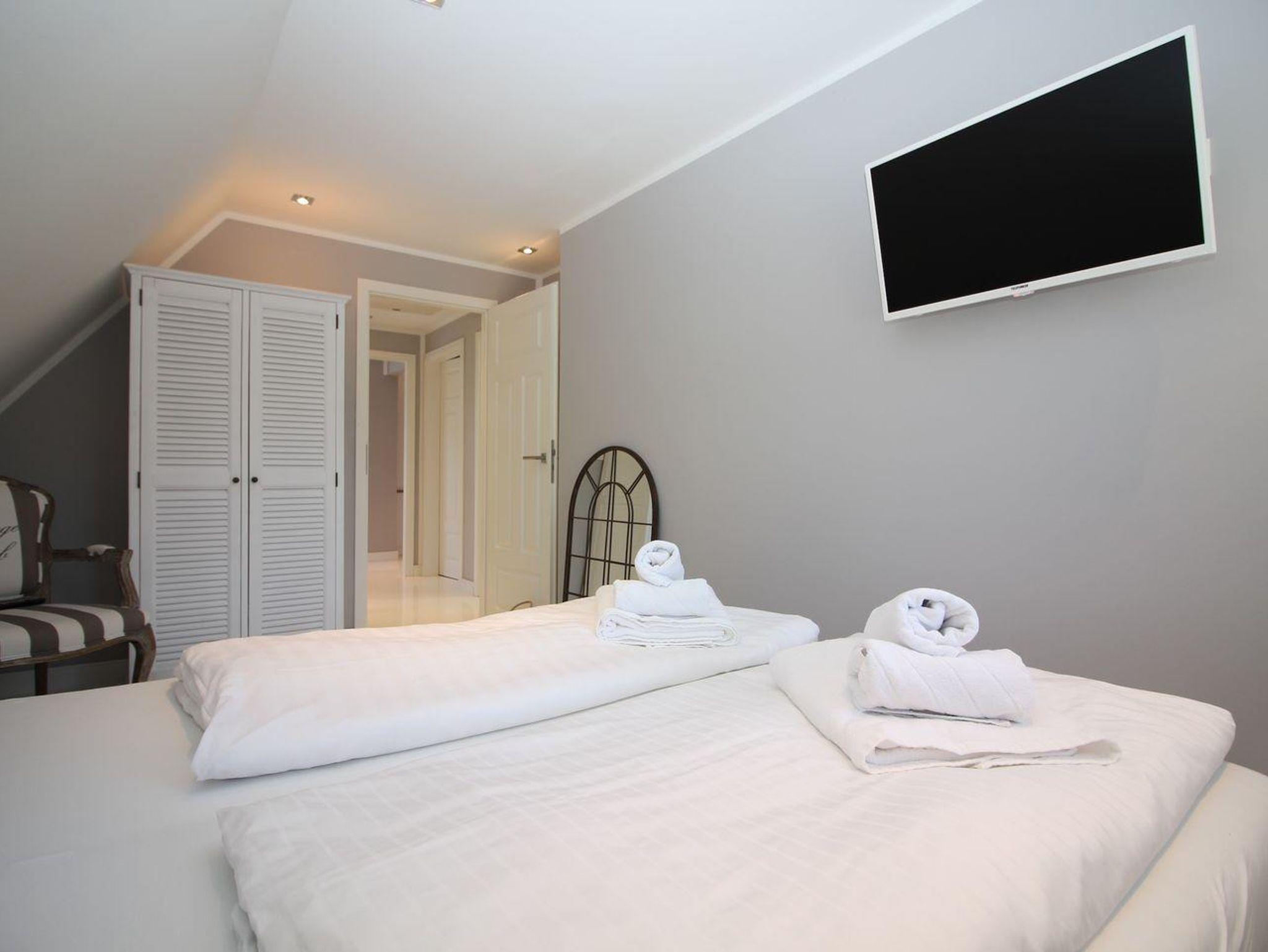 Das separate Schlafzimmer ist mit 2 Nachttischen, einem Kleiderschrank und einem Doppelbett (2,00 x 1,60 m) ausgestattet. Das Badezimmer verfügt über eine Dusche, ein Waschbecken und ein WC. Zur Unterhaltung stehen zwei Sat-TVs Flachbildschirm im Wohnzimmer und einer in einem Schlafzimmer, ein Radio und kostenfreies WLAN zur Verfügung.