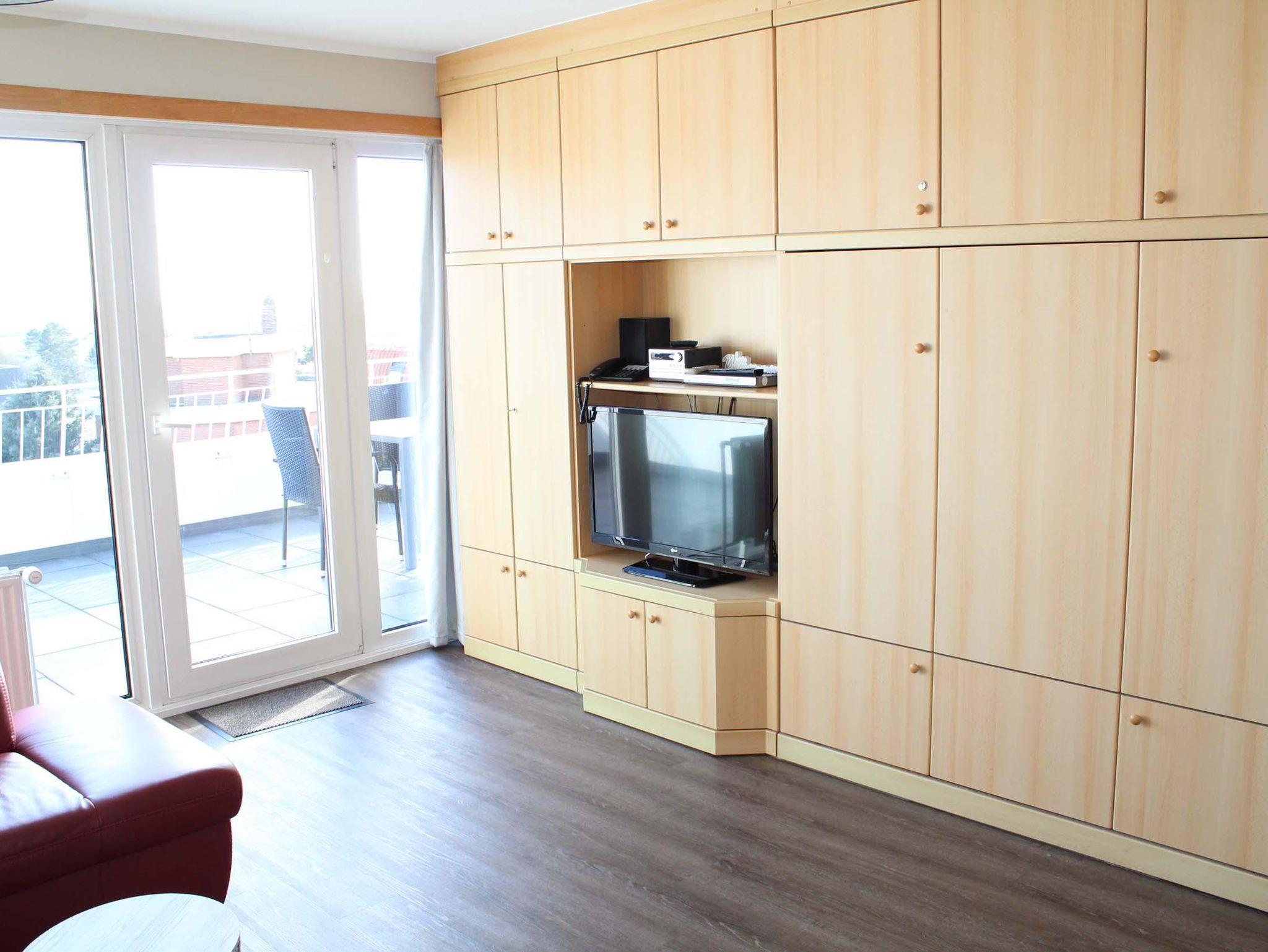 App.Nr. 66, Typ 6, IV.OG., Süd-Ostlage Schlafraum mit 2 Einzelbetten, 1 Schlafraum mit 1 Einzelbett und mit 2. Fernseher, Wohn-Schlafraum mit 2 Wandschrankbetten, PVC-Fußboden, Sitzecke, Essecke, Küchenzeile mit Geschirrspüler, Mikrowelle und Backofen, Dusche/WC, Durchwahltelefon, Kabel-TV, Balkon, Garagenstellplatz 66, Aufzug und Fahrradkeller. Rezeption, Brötchenservice, Schwimmbad, Sauna kostenpflichtig, kostenfreier Internetzugang (LAN-Germania). Bettwäsche wird einmalig bei Einzug gestellt. Handtücher können gegen Gebühr entliehen werden. NICHTRAUCHERWOHNUNG