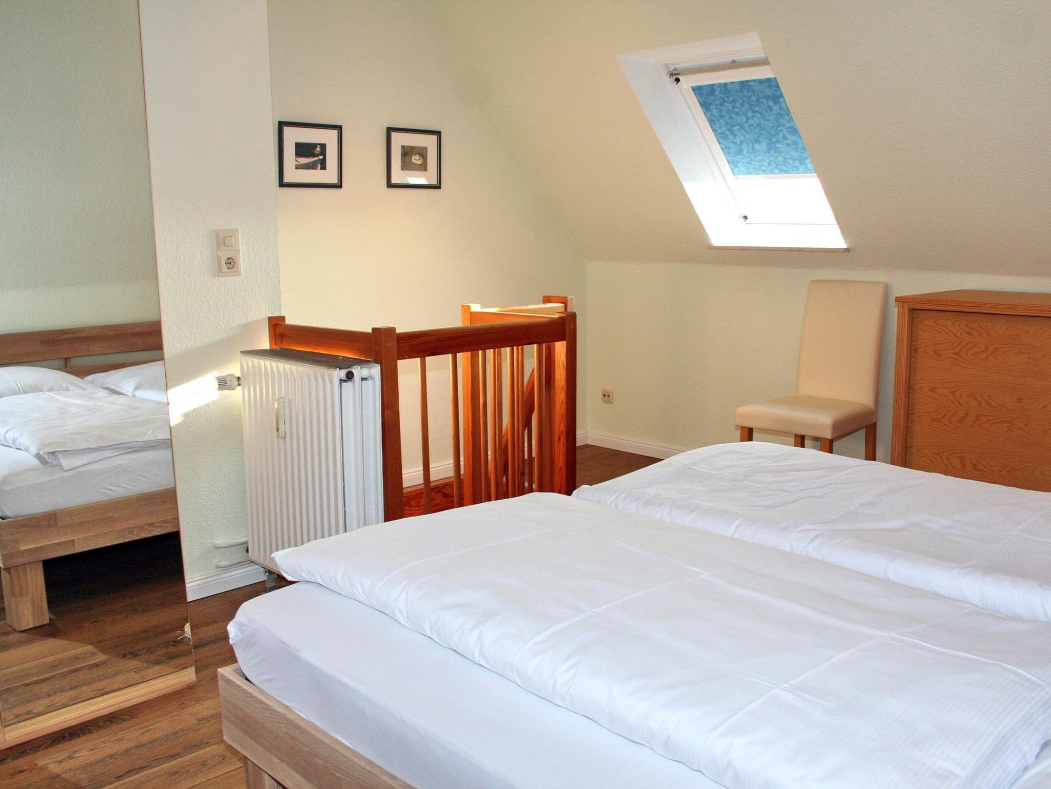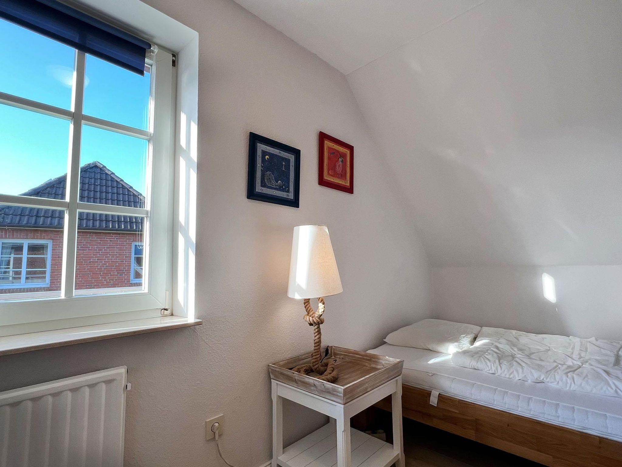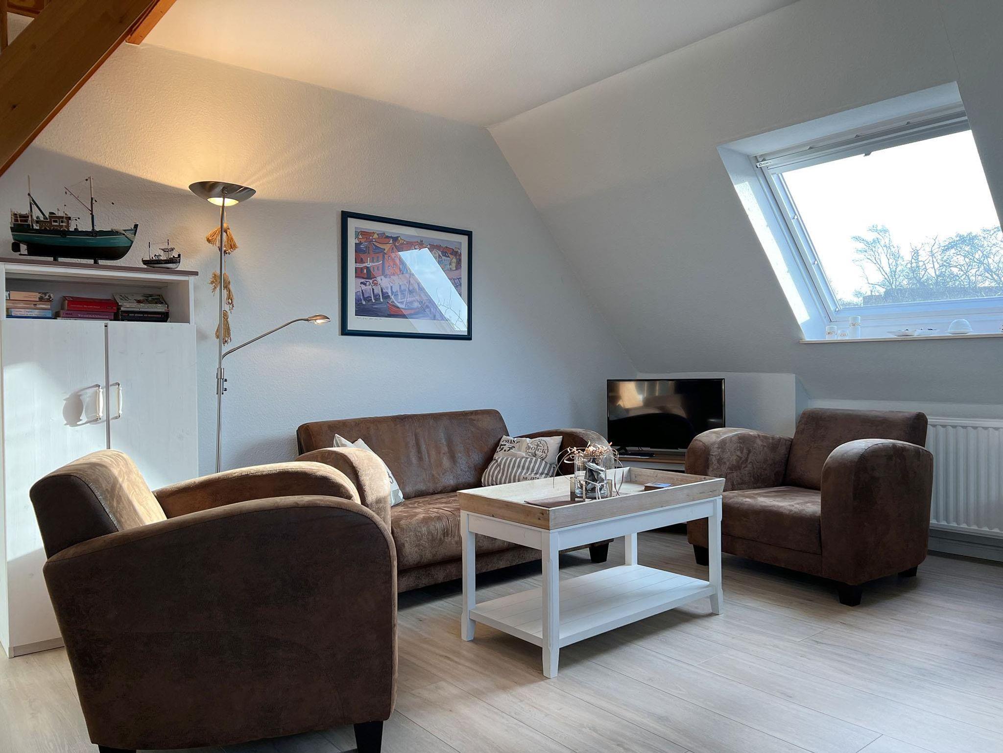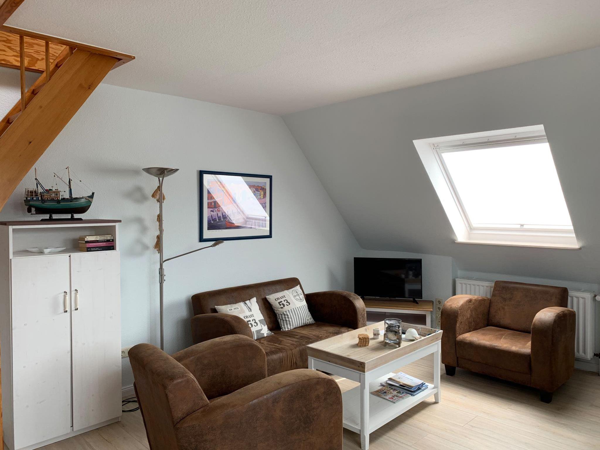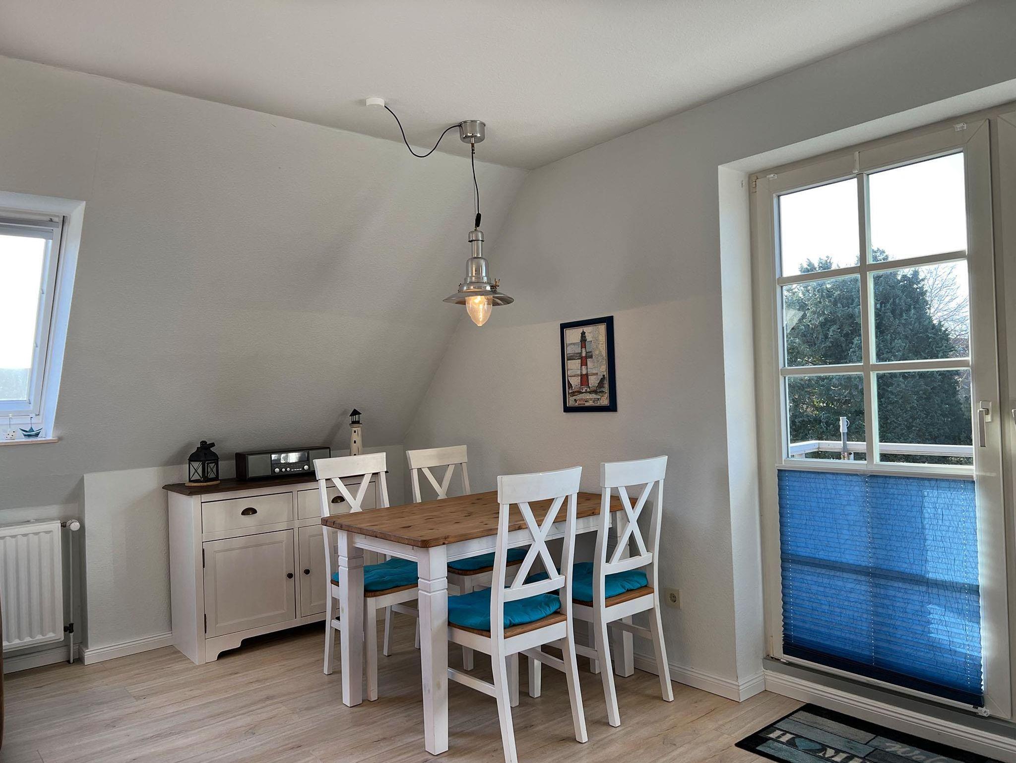 In dieser gut ausgestatteten 3-Zimmer-Ferienwohnung mit einer Größe von 58 qm für 2-3 Personen machen Sie schöne Ferien. Die Nichtraucher-Wohnung besitzt im 1. OG und DG 2 Schlafzimmer mit insgesamt 3 Schlafplätzen. Auf dem Süd-Westbalkon können Sie die gute Nordseeluft geniessen. Die kleine Küche ist mit einem Cerankochfeld, Heißluftbackofen, Dunstabzugshaube, Spülmaschine und einem Kühlschrank mit Gefrierfach ausgestattet. Dazu gibt es elektrische Kleingeräte wie Pürrierstab, Toaster, Kaffeemaschine etc.