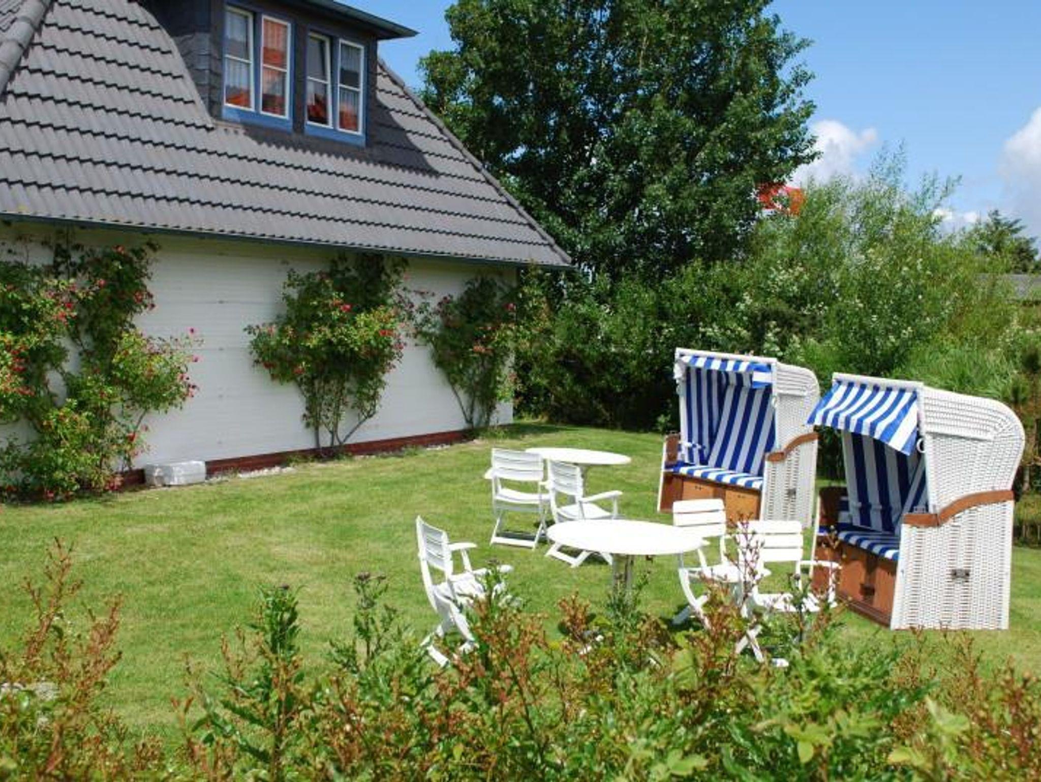 Zwei Wohnungen liegen im EG mit möblierten Terrassen und zwei Wohnungen im OG mit eigener Sitzgruppe und eigenem Strandkorb im Garten.