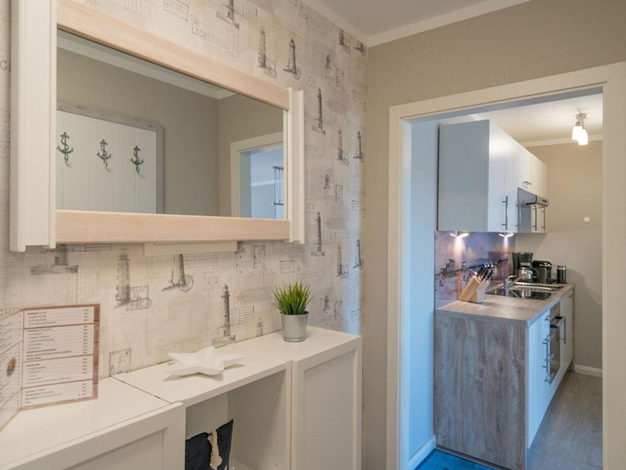 Die 49 qm Ferienwohnung besteht aus einem schönen Wohnbereich mit Couch und Couchtisch. Des weiteren steht ein Esstisch mit 4 Stühlen bereit. Die Küchenzeile der Wohnung ist ausgestattet mit einem Herd mit Ceranfeld und Backofen, Dunstabzugshaube, Geschirr, Kaffeemaschine, Kochtöpfe, Kühlschrank, Mikrowelle, Toastern und einem Wasserkocher.