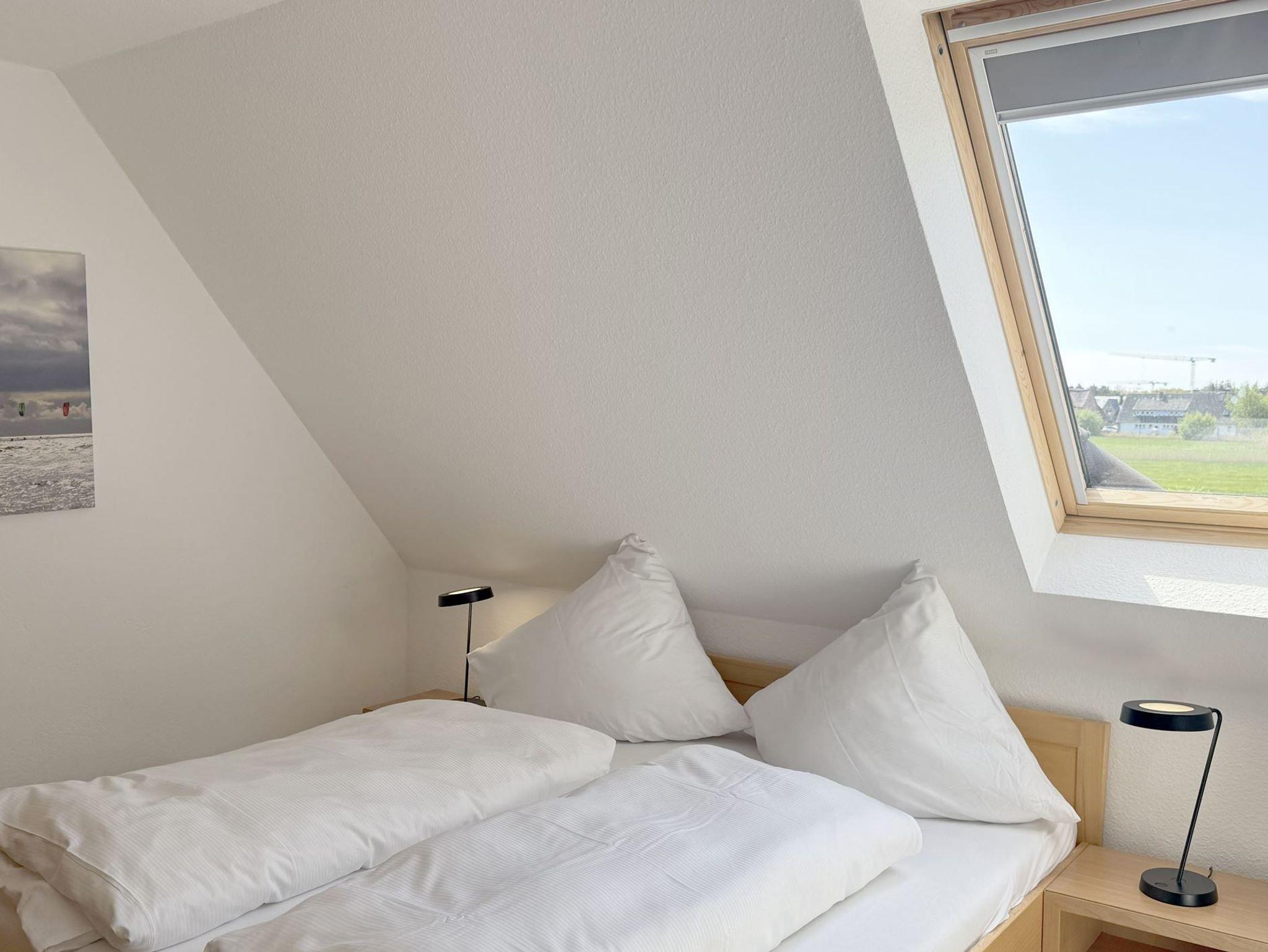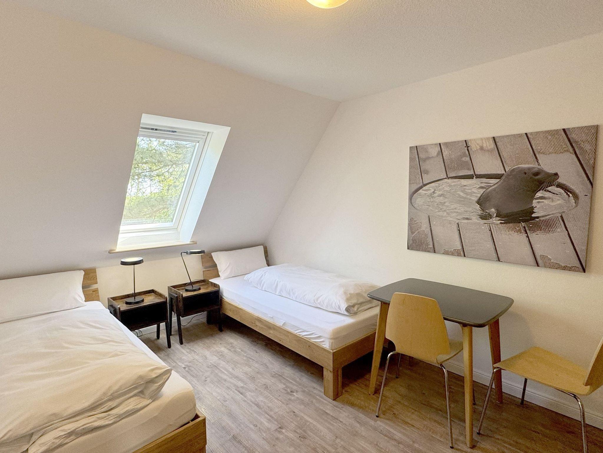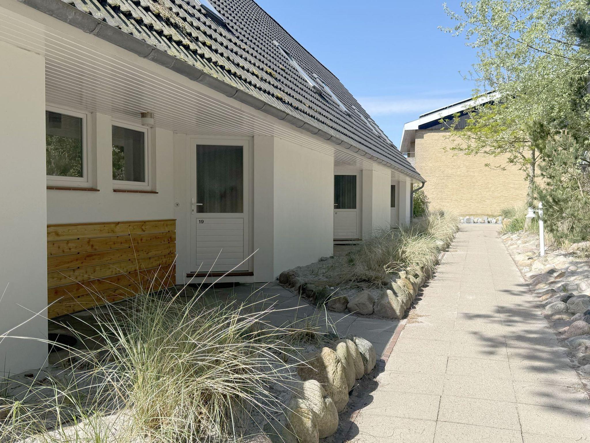 Die ca. 70 qm teilen sich folgendermaßen auf: Im Erdgeschoss befindet sich die Eingangsdiele mit einer gradläufigen Treppe nach oben zu den beiden Schlafzimmern. 1 Schlafraum mit Doppelbett (180x200cm mit getrennten Matratzen), ein Schlafraum mit 2 Einzelbetten (90x200cm). Das Zustellen eines Kinderreisebettes oder Hochstuhles ist kein Problem. Abgehend von der Eingangsdiele der Wohn-Essraum mit voll ausgestatteter Küchenzeile, gemütlicher Sitzecke und Essecke im raumhoch verglasten Wintergarten, direkter Zugang zur mit einer kleinen Sanddüne eingefassten Terrasse und Garten. Das Duschbad ist ausgestattet mit Dusche, WC, Waschtisch und Außenfenster.