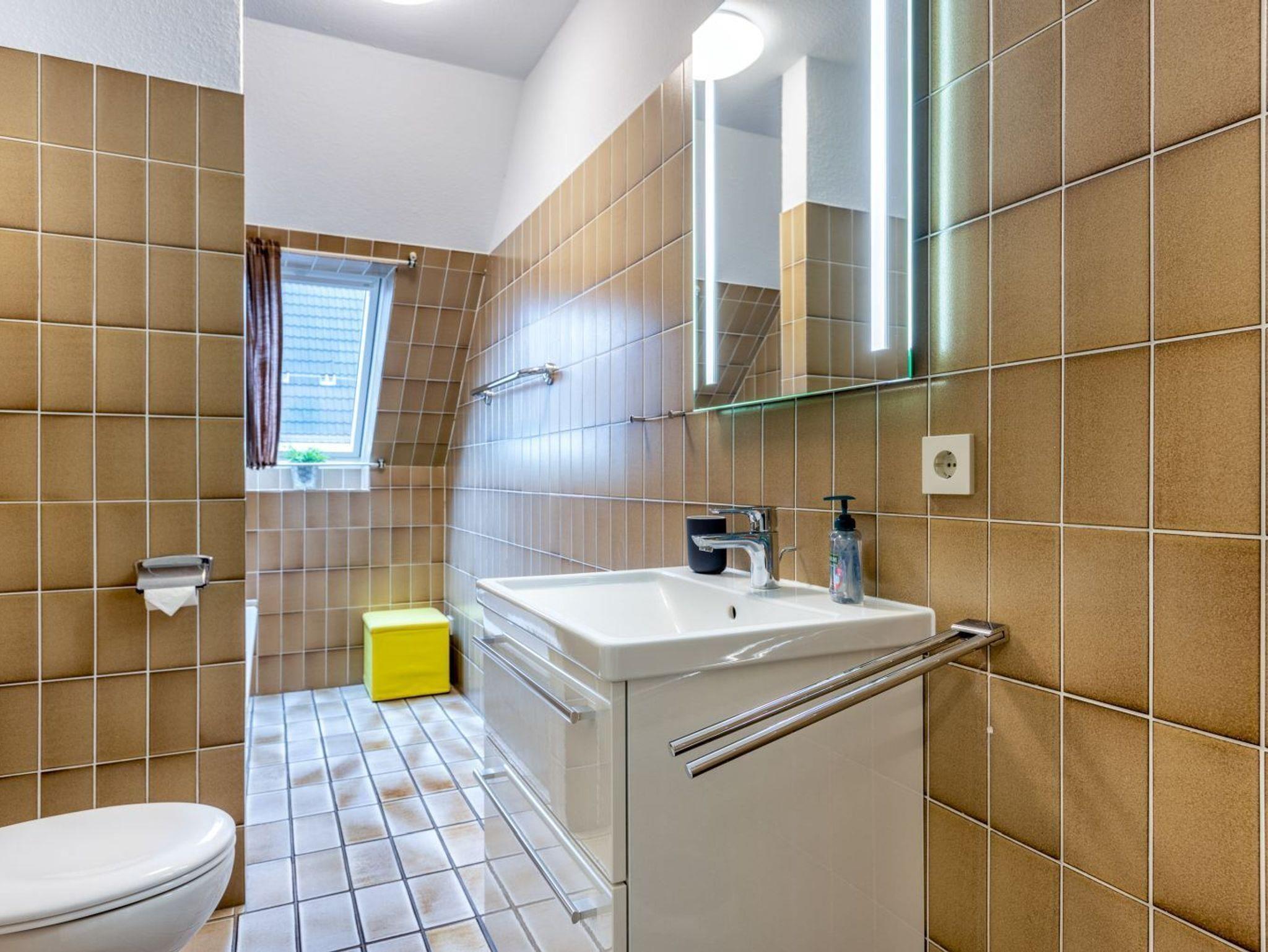Badezimmer (Wannenbad) mit Badewanne mit Dusch-Handstück, WC, Tageslicht und Föhn.