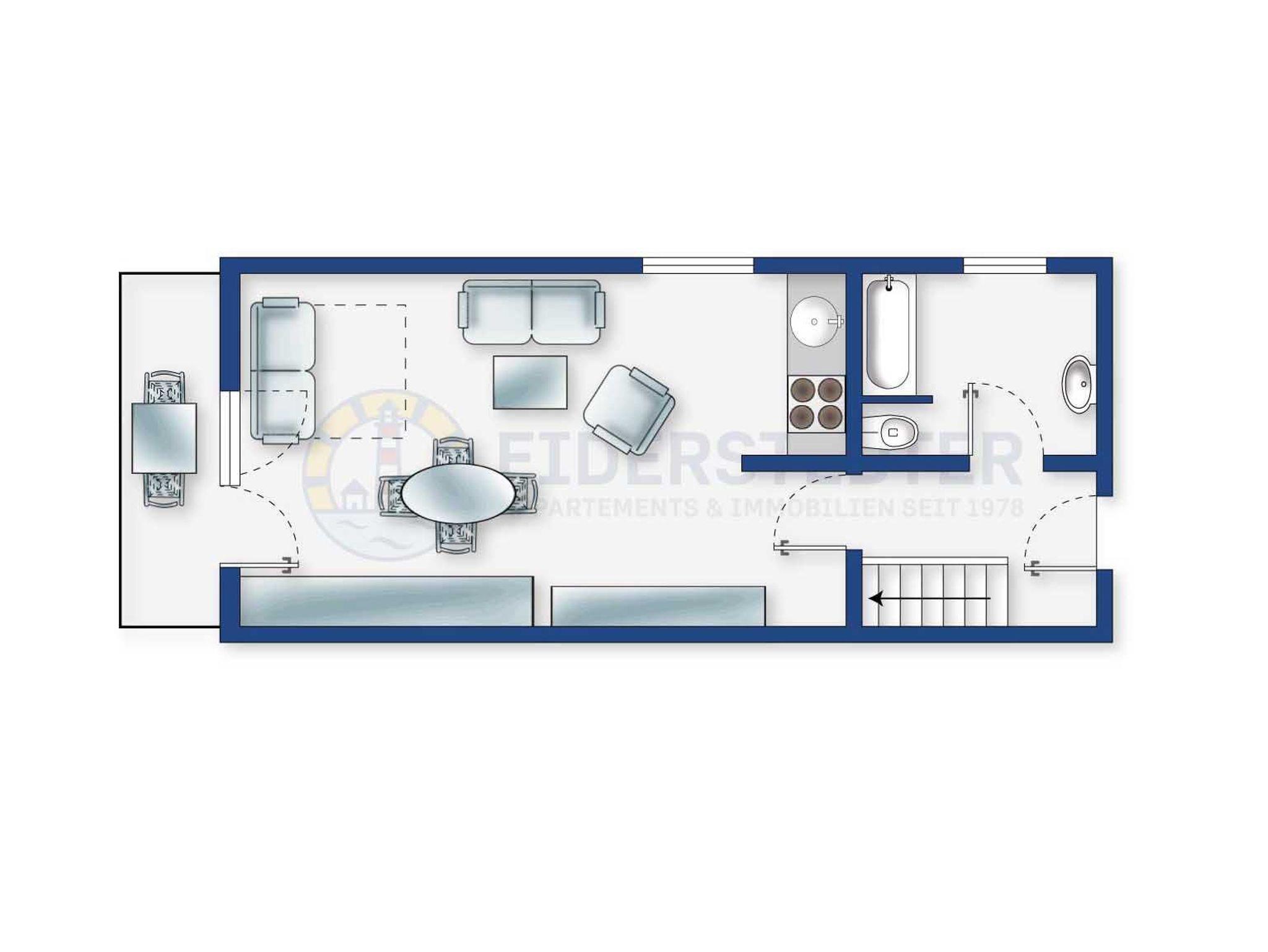 Wohnzimmer mit 2 Sofas, eines davon ist ein ausziehbares Schlafsofa (140x195cm), einem Sessel, Esstisch mit 4 Stühlen, TV (Sat), Stereo-Kompaktanlage und DVD-Player. Direkter Zugang zum möblierten Balkon zur Deichseite. Offene Küche mit Backofen, Mikrowelle, Geschirrspüler und Kühlschrank mit Gefrierfach.