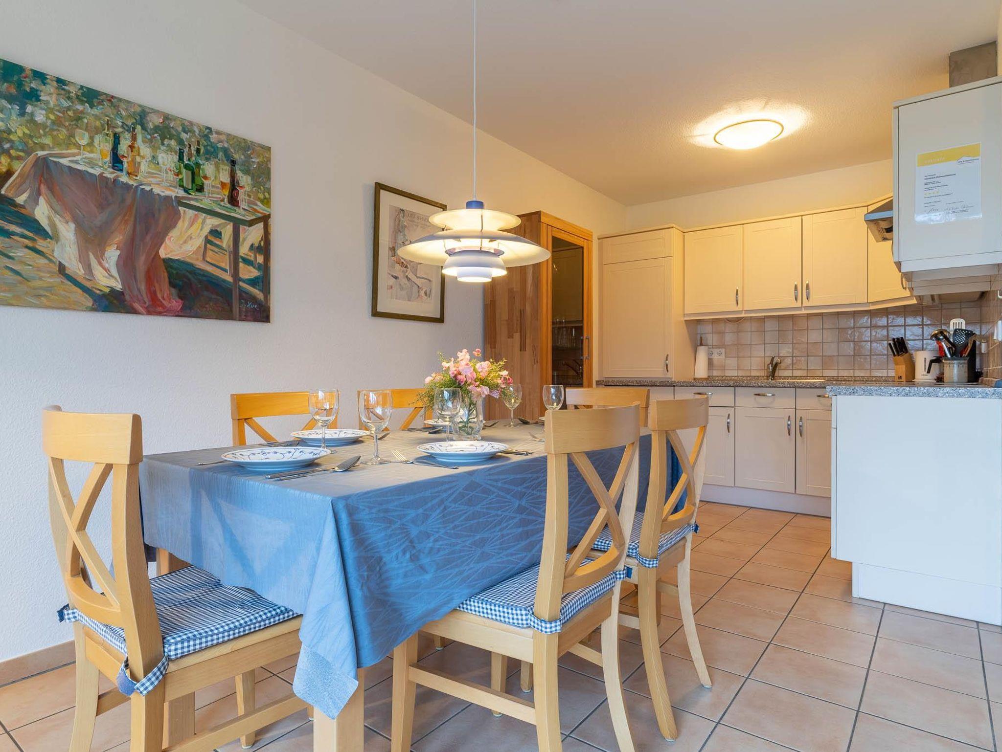 Die 4-Sterne-Komfortwohnung für den gehobenen Anspruch hat eine Größe von ca. 90 qm, ist für bis zu 6 Personen geeignet, erstreckt sich über 3 Etagen und ist hell und hübsch eingerichtet. Der untere Teil der Wohnung ist komplett gefliest. Alle weiteren Räume sind mit Teppichböden versehen. Der Wohnraum ist mit einer geschmackvollen neuen Ledergarnitur eingerichtet. Für Unterhaltung sorgen ein neu Sat-TV, Radioanlage, DVD-Player und ein Telefon. Wir bieten Ihnen auch gerne W-LAN für Ihre Internetverbindung an. Zur Selbstversorgung dient eine wunderschöne, komplett ausgestattete Einbauküche mit Ceran-Kochfeld, Backofen, Geschirrspüler, Toaster, Wasserkocher, Kaffeemaschine. Genügend Geschirr und Küchenutensilien sind vorhanden. Der große, angrenzende Esstisch lädt zum Speisen ein. Vom Wohnraum erreichen Sie die nach Westen gelegene sonnige Terrasse mit Gartenmöbeln und Blick zum Deich.