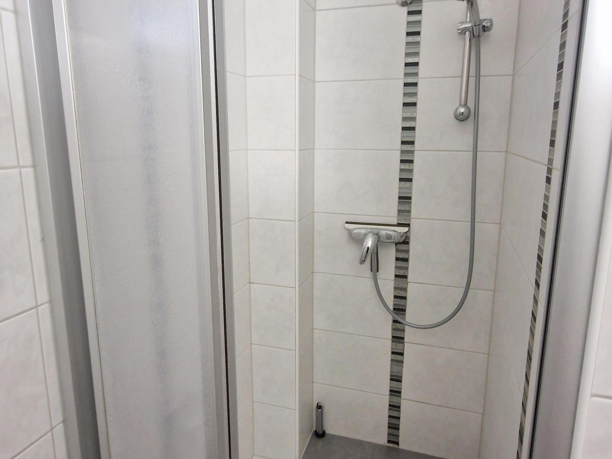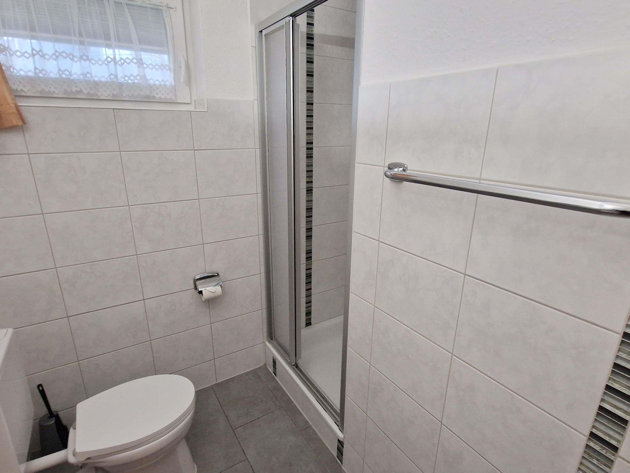 Bad: Dusche, Waschbecken, WC, Duschkabine, Spiegelschrank, Handtuchständer, Hocker