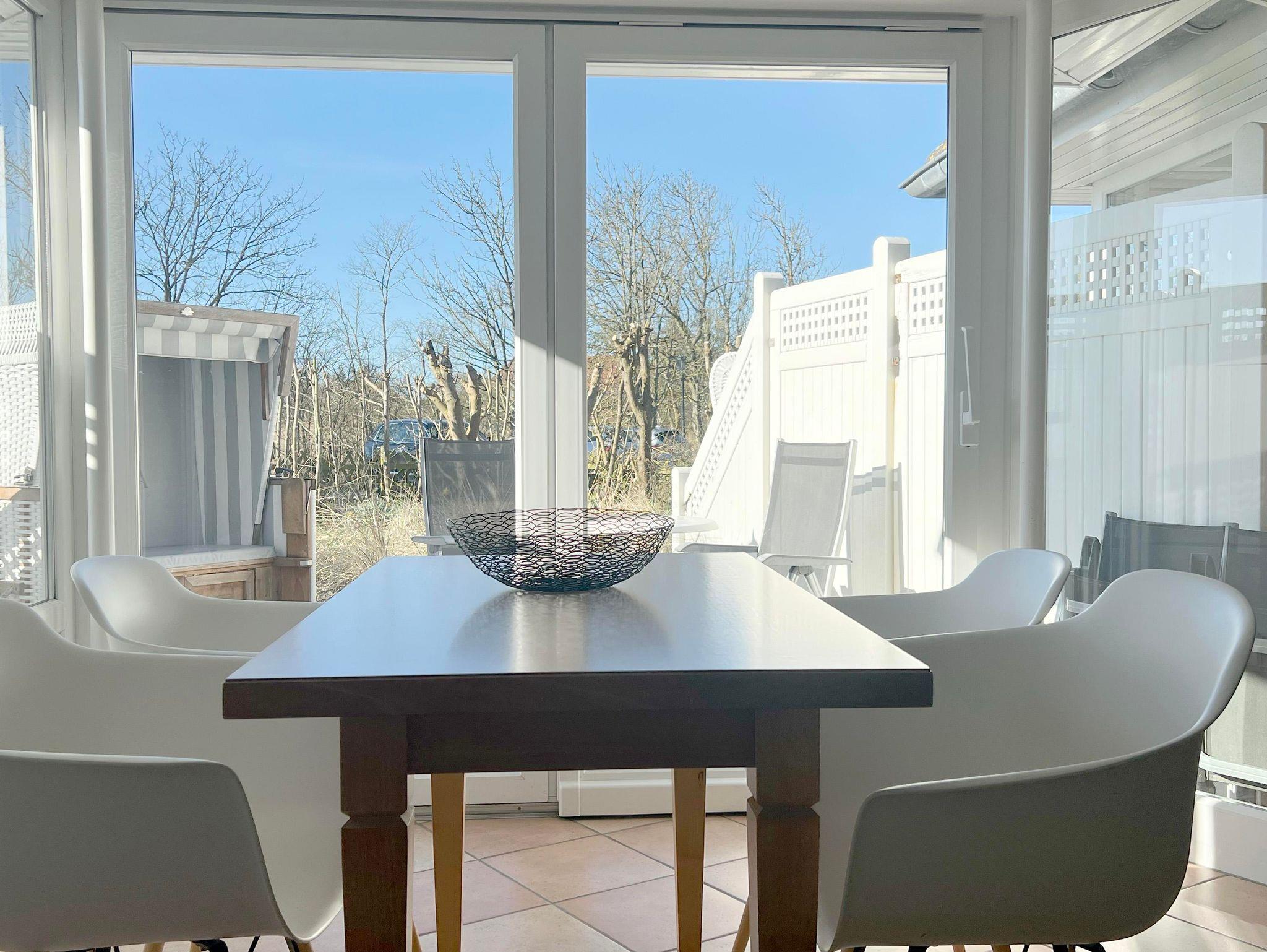 Im Erdgeschoss befindet sich die Eingangsdiele mit einer gradläufigen Treppe nach oben zu den beiden Schlafzimmern.1 Schlafraum mit Doppelbett 180x200cm mit getrennten Matratzen, ein Schlafraum mit 2 Einzelbetten (90x200cm). Das Zustellen eines Kinderreisebettes oder Hochstuhles ist kein Problem. Abgehend von der Eingangsdiele, der Wohn-Essraum mit voll ausgestatteter Küchenzeile, gemütlicher Sitzecke und Essecke im raumhoch verglasten Wintergarten, direkter Zugang zu einer, mit einer kleinen Sanddüne eingefassten Terrasse und Garten. Das Duschbad ist komplett neu in 2018, ausgestattet mit begehbarer Dusche, WC, Waschbecken und Außenfenster.