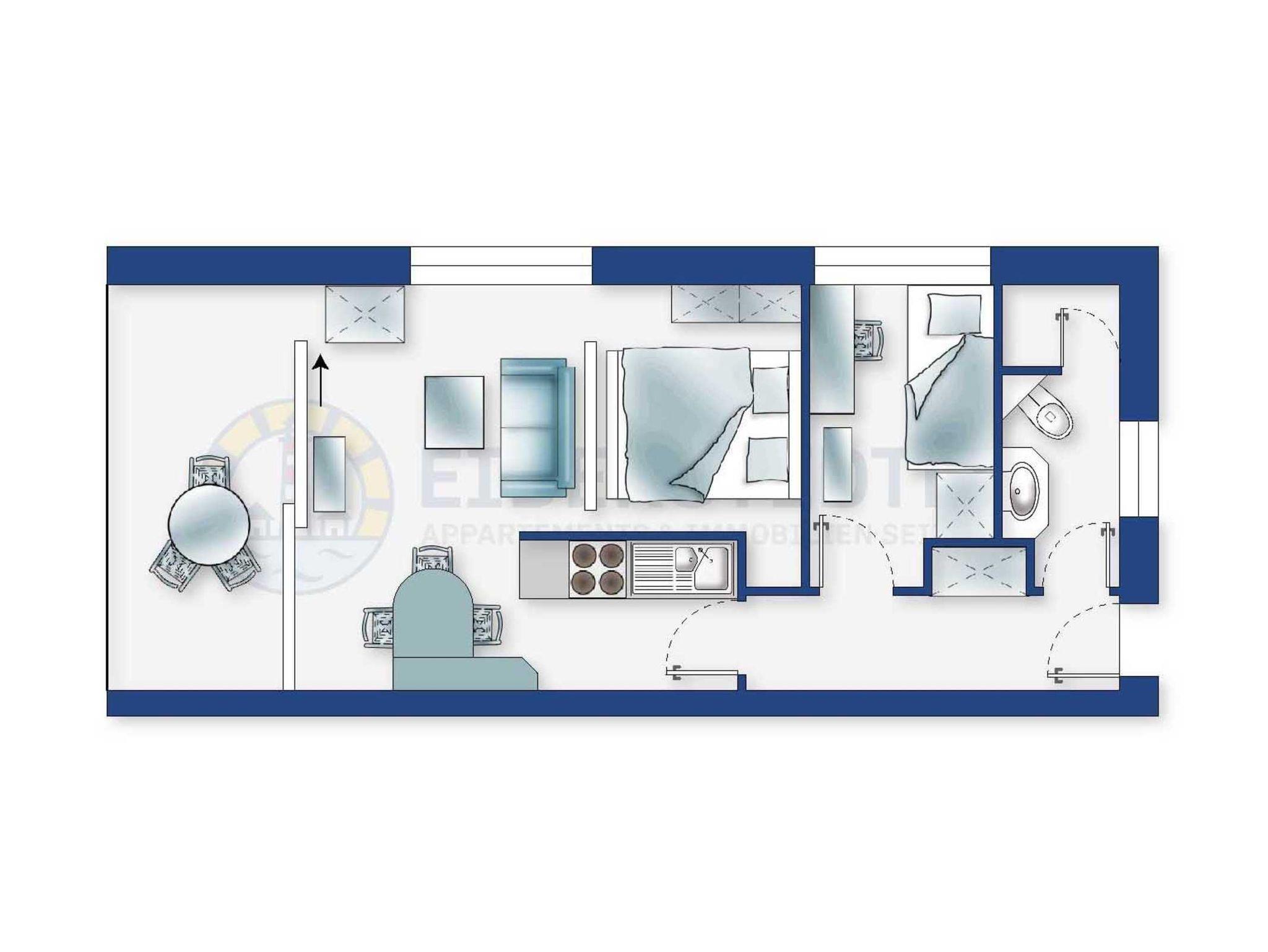 Wohnzimmer mit Sofa, TV (Kabel), Stereo-Kompaktanlage mit CD-Player, Esstisch für 3 Personen und kleinem Meerblick. Offene Küche mit Backofen, Mikrowelle, Geschirrspüler und Kühlschrank mit Gefrierfach. Direkter Zugang zum möblierten Balkon nach Süden.