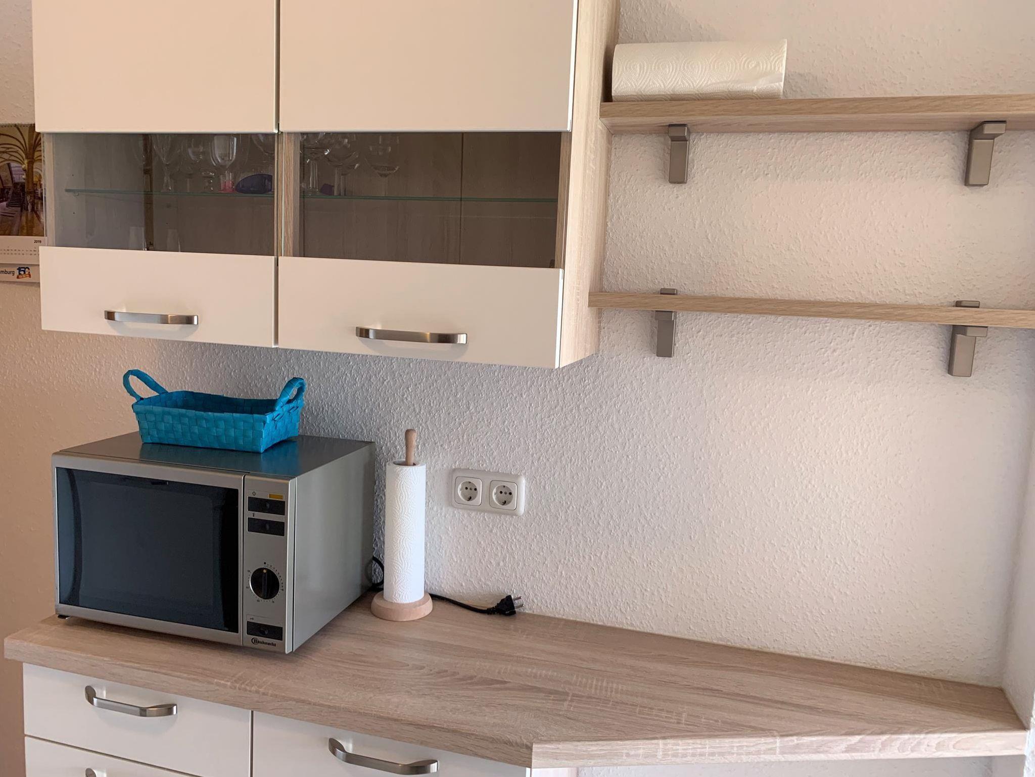 Küche: Einbauküche mit Geschirrspüler, 4 Plattenherd mit Backofen, Dunstabzugshaube, Kühlschrank, Kaffeemaschine, Wasserkocher, Toaster, Geschirr, Kochtöpfe