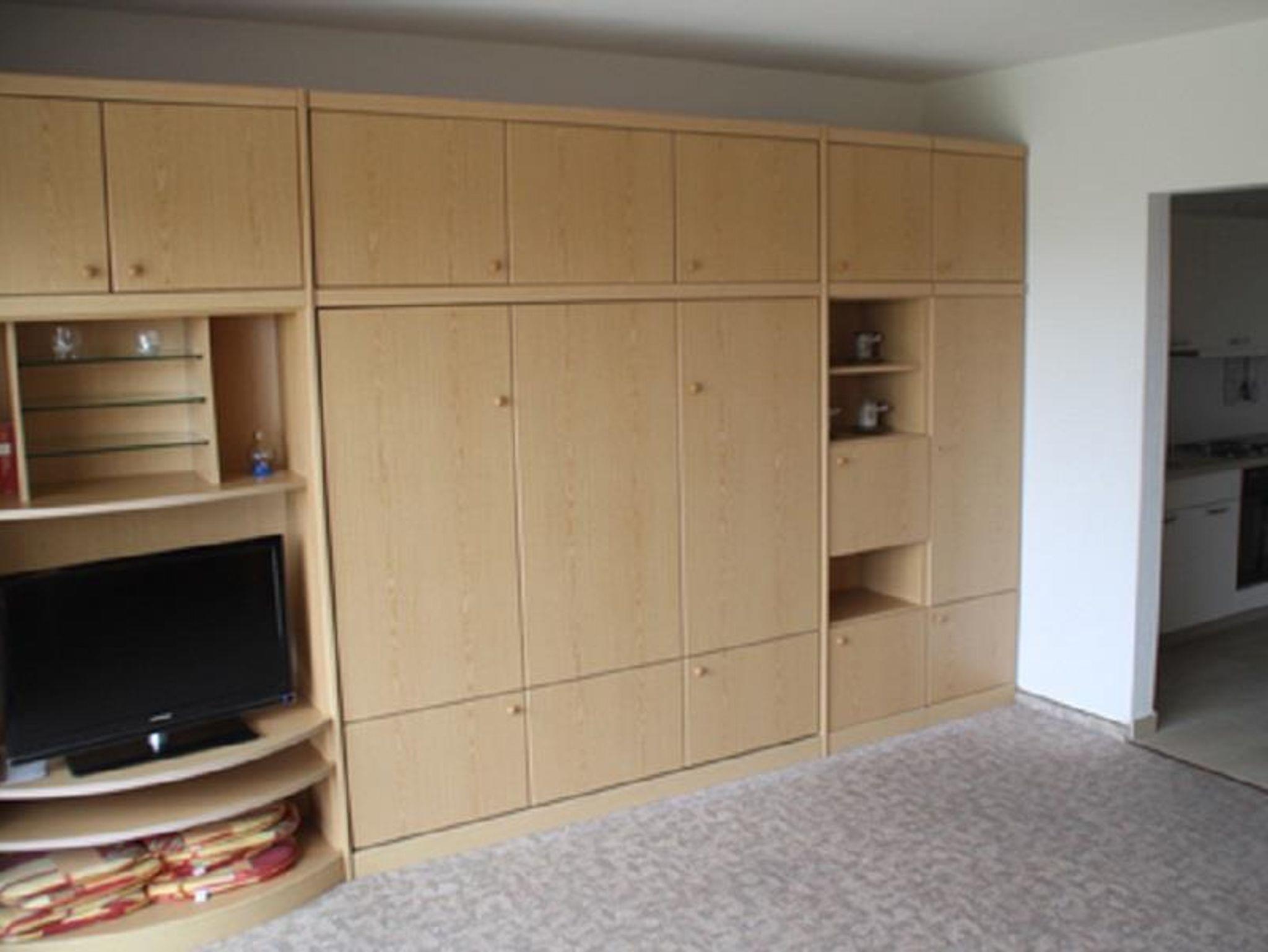 Wohnzimmer: Couch, Couchtisch, 2 Sessel, Stehlampe, Rollregal, Rolltisch, Kofferradio mit CD-Player, TV-Schrank, Schrankdoppelbett, Regalschrank, Kleiderschrank, Sat-TV, Esstisch, 4 Stühle