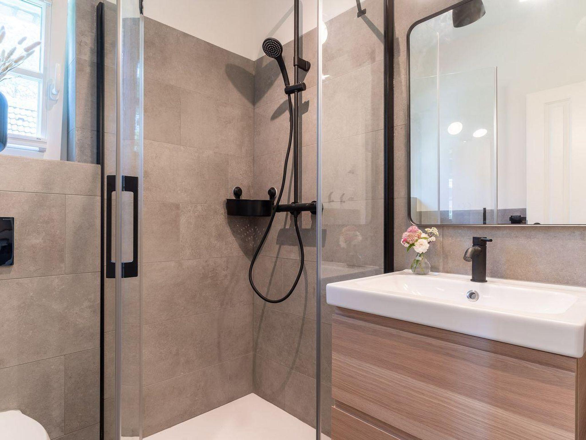 Vom Wohnzimmer gelangen Sie auf eine gemütliche, sonnige Süd Terrasse mit stylischen Gartenmöbeln. An den Wohnraum schließt sich ein Duschbad an.