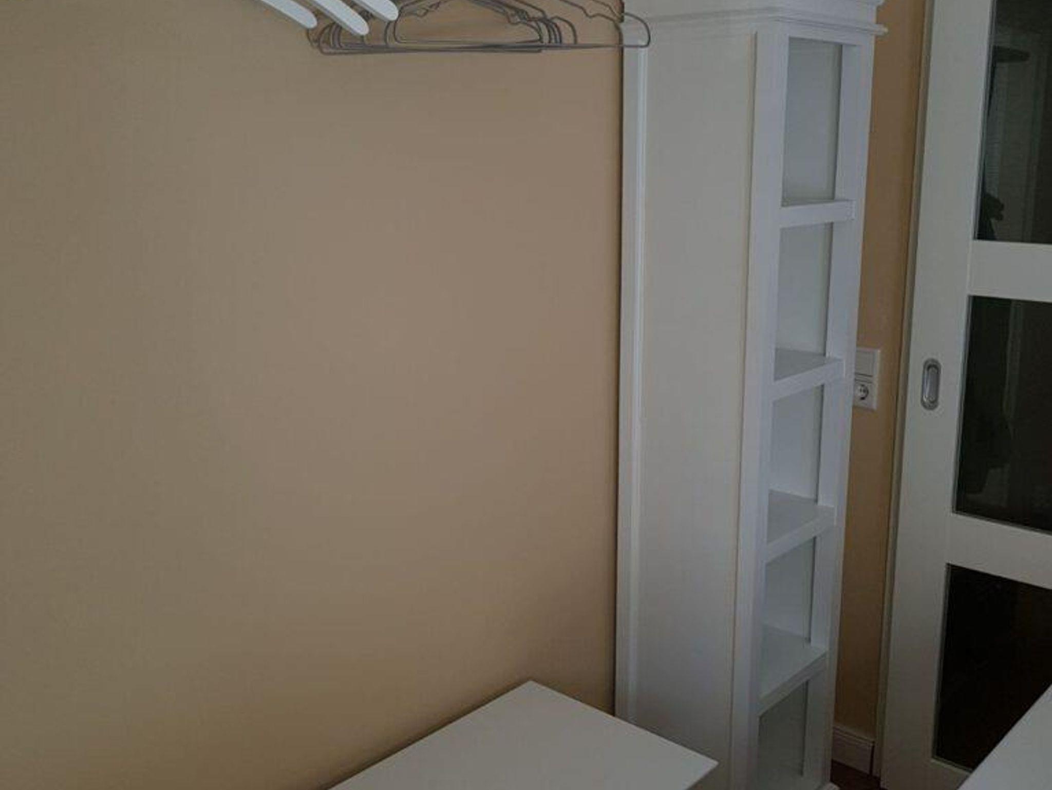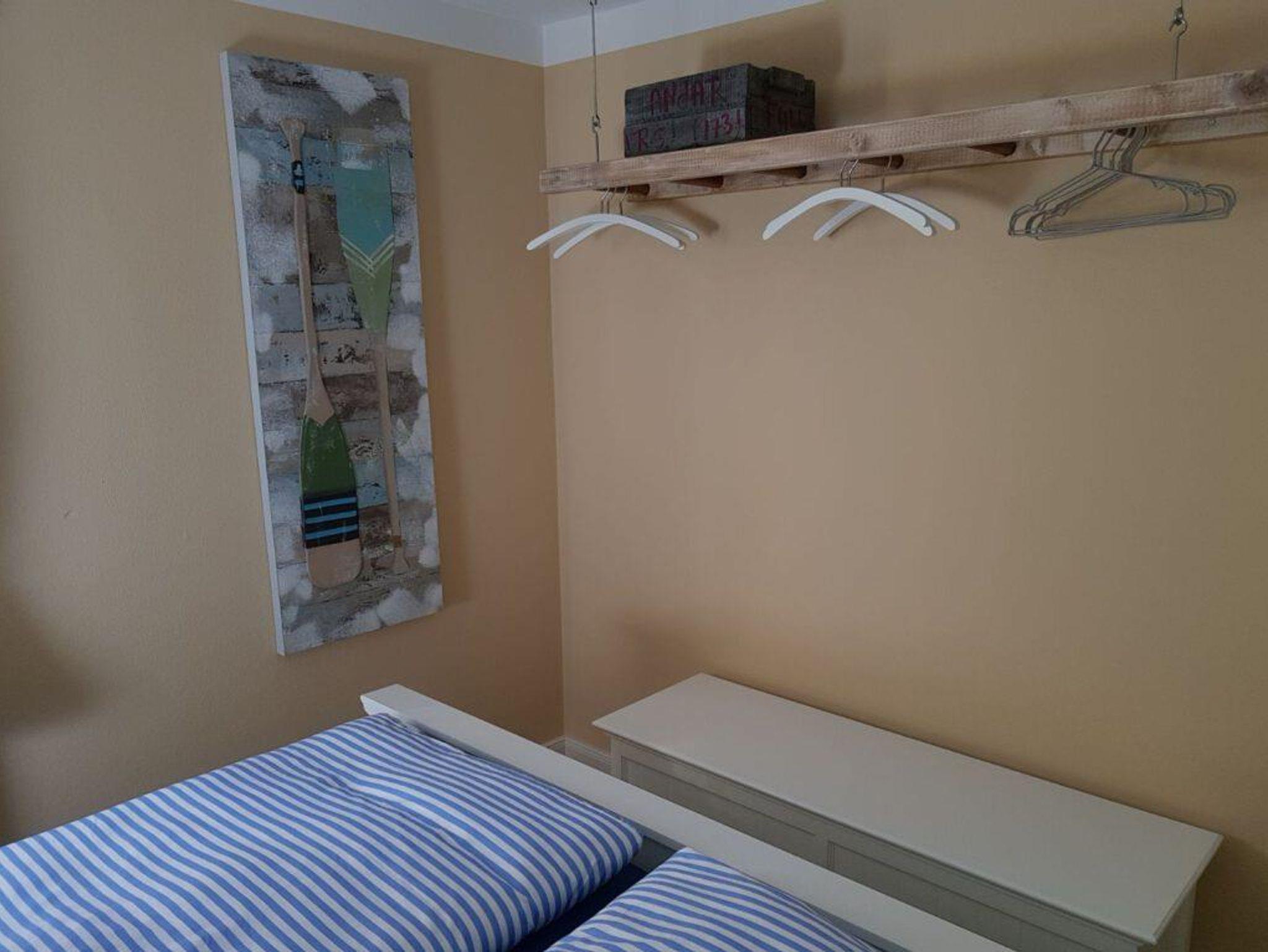 Schlafzimmer mit Doppelbett, moderne Kleideraufhängung, Regal, bezogene Betten bei Anreise.
