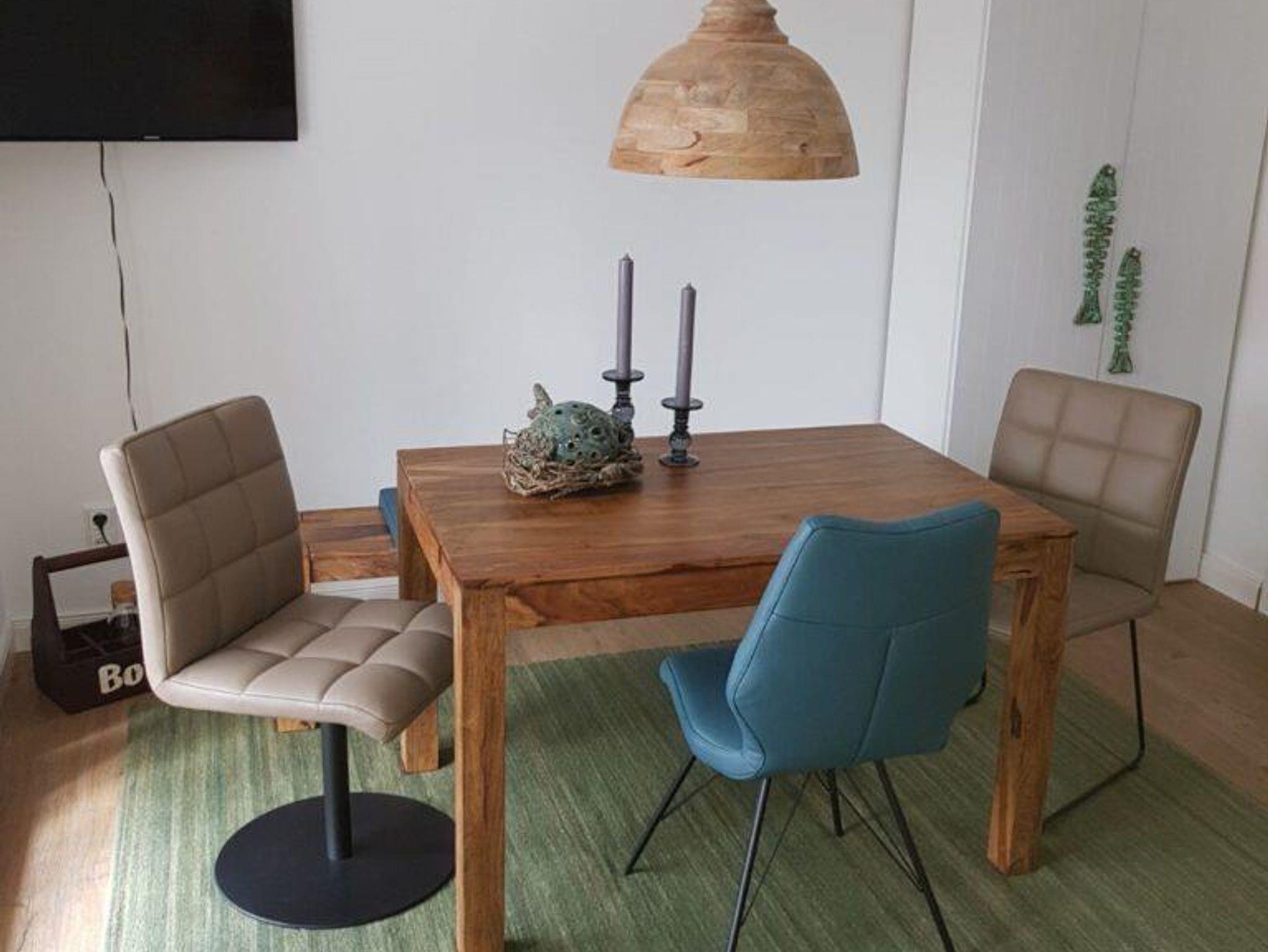 Helles Wohnzimmer mit Sofa, Designer-Sessel, Essbereich, TV, WLAN.