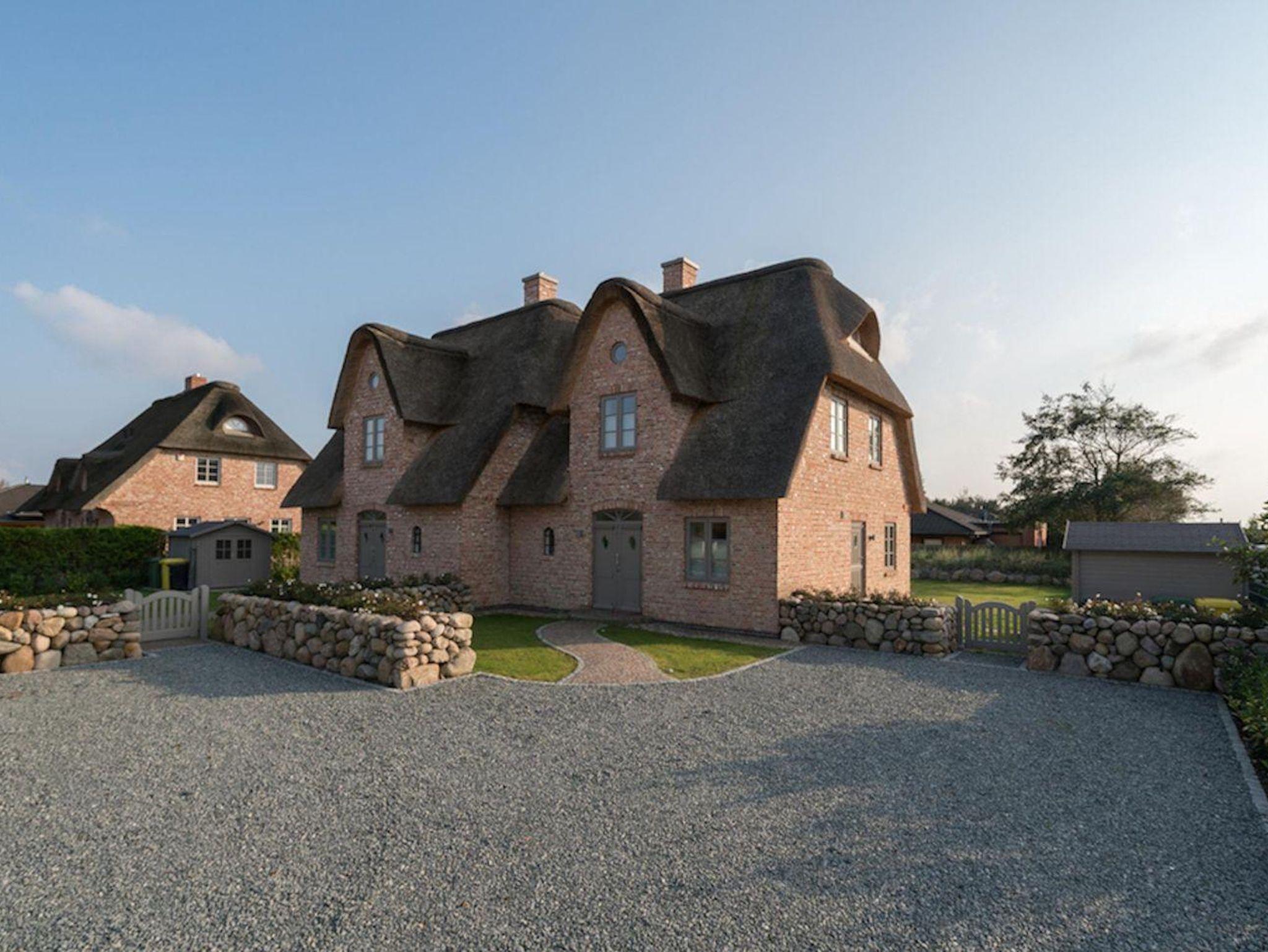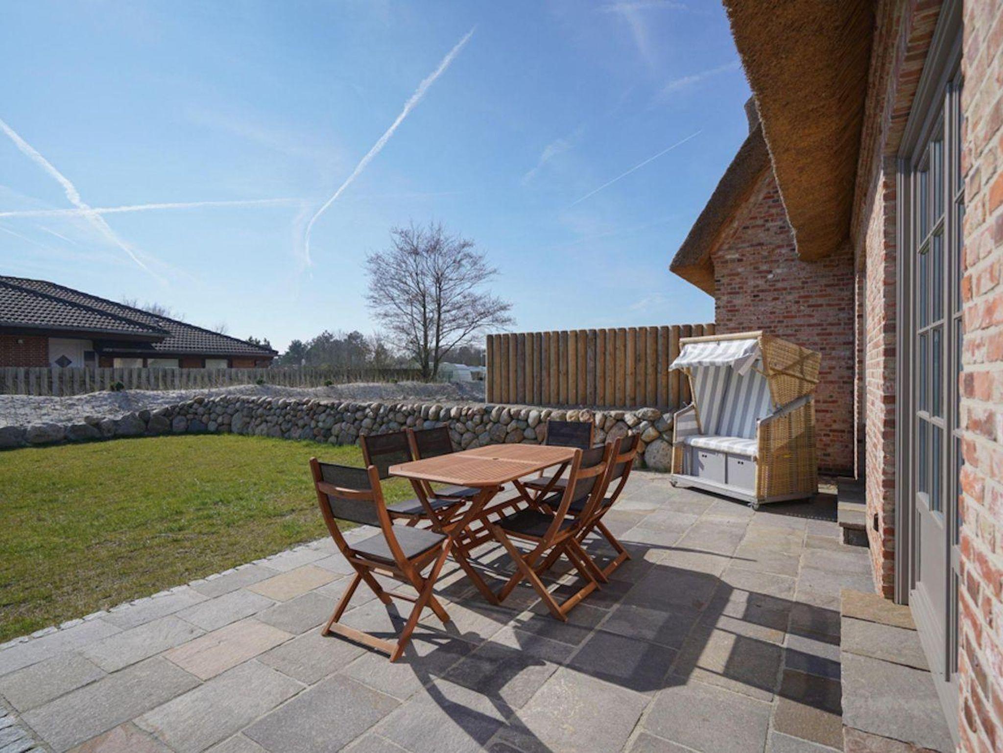 Luxuriöses Reetdachhaus in St. Peter-Ording mit Sauna, Terrasse und Strandkorb für erholsame Urlaubstage.
