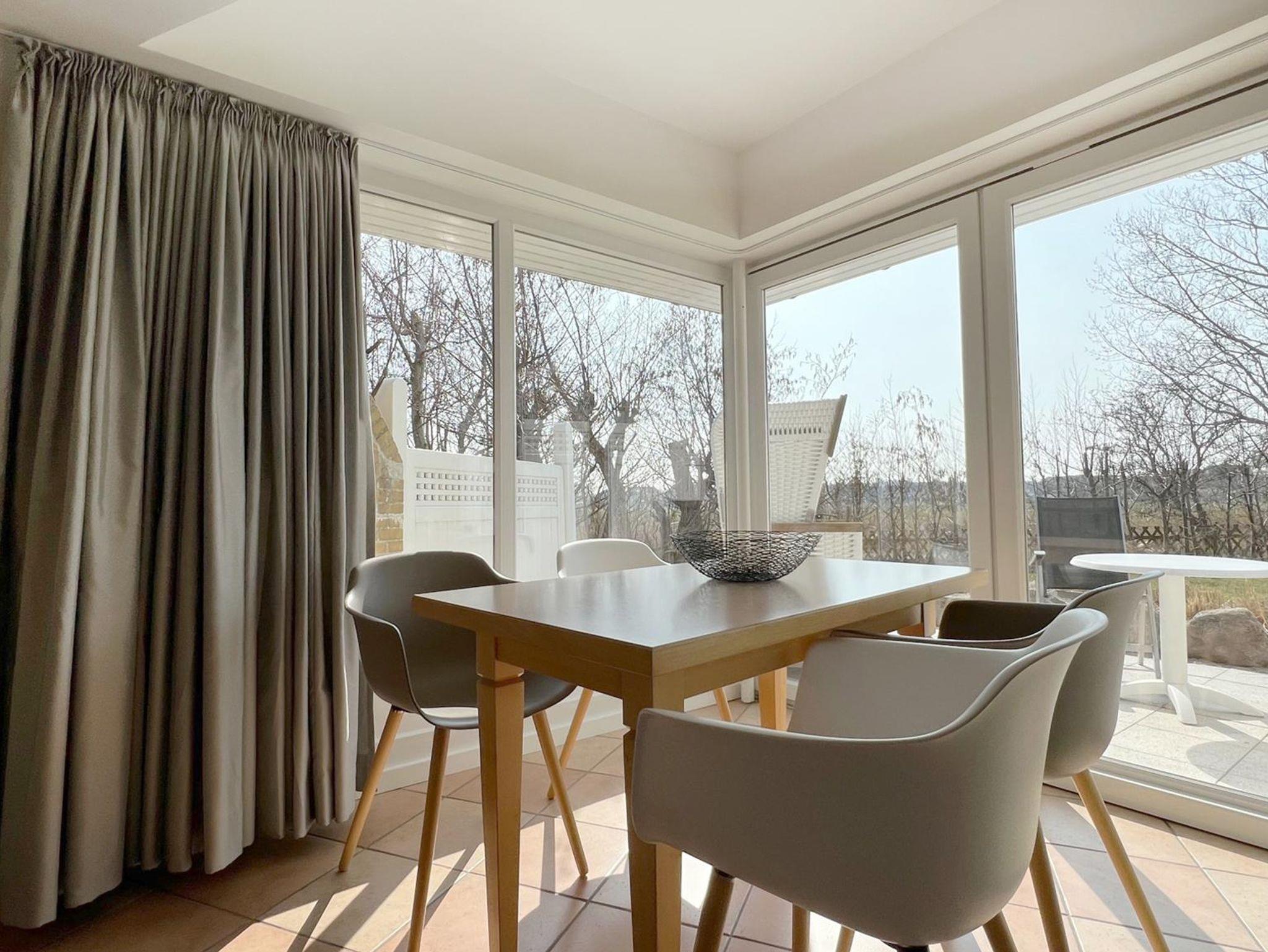 Im Erdgeschoss befindet sich die Eingangsdiele mit einer gradläufigen Treppe nach oben zu den beiden Schlafzimmern.1 Schlafraum mit Doppelbett 180x200cm mit getrennten Matratzen, ein Schlafraum mit 2 Einzelbetten (90x200cm). Das Zustellen eines Kinderreisebettes oder Hochstuhles ist kein Problem. Abgehend von der Eingangsdiele, der Wohn-Essraum mit voll ausgestatteter Küchenzeile, gemütlicher Sitzecke und Essecke im raumhoch verglasten Wintergarten, direkter Zugang zu einer, mit einer kleinen Sanddüne eingefassten Terrasse und Garten. Das Duschbad ist komplett neu in 2018, ausgestattet mit begehbarer Dusche, WC, Waschbecken und Außenfenster.