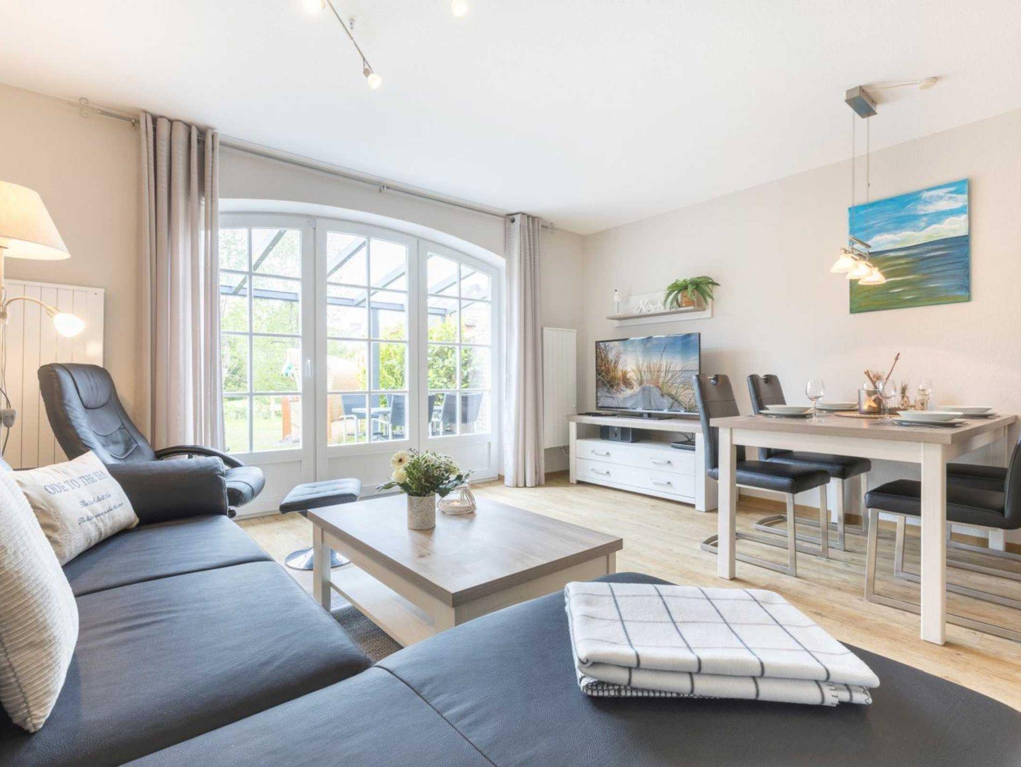 Modernes und elegantes Wohnzimmer mit Lederecksofa, Ruhesessel, TV (Sat) und Esstisch mit 4 Stühlen. Direkter Zugang zur möblierten und überdachten Gartenterrasse nach Westen mit Grillmöglichkeit. Offene Küche mit Backofen, Geschirrspüler und Kühlschrank mit Gefrierfach.