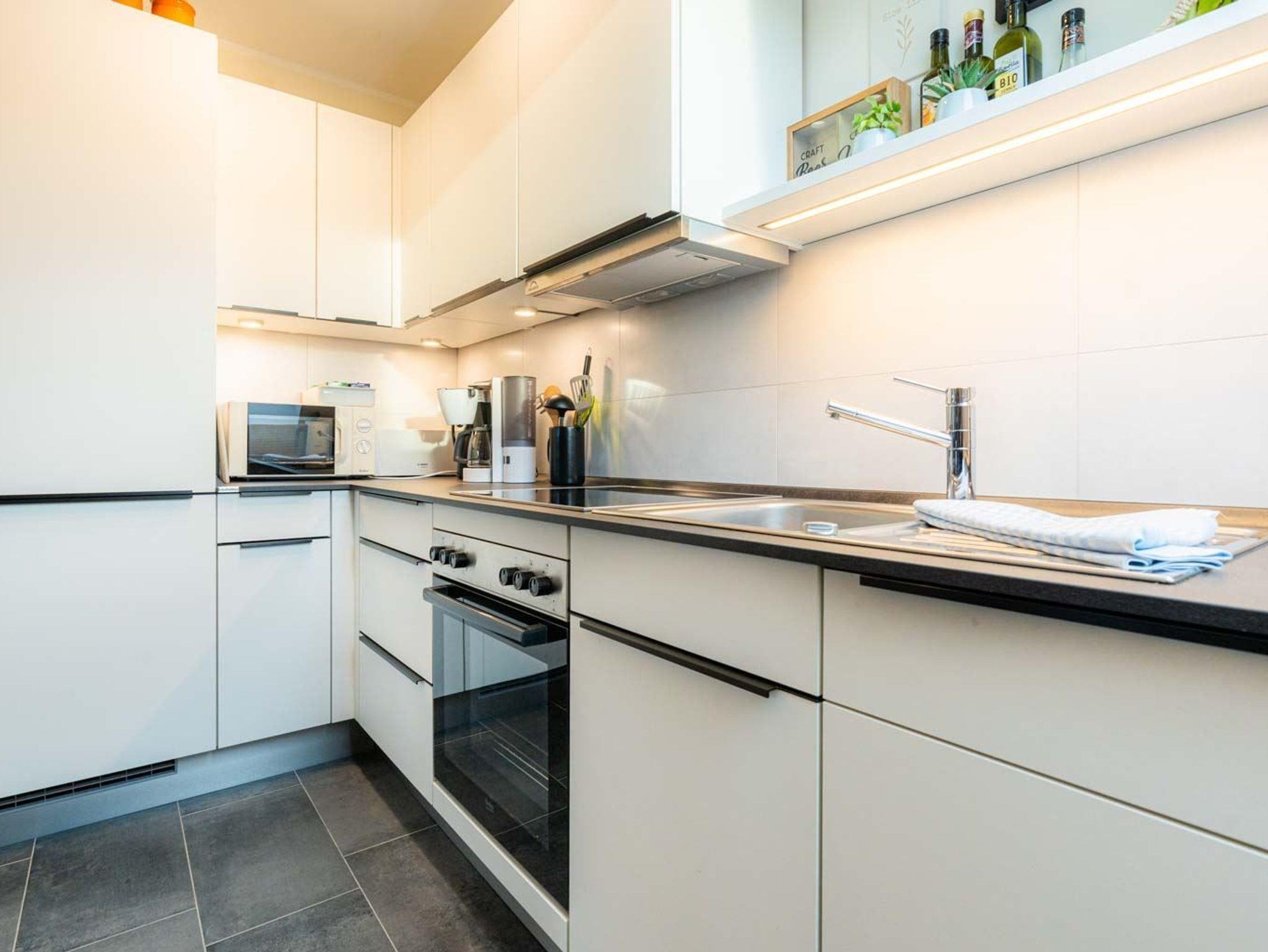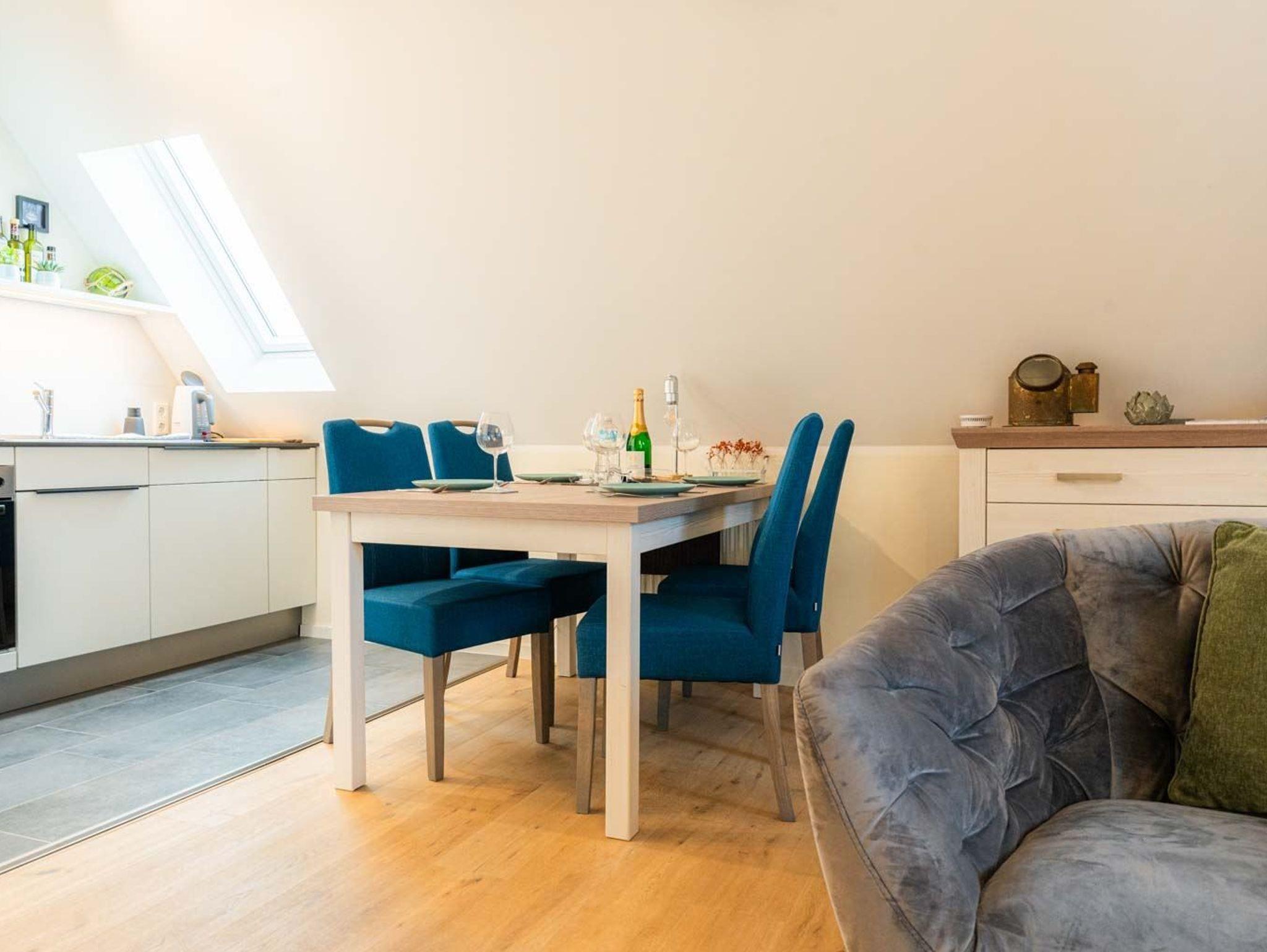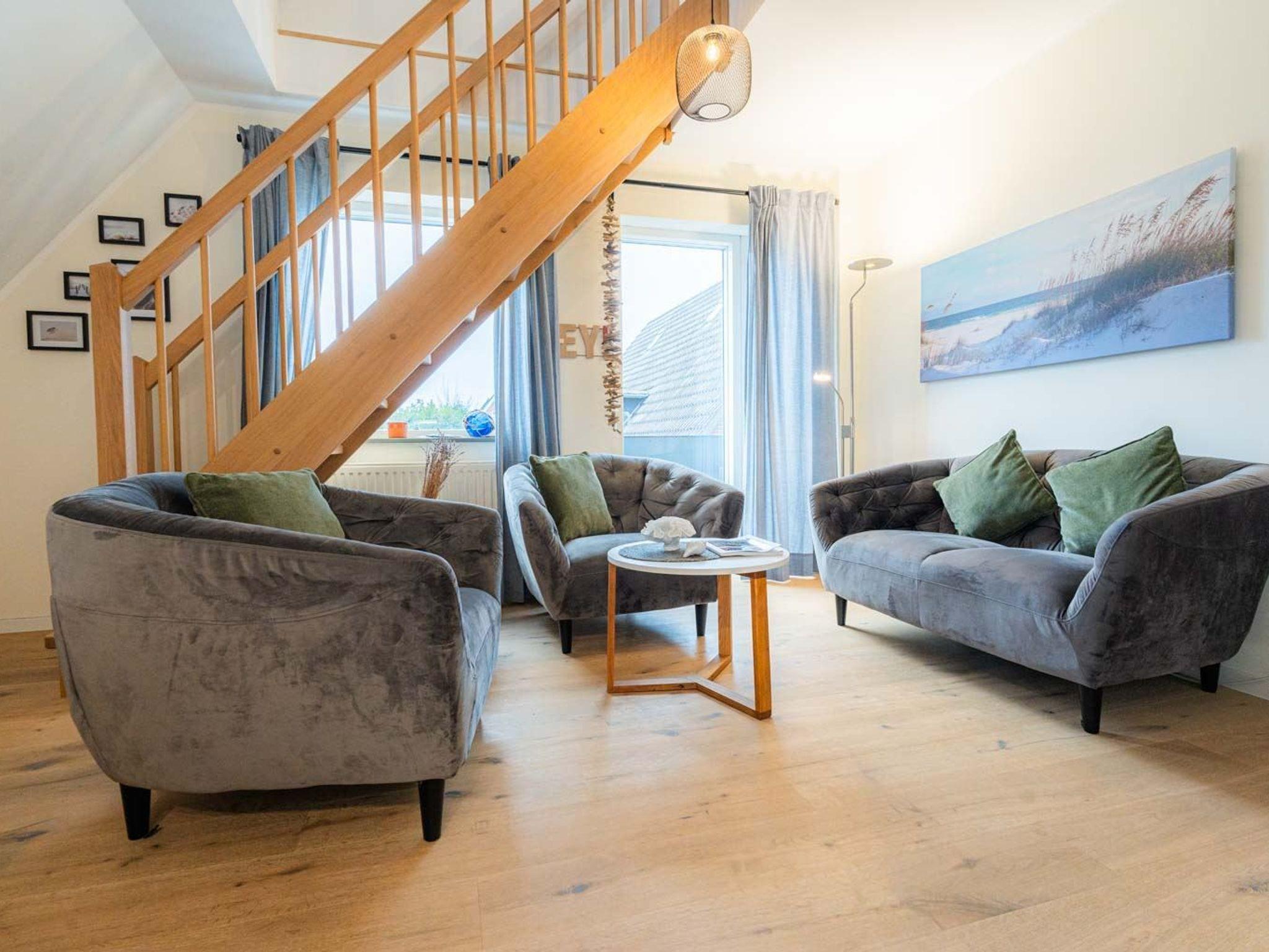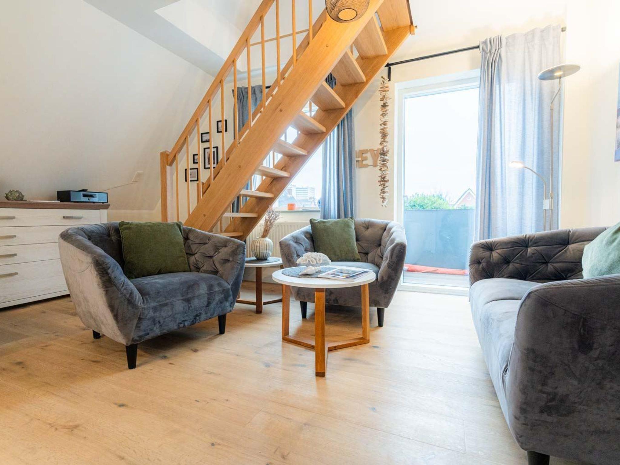 Wohnzimmer mit Sofa für 2 Personen, 2 Sesseln, SMART-TV (waipu), Bluetooth-Soundanlage und Esstisch mit 4 Stühlen. Direkter Zugang zum möblierten Balkon nach Westen. Offene Küche mit Backofen, Mikrowelle, Geschirrspüler und Kühl-Gefrier-Kombination. Vom Wohnzimmer führt eine Treppe zum 2. Schlafzimmer.