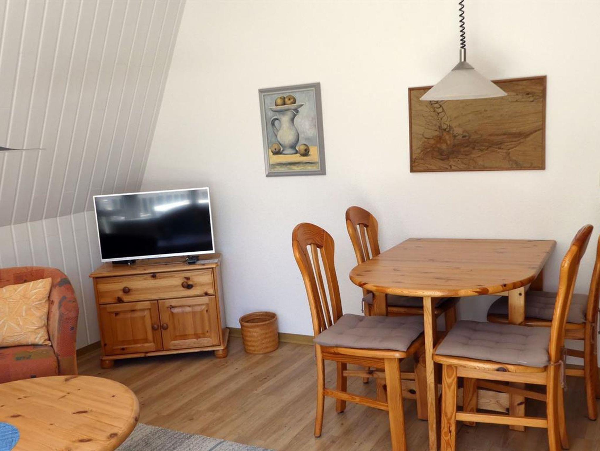 Wohnzimmer: Sofa , 2 Sessel, TV (Kabel), Radio, CD-Player und Esstisch für 4 Personen. Der nach Süden ausgerichtete Balkon ist möbliert und vom Wohnzimmer aus begehbar.