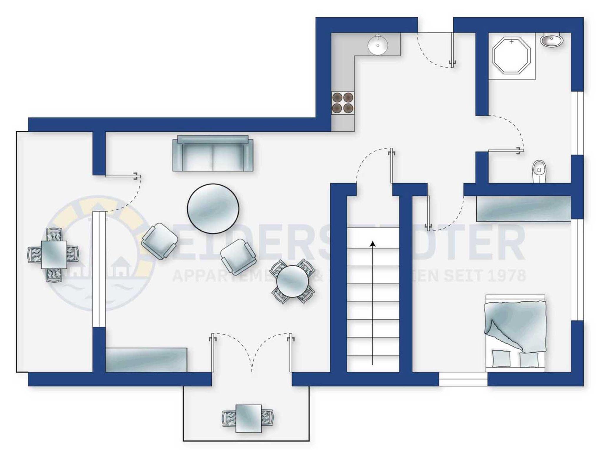 Freundliche 3-Zimmer-Ferienwohnung Albatros mit ca. 65 qm auf 2 Ebenen (EG bzw. Hochparterre, UG bzw. Tiefparterre) für bis zu 4 Personen. In zentraler Lage nah zur Promenade im Ortsteil Bad in St. Peter-Ording. Die Erlebnispromenade, die Dünentherme sowie alle Geschäfte und Restaurants befinden sich in direkter Nachbarschaft und sind in wenigen Gehminuten erreichbar.