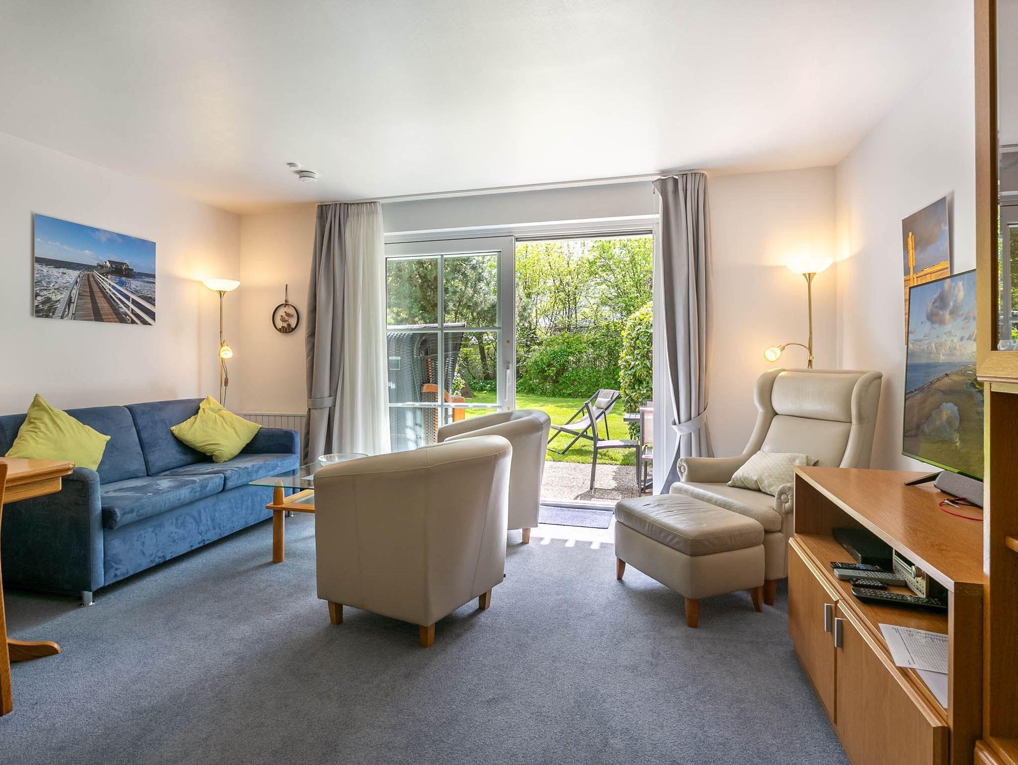 Wohnzimmer mit ausklappbarem (Schlaf-) Sofa (120x195cm), 3 Sesseln, großes SMART-TV (Kabel, 49), BluRay-Player (DVD-Sammlung vorhanden), Stereo-Kompaktanlage mit CD-Player und Esstisch mit gemütlicher Eckbank für 2-3 Personen sowie 2 Stühlen. Direkter Zugang zur möblierten Gartenterrasse nach Süd-Westen mit Strandkorb. Halboffene Küche mit Backofen, Induktionsherd, Mikrowelle, Geschirrspüler und Kühlschrank mit Gefrierfach.