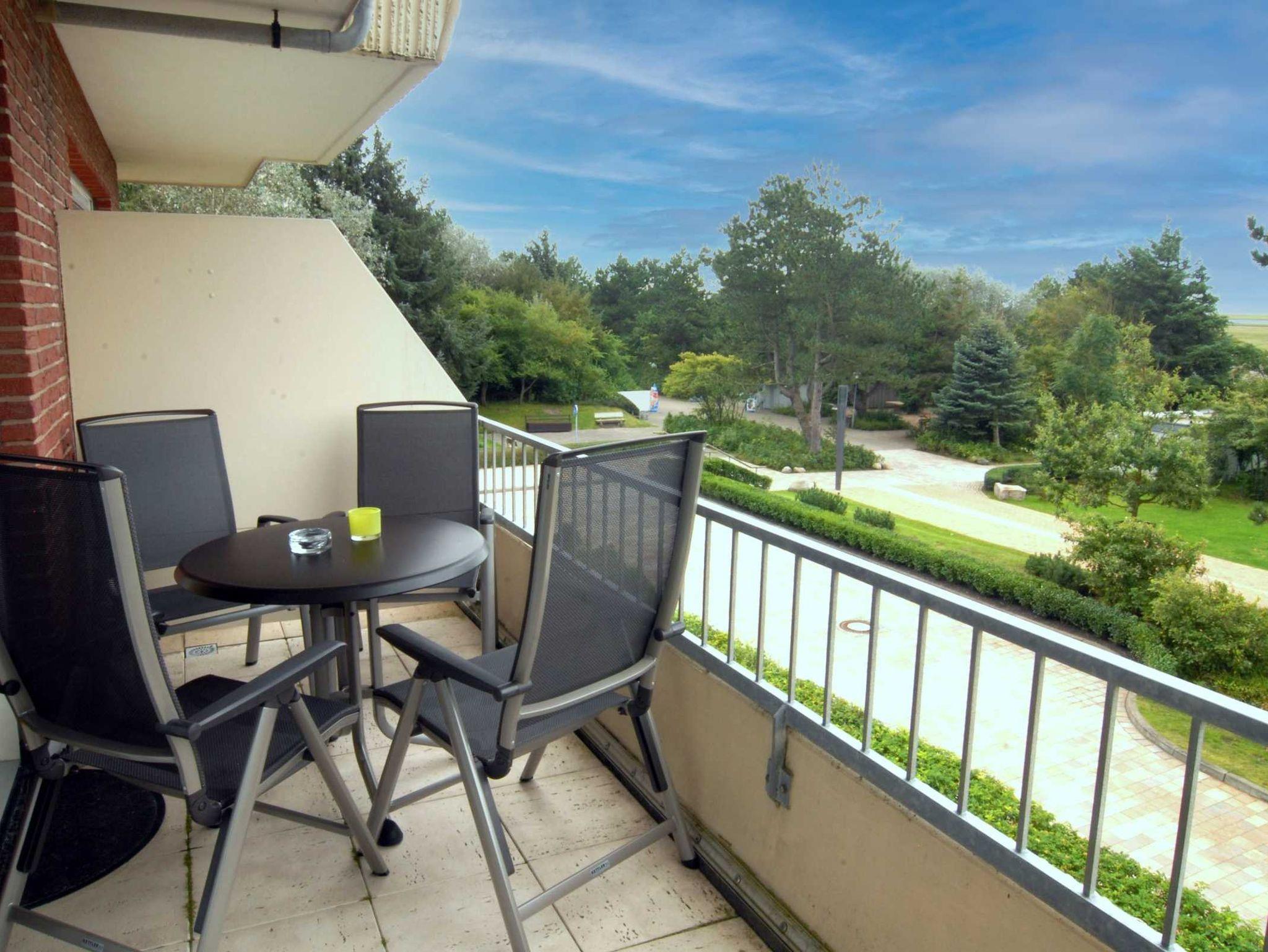 Der Süd-West-Balkon bietet durch die Bäume einen schönen Blick auf das Meer und lädt zum Entspannen in der frischen Luft ein.