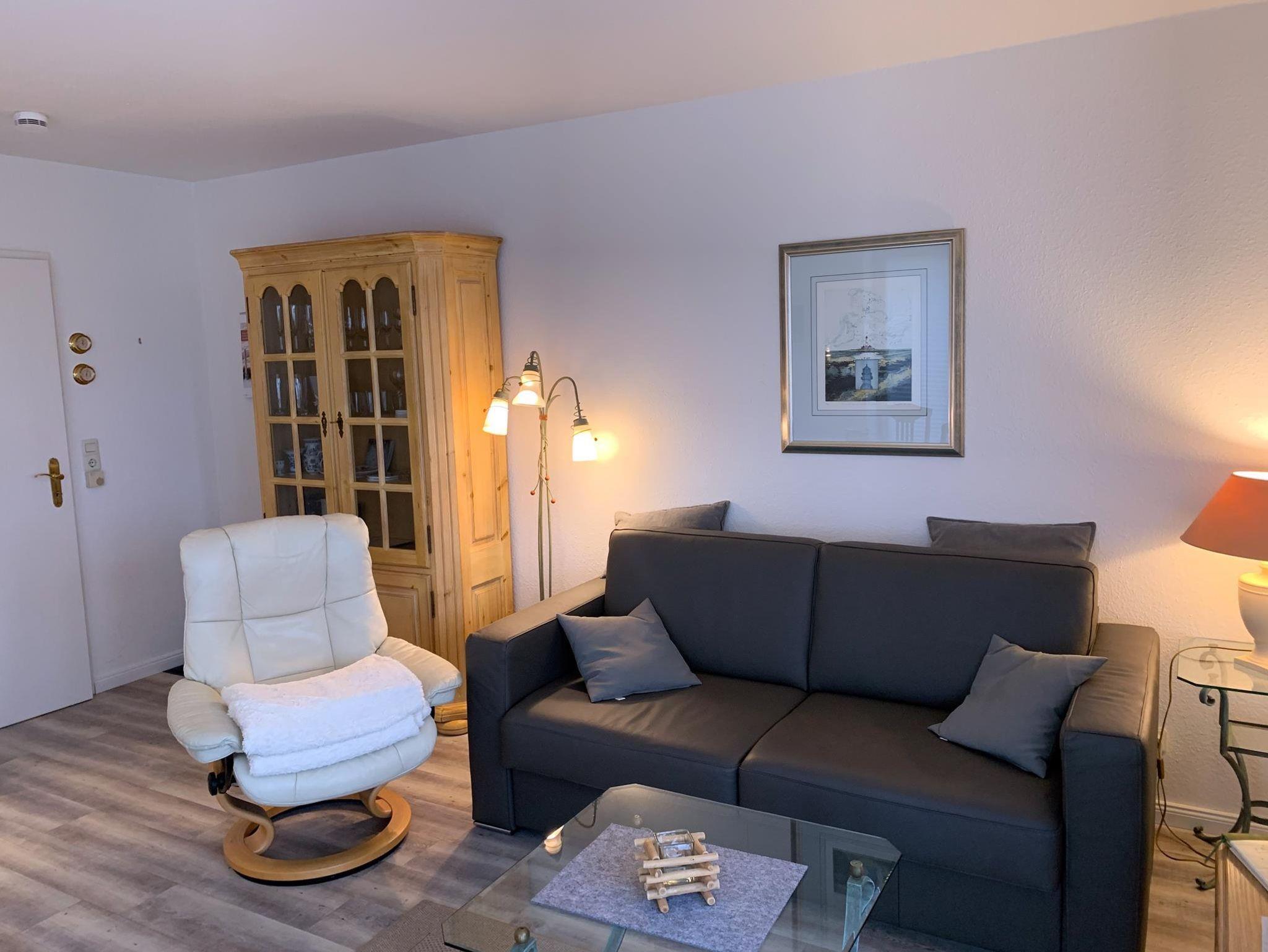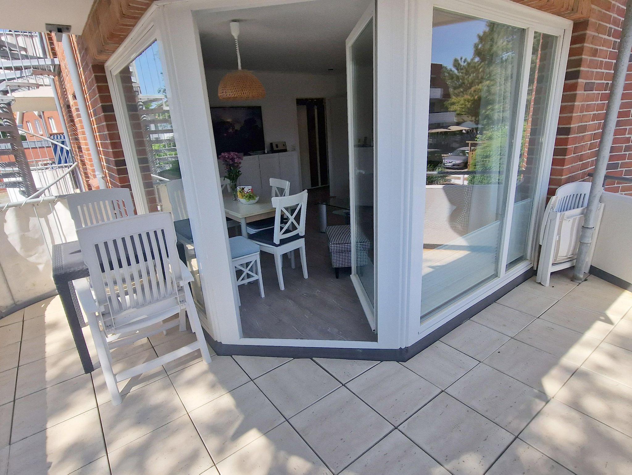 Zentrale Ferienwohnung in St. Peter-Ording mit Meerblick, Balkon und Strandkorb nur 200 m vom Deich entfernt.