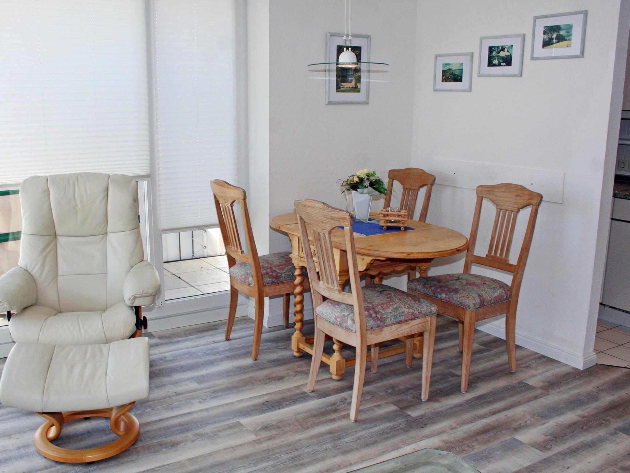 WohnzimmerSchlafcouch, Couchtisch, Tischlampe, Nachtspeicherofen, Esstisch, 4 Stühle, TV-Tisch, Kabel-TV, Stereoanlage mit CD-Player, Vitrinenschrank,