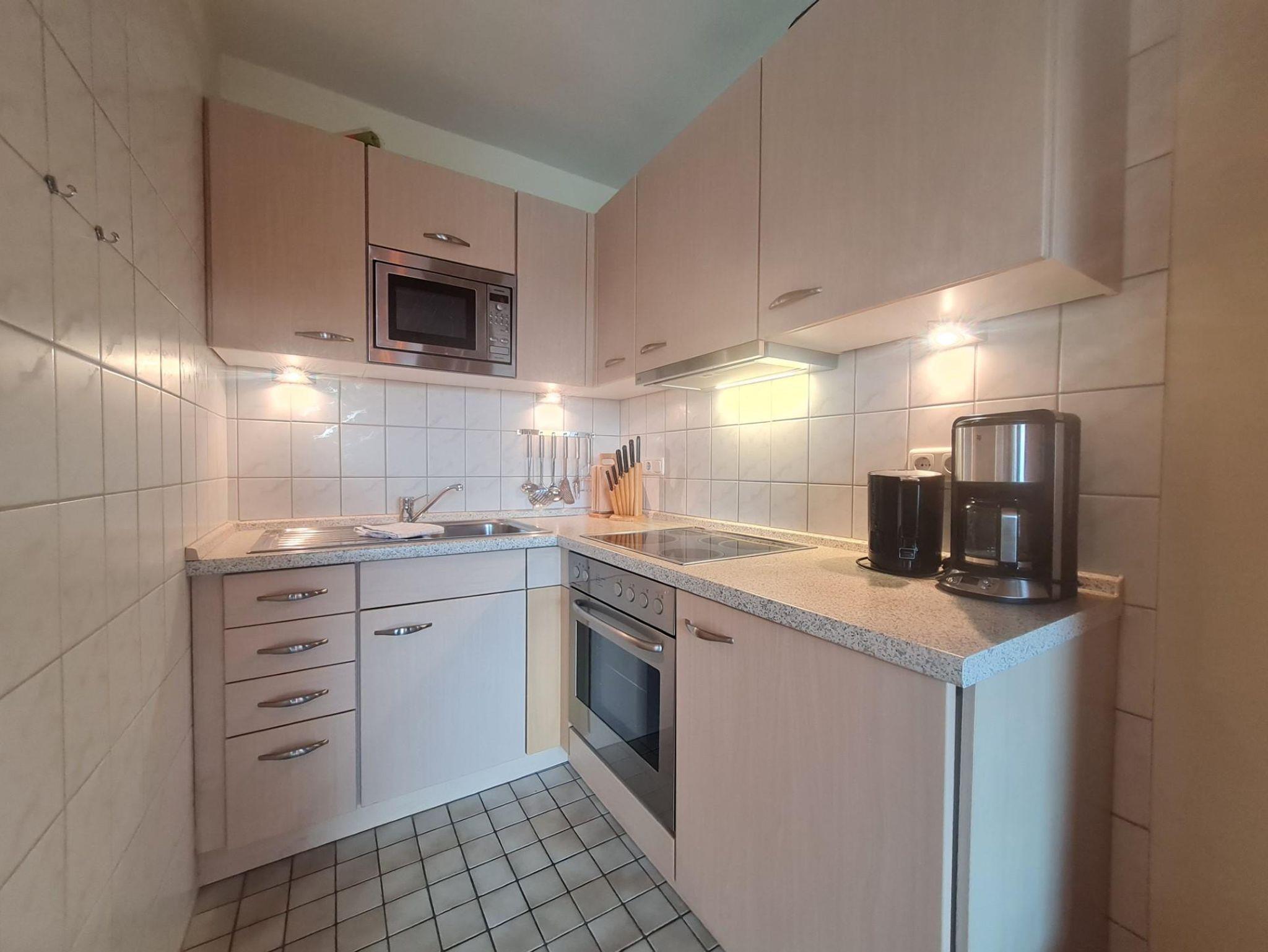 Die gut ausgestattete Küchenzeile verfügt über ein Cerankochfeld, Backofen, Kaffeemaschine, Toaster und weitere praktische Küchenutensilien – ideal für die Selbstverpflegung.