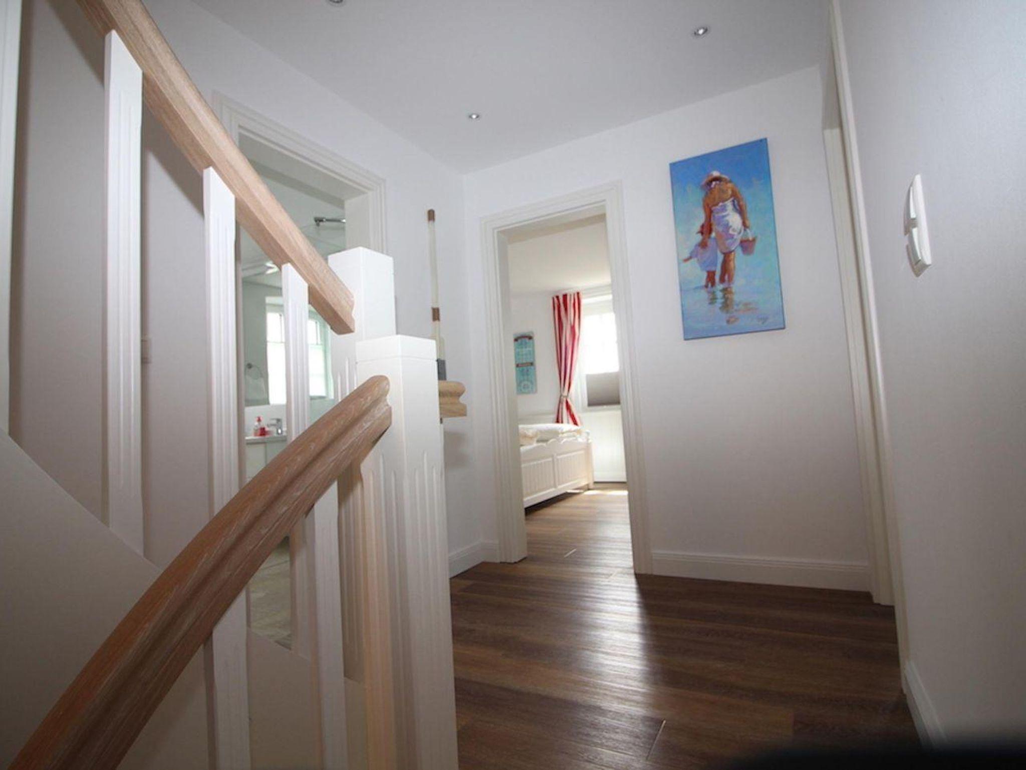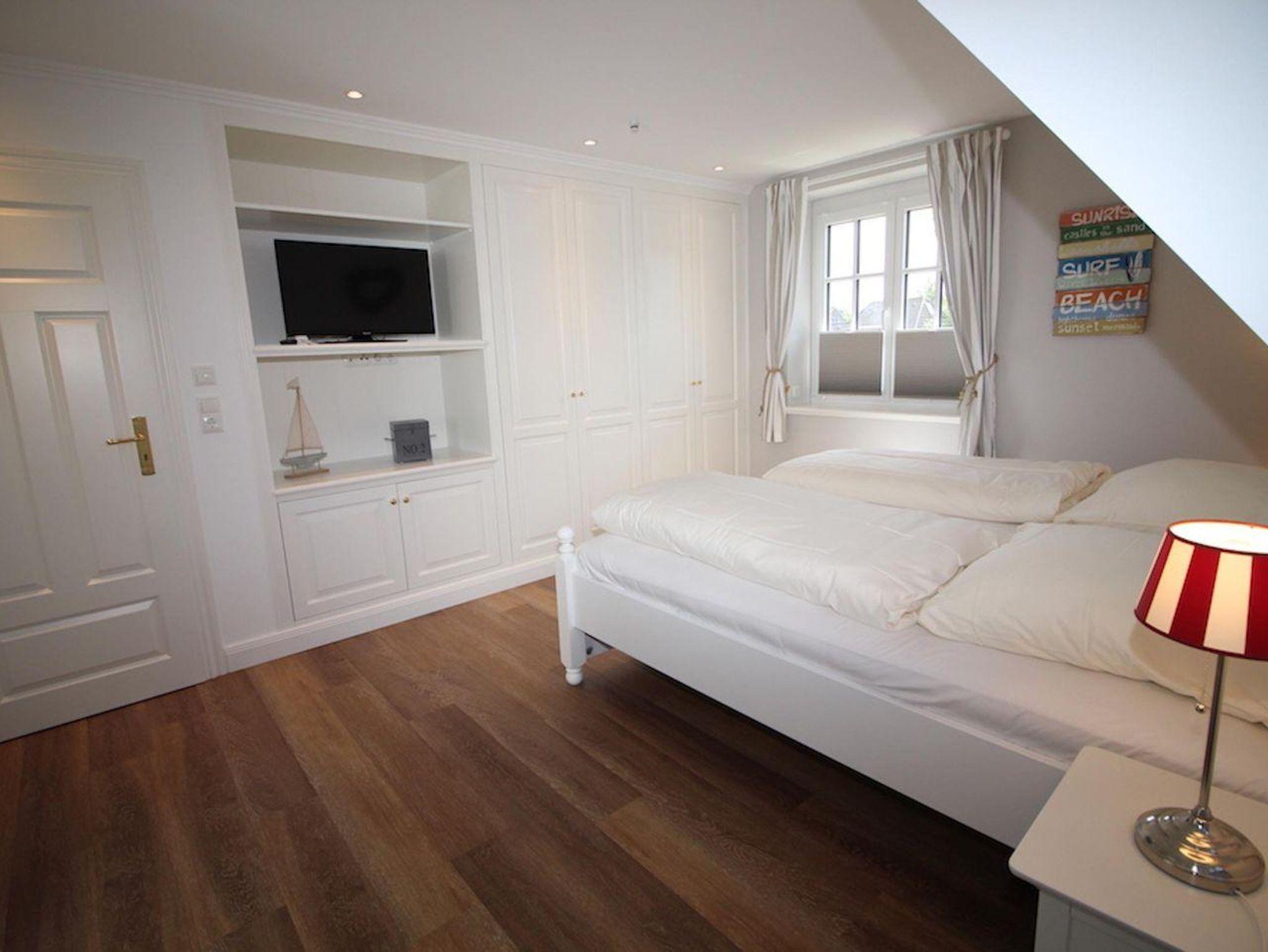 Über eine Holztreppe gelangt man in das mit Parkett ausgelegte Obergeschoss. Dieses verfügt ebenfalls über eine Fußbodenheizung. Die beiden Schlafzimmer, jeweils mit einem Doppelbett, sind ebenfalls mit TV ausgestattet. Einbauschränke gewähren Ihnen hinreichend Ablageflächen. Darüber hinaus befinden sich im Obergeschoss zwei weitere, geräumige Bäder mit Dusche. Für zusätzliche Entspannung sorgt eine Sauna mit Sternenhimmel.