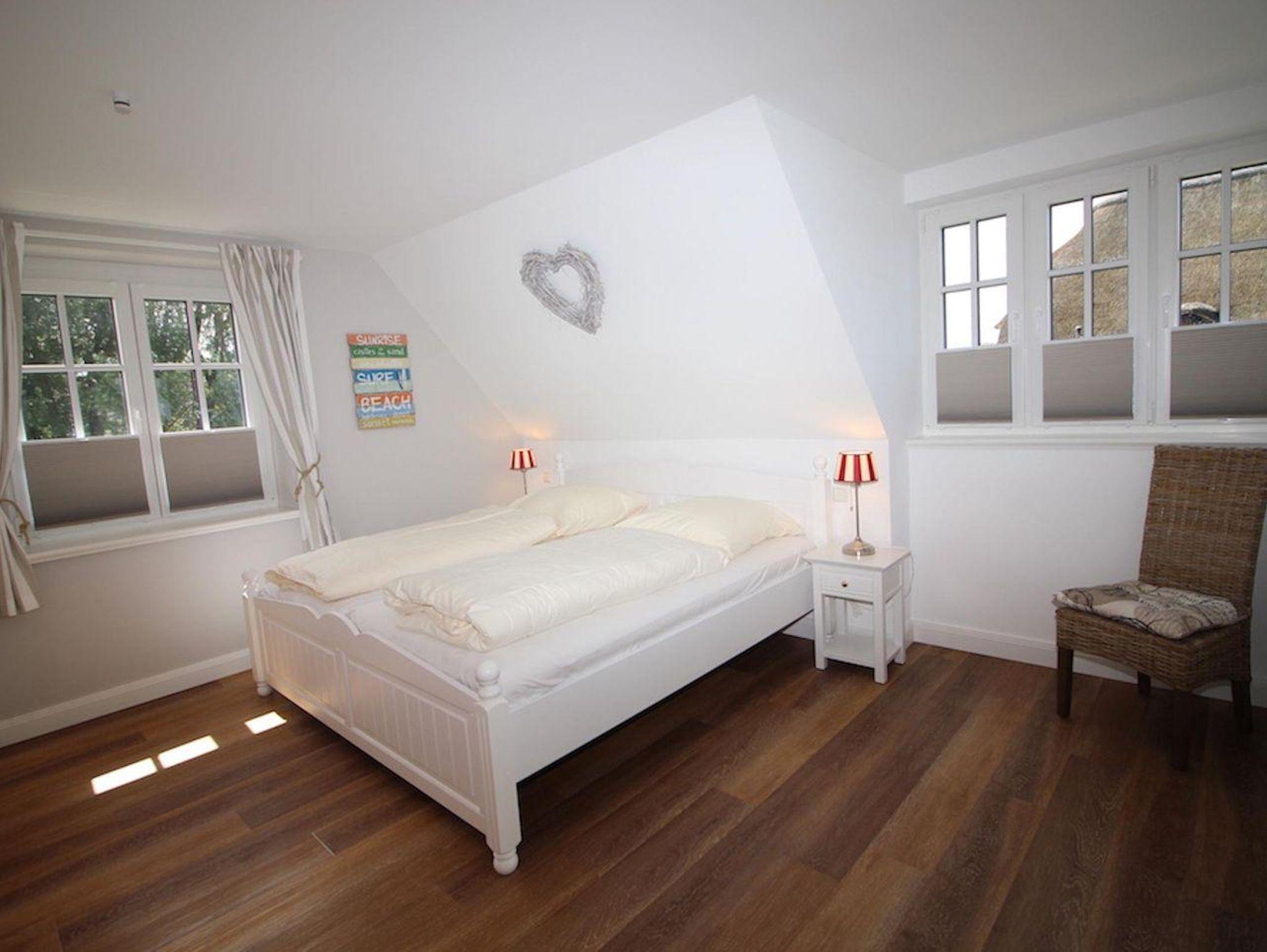 Vom Obergeschoss führt die Holztreppe hinauf in das Dachgeschoss. Ein drittes Schlafzimmer mit Doppelbett, Sofalonge und großen Fenstern mit Blick bis zum Wasser erfüllt jeden Urlaubstraum.