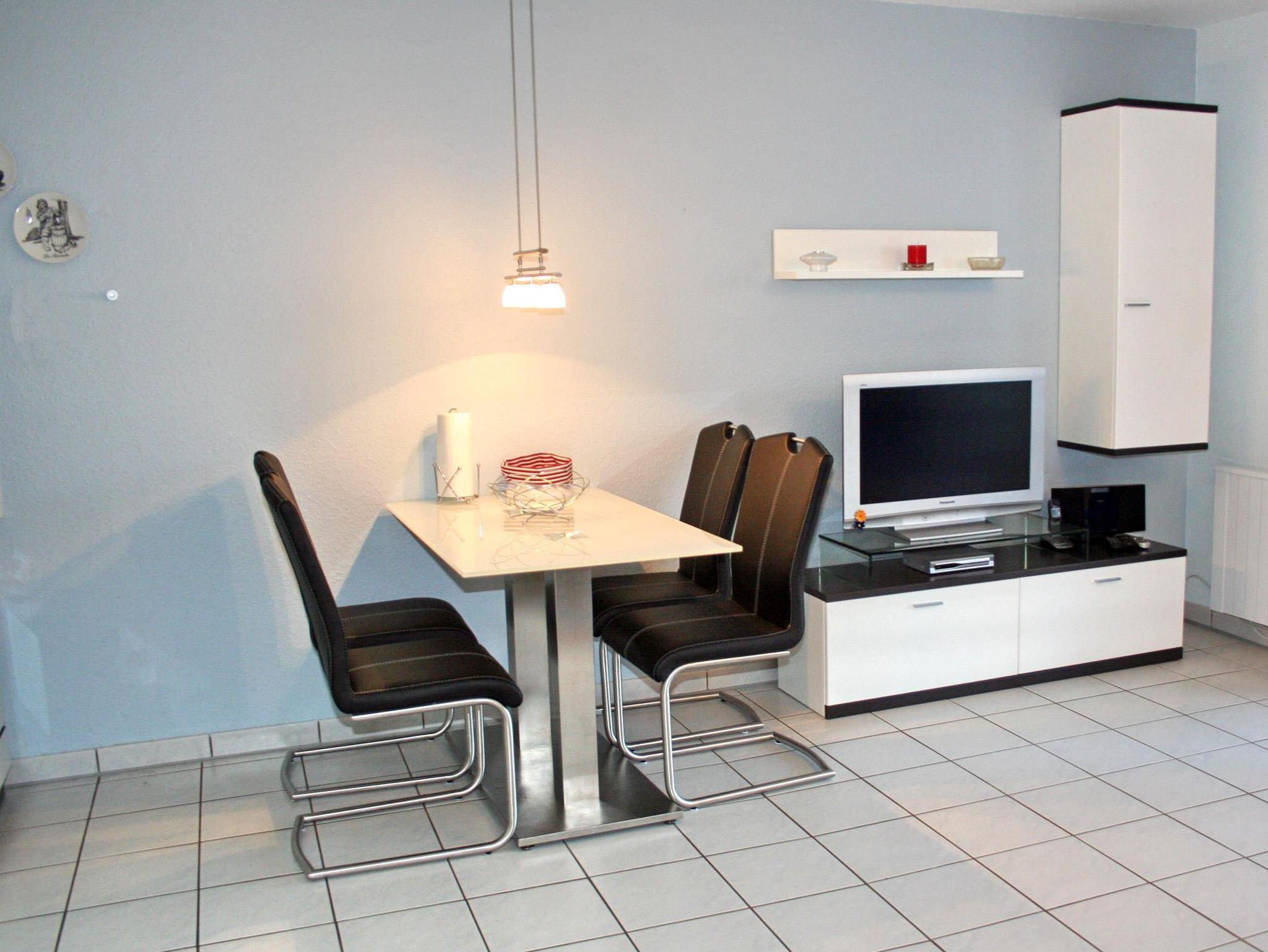 WohnzimmerEckschlafcouch, Couchtisch, Sessel, Hocker, Stehlampe, Anrichte, Flachbildschirm, DVD-Player, Sat-TV, Telefon, Schrank, Stereoanlage mit CD-Player, Esstisch, 4 Stühle, Küchenzeile, 4 Plattenherd mit Backofen, Dunstabzugshaube, Kühlschrank, Spülmaschine, Mikrowelle, Kaffeemaschine, Wasserkocher, Eierkocher, Bügeleisen, Toaster, Geschirr, Kochtöpfe