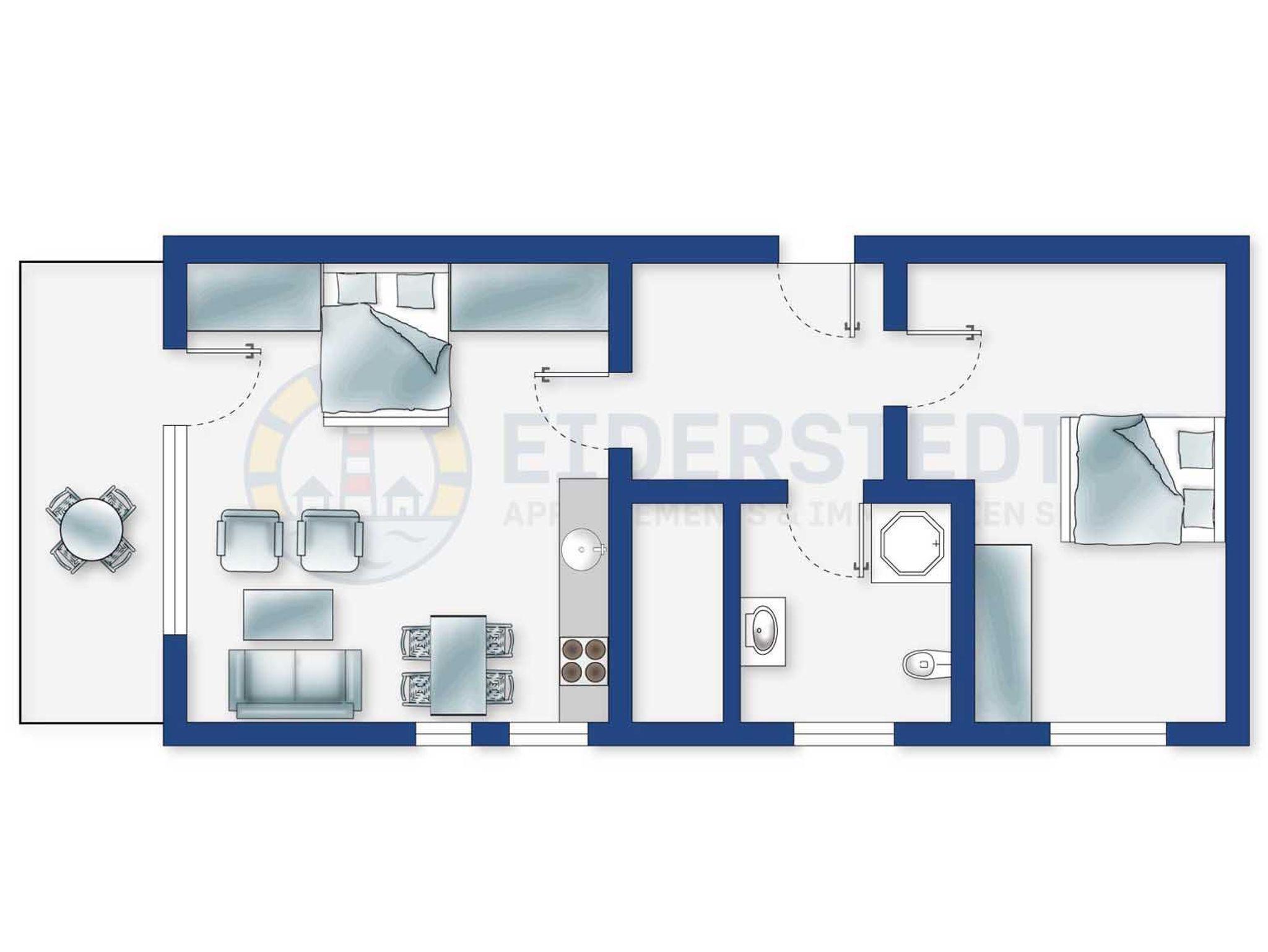 Gemütliche 2-Zimmer-Ferienwohnung im Haus Dünenblick mit ca. 47 qm auf 1 Ebene (OG) für bis zu 4 Personen. In ruhiger Lage im Ortsteil Dorf in St. Peter-Ording. Der Deich und der Strand sind in wenigen Gehminuten erreichbar.