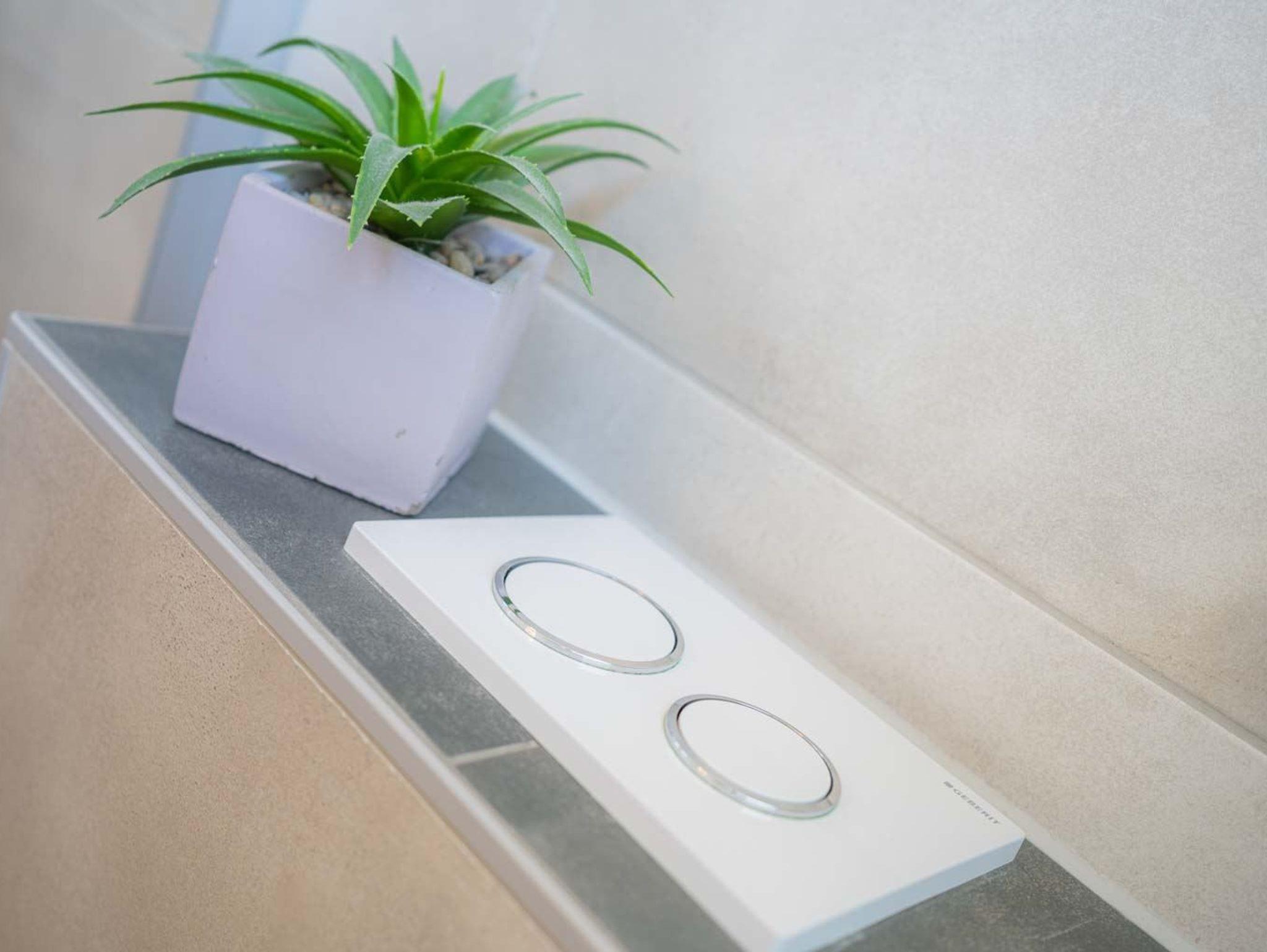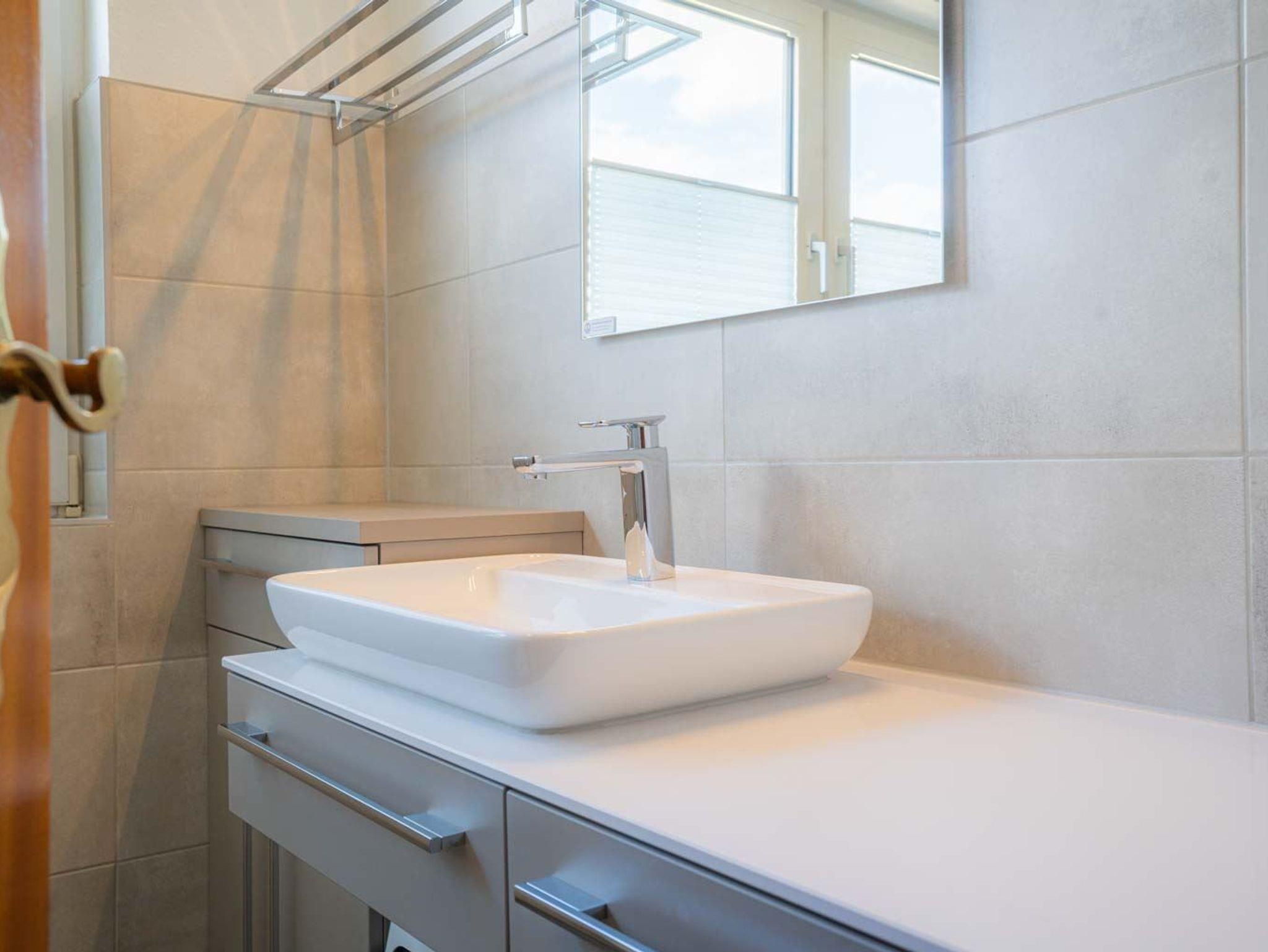 Badezimmer (Duschbad) mit Dusche (niedriger Einstieg), WC und Tageslicht. Kein Föhn.