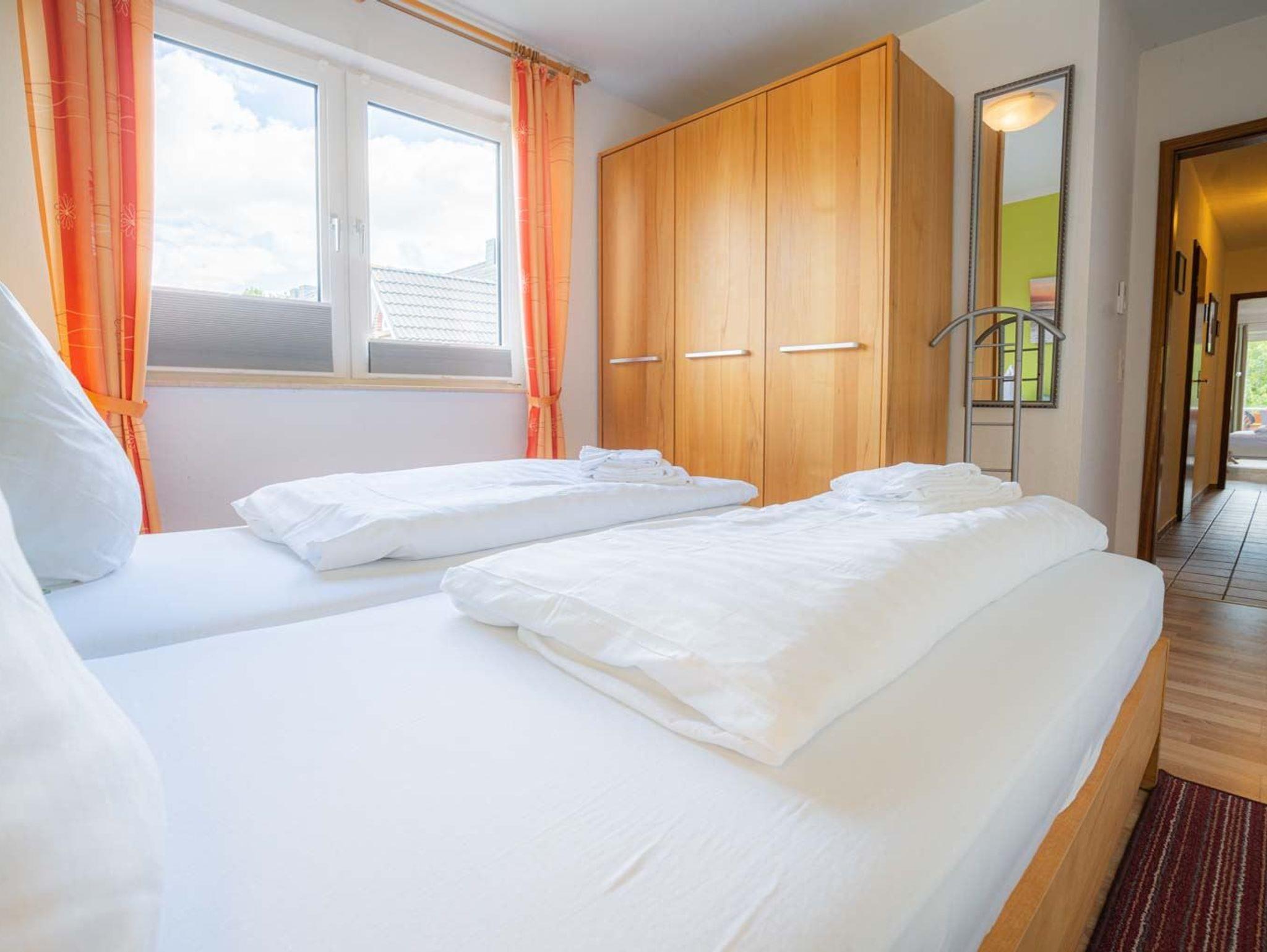 Schlafzimmer mit Doppelbett (2x90x200cm), Kleiderschrank und Stuhl.