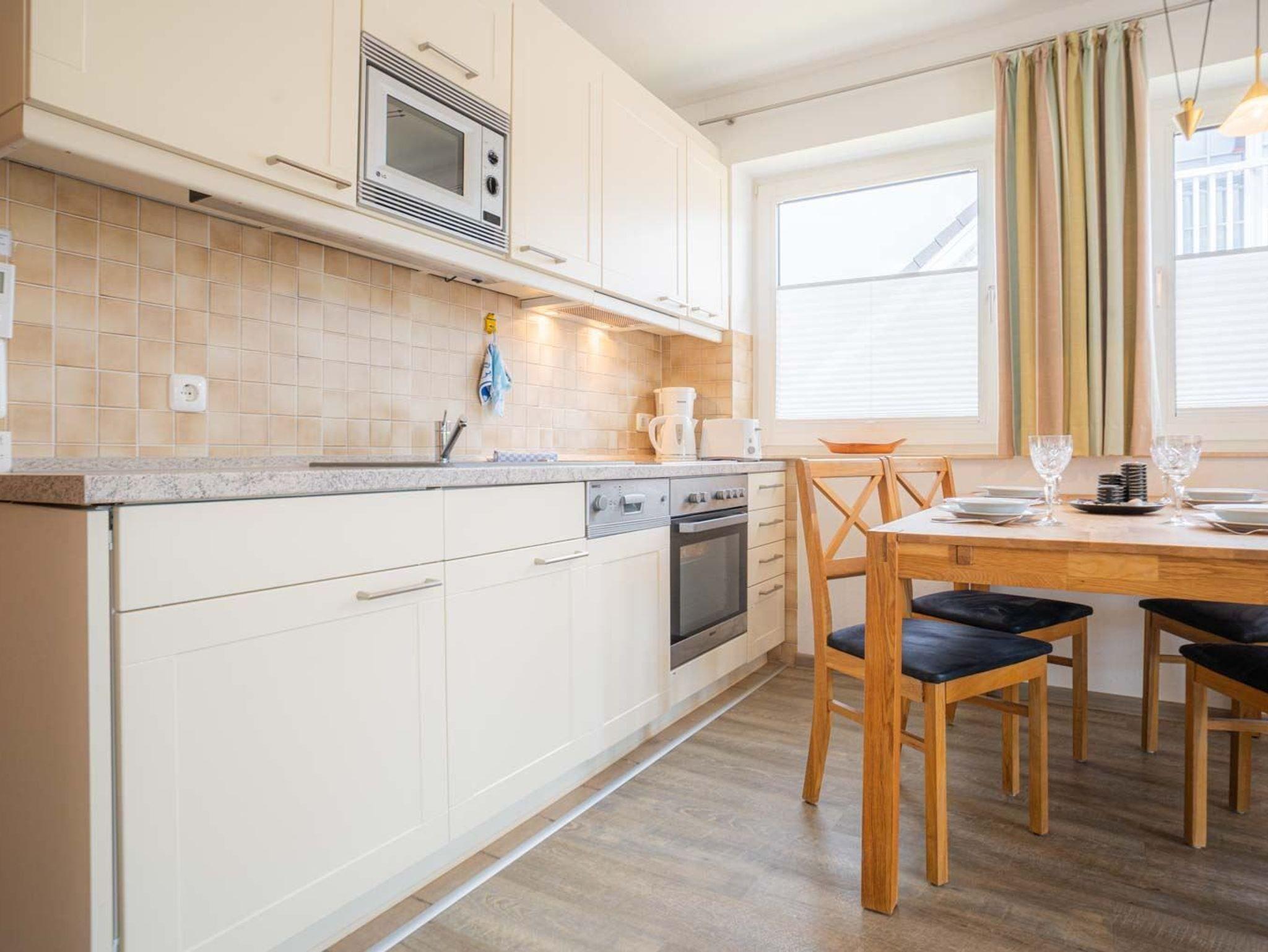 Wohn-/Schlafzimmer mit ausklappbarem Schrank-Doppelbett (2x 70x190cm), Sofa (2er), Sessel, TV (Sat), Radio mit CD-Player und Esstisch für 4 Personen. Direkter Zugang zum möblierten Balkon nach Südosten. Offene Küche mit Backofen, Mikrowelle, Geschirrspüler und Kühlschrank mit Eisfach.