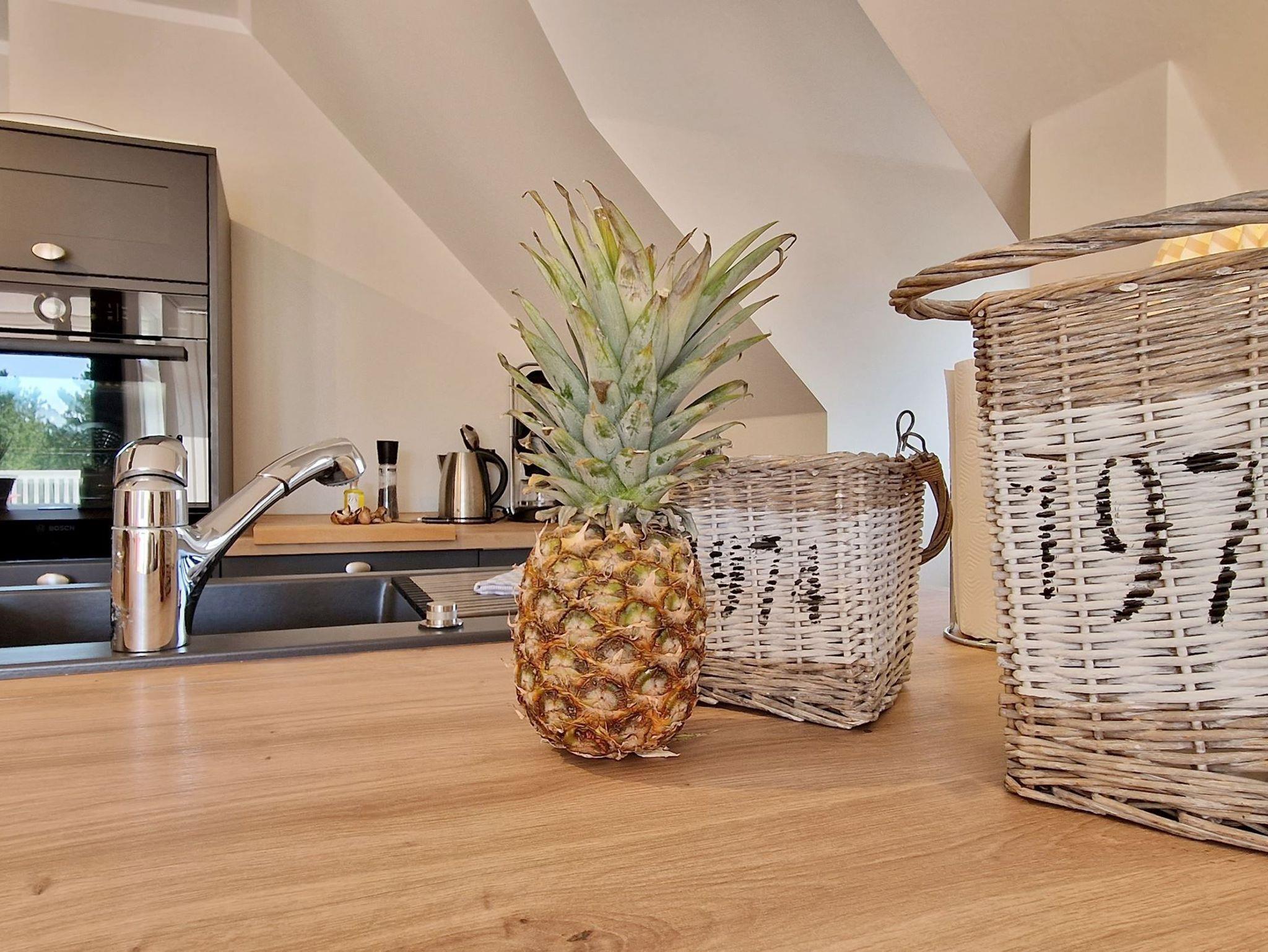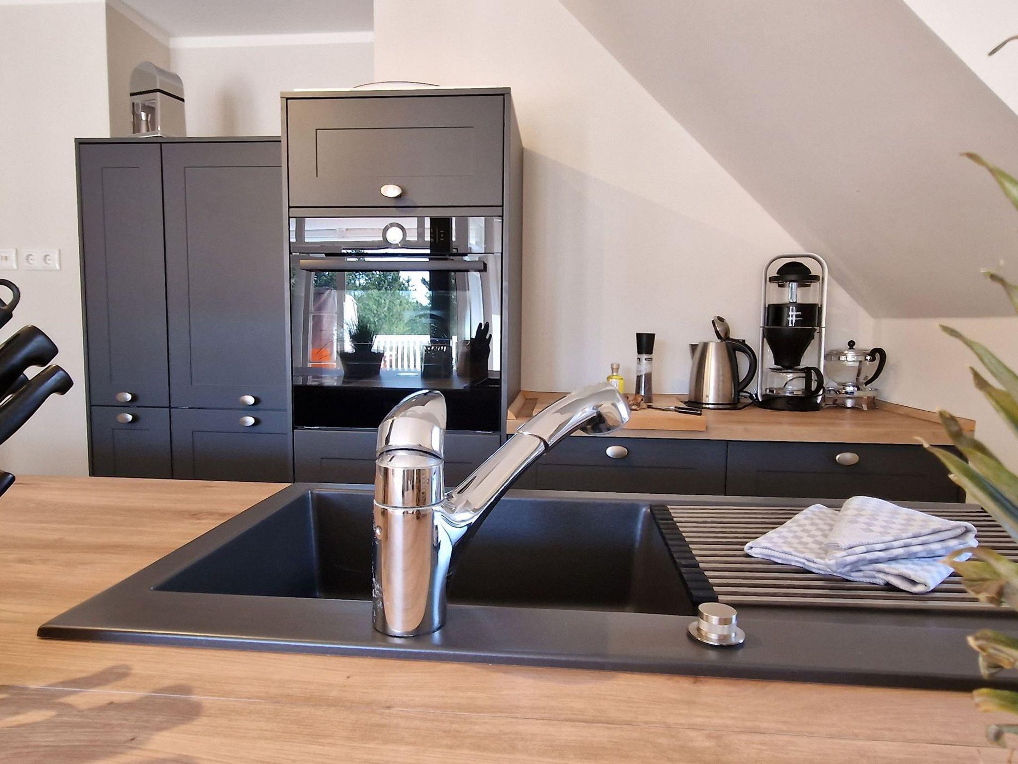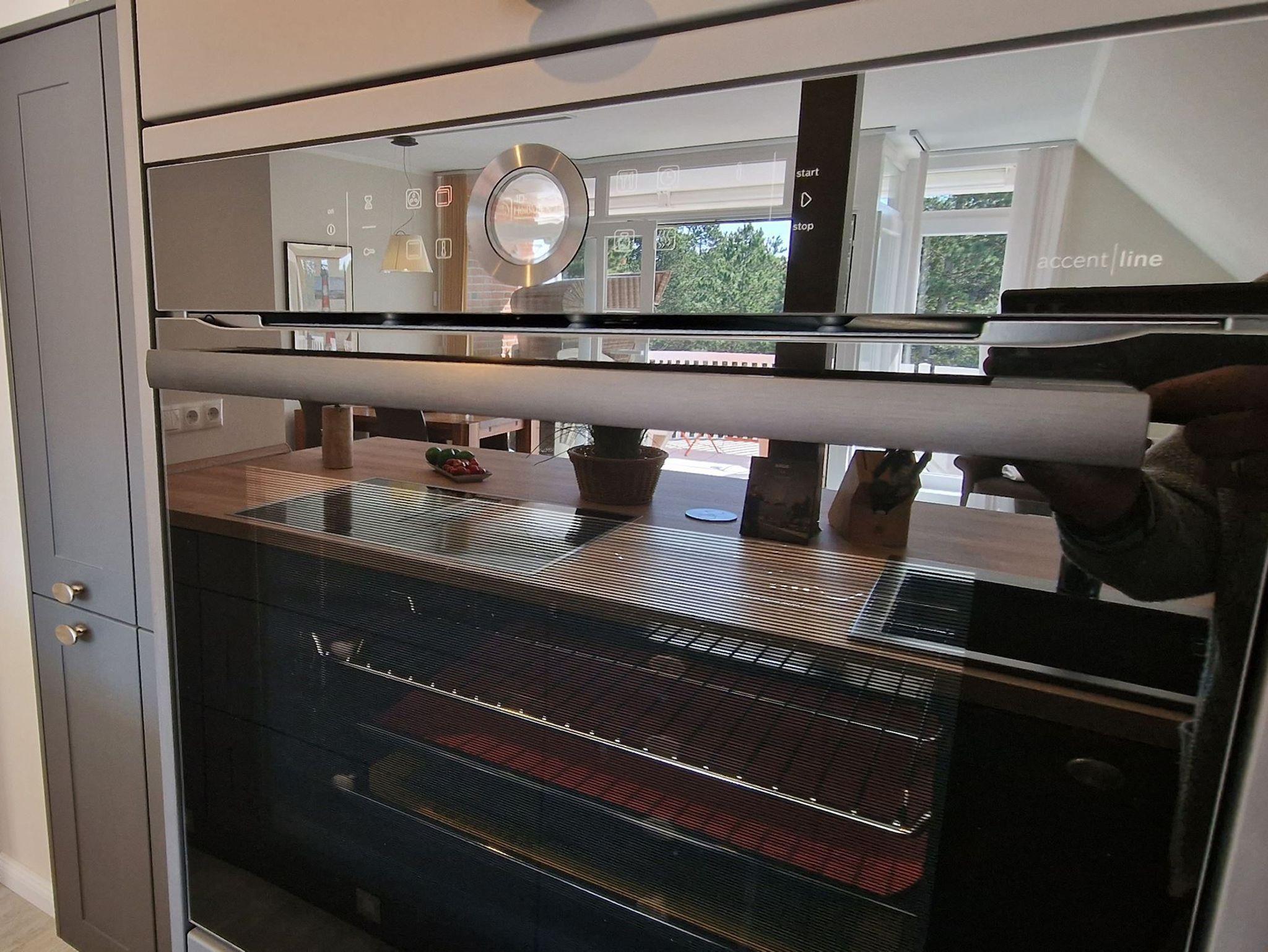 Hochwertige Ausstattung mit großer Arbeitsplatte, Apothekerschrank, modernen Geräten und Bora Induktionsfeld für kulinarische Erlebnisse.