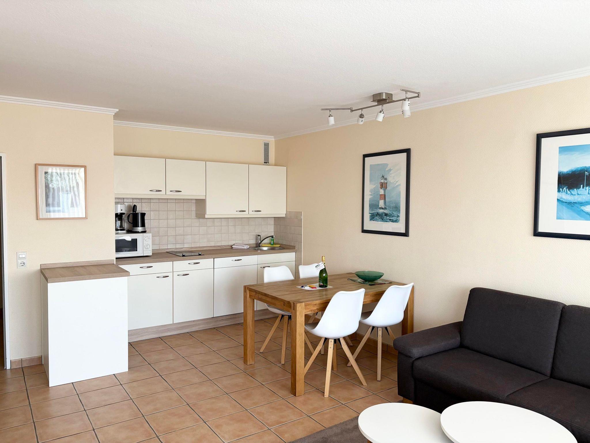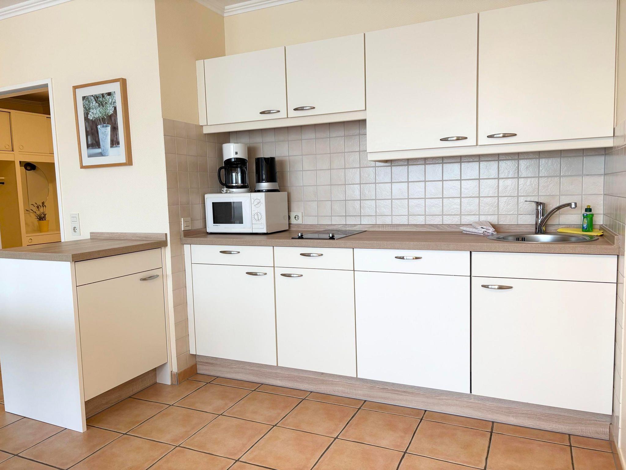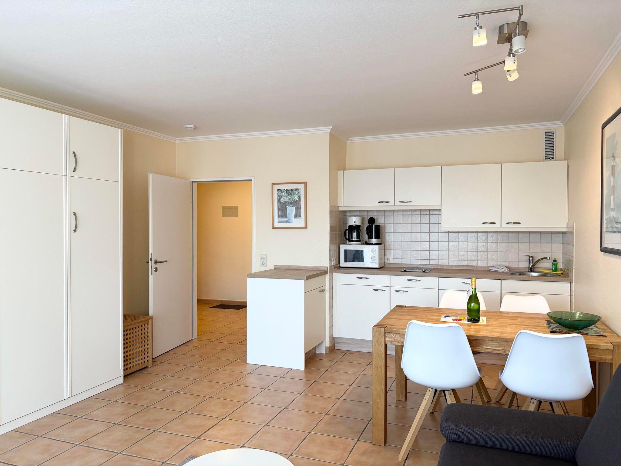 Schlafraum mit 2 Einzelbetten, Wohn-Schlafraum mit 2 Wandschrankbetten, Fußboden ist gefliest, Sitzecke, Essecke, Küchenzeile mit Mikrowelle, Dusche/WC, Durchwahltelefon, Kabel-TV, Balkon, PKW-Platz Nr. 50, Aufzug und Fahrradkeller.