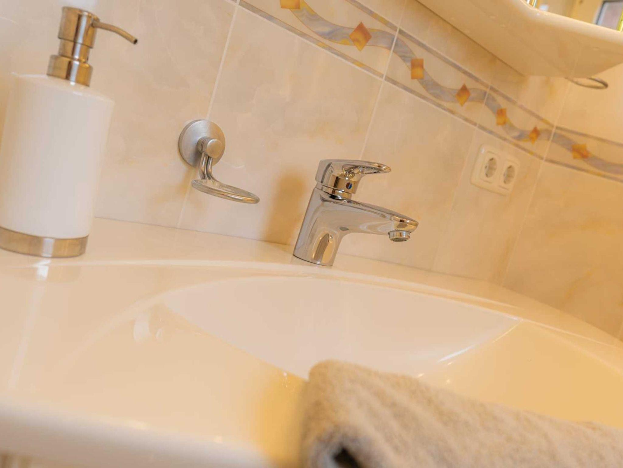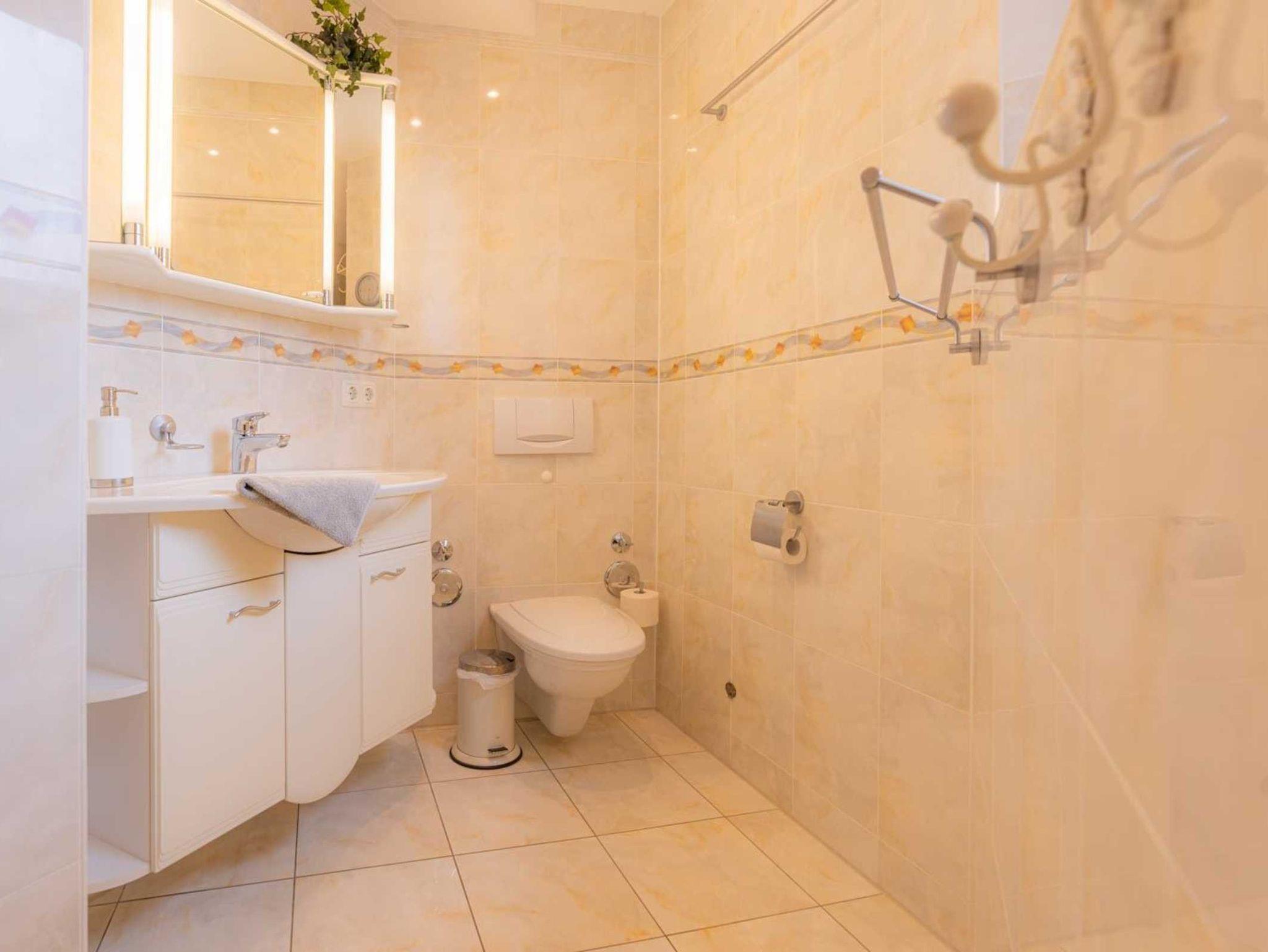 Badezimmer (Duschbad) mit Dusche, WC, Handtuchschrank, Tageslicht, Radio und Föhn.