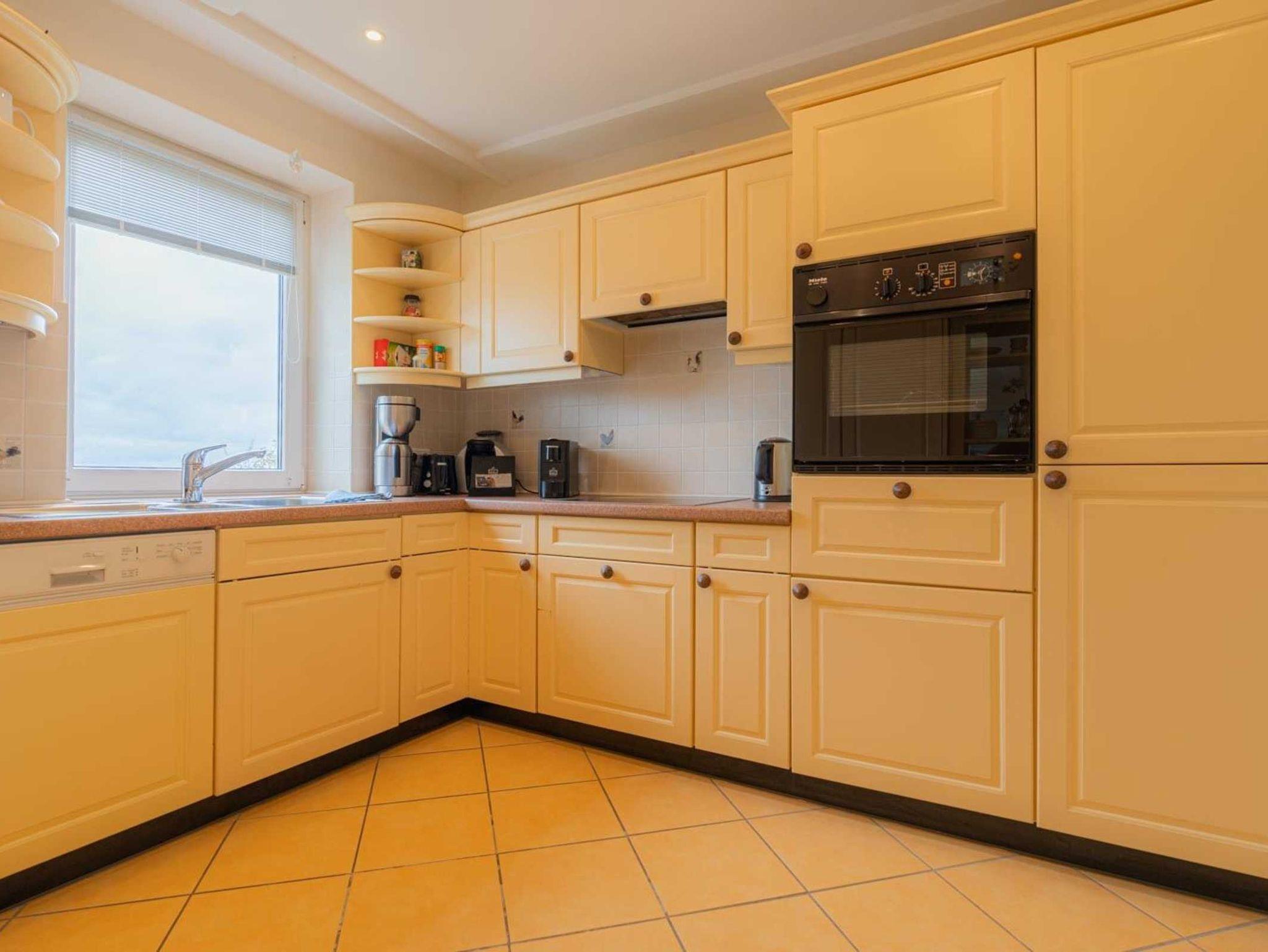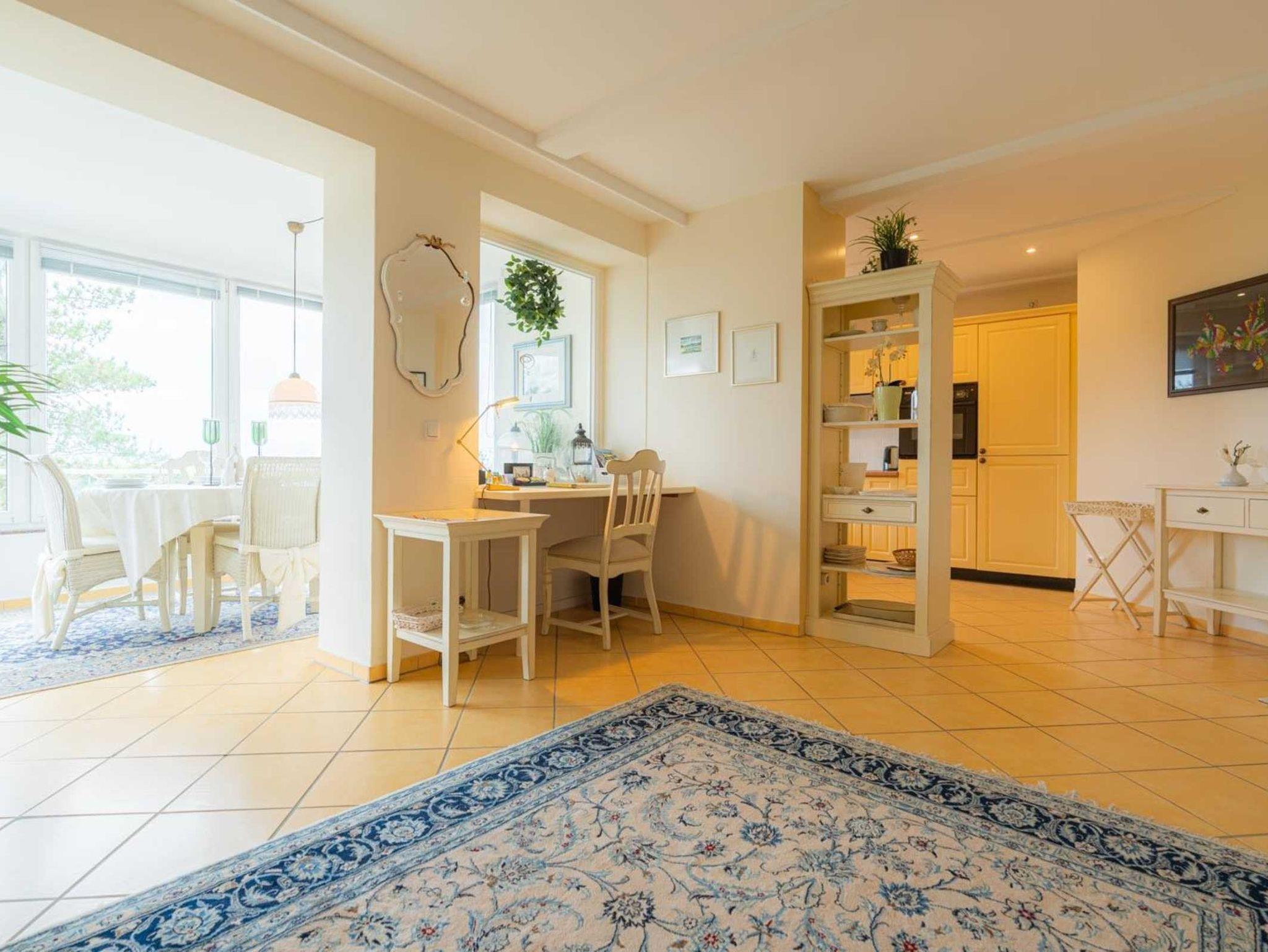 Wohnzimmer mit großer Wohnlandschaft, TV (Sat) mit Sound-Anlage und DVD-Player. Schreibtisch-Nische mit Meerblick. Der Essbereich befindet sich im Wintergarten-Balkon mit unvergleichlichem Panorama-Meerblick und Esstisch für 4 Personen. Direkter Zugang zum möblierten und überdachten Balkon nach Südwesten. Offene Küche mit Mikrowelle, Kühlschrank mit Gefrierfach, Geschirrspüler, Radio, Braun Tassimo-Maschine und Meerblick.