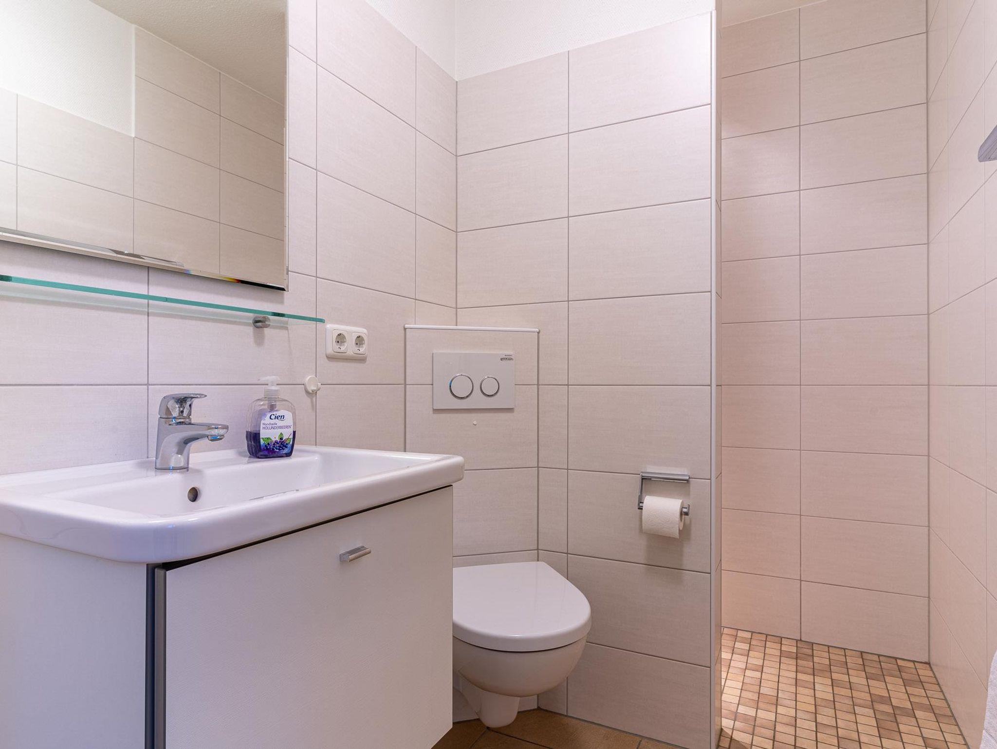 Außerdem finden Sie im Erdgeschoss ein Bad mit ebenerdiger Dusche. Die Waschmaschine steht neben der Gastherme im Abstellraum.