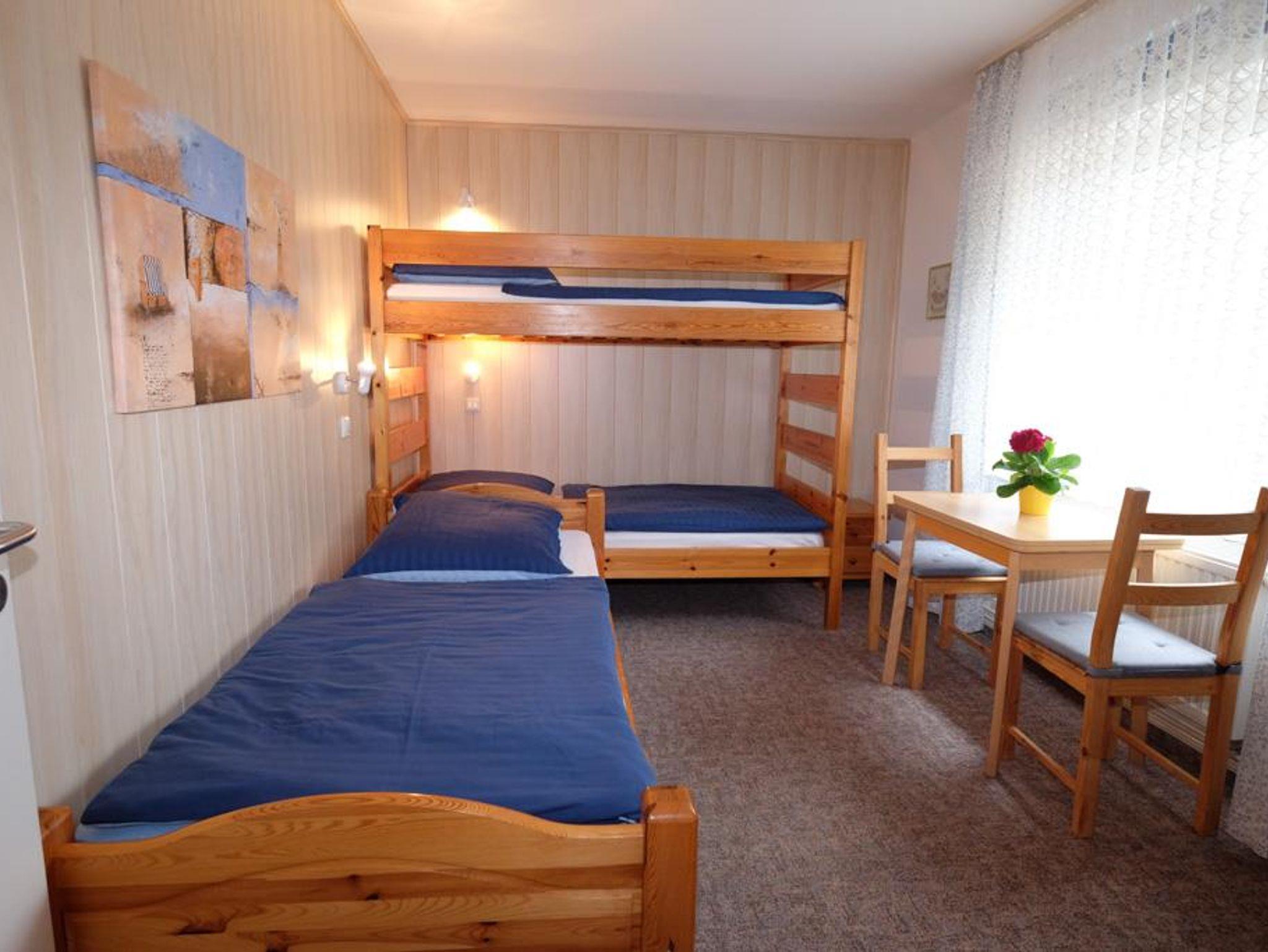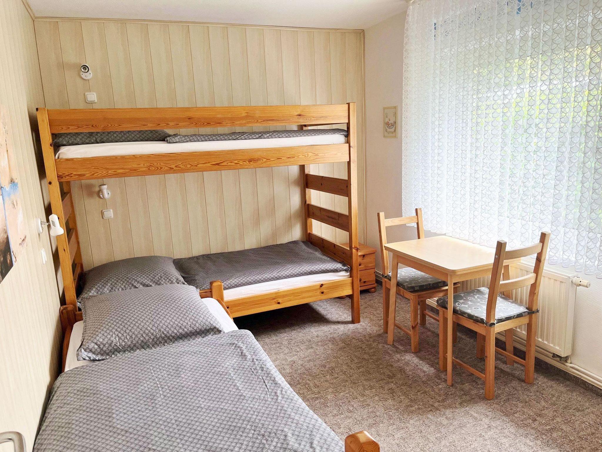 Kinderzimmer mit Etagenbett und Einzelbett, Wohnzimmer mit Farb-TV (Flachbildschirm) und Radio.