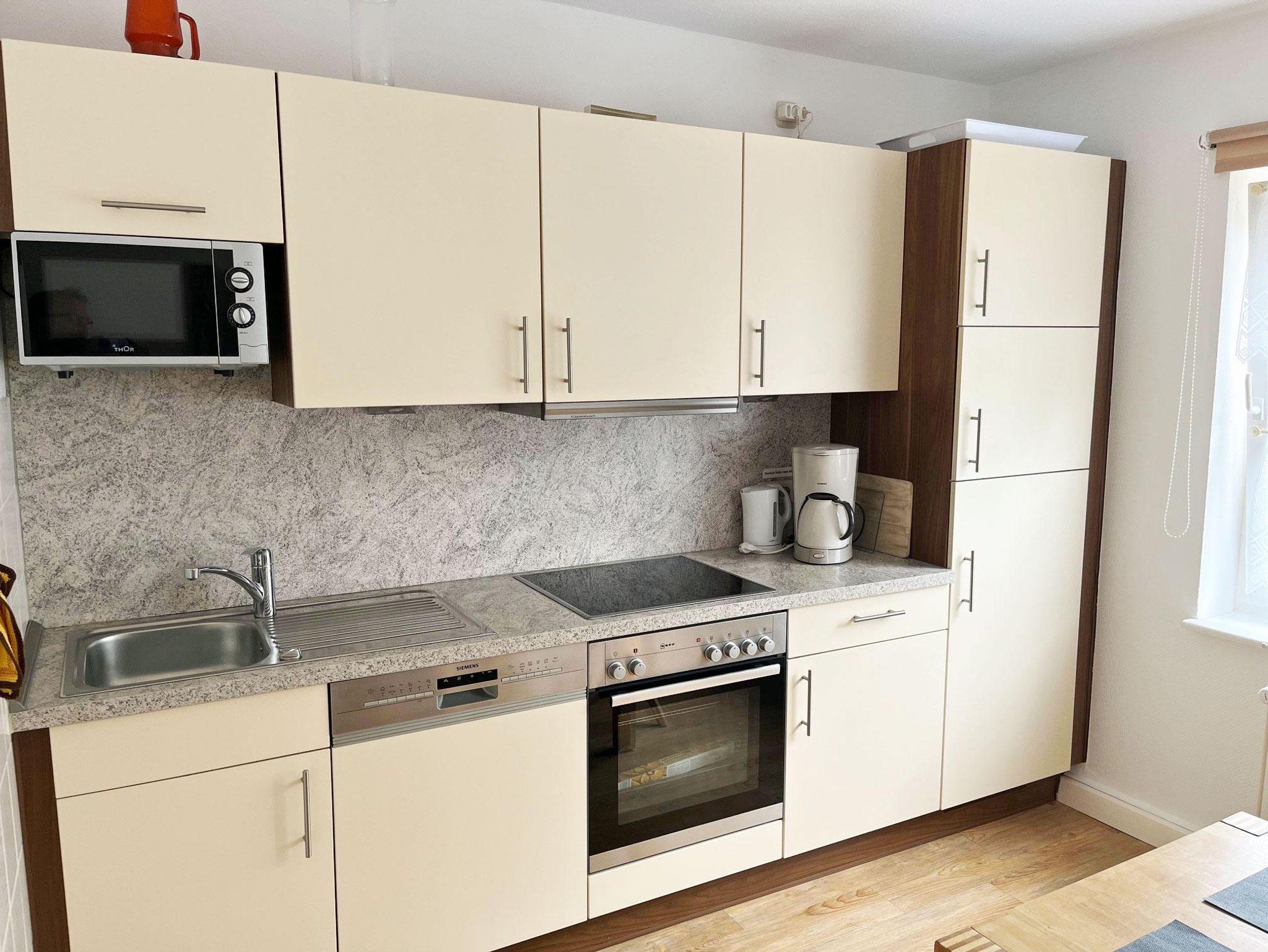 Modern eingerichtete Küche mit Essecke, Geschirrspüler,Mikrowelle, Ceranfeld und Backofen.