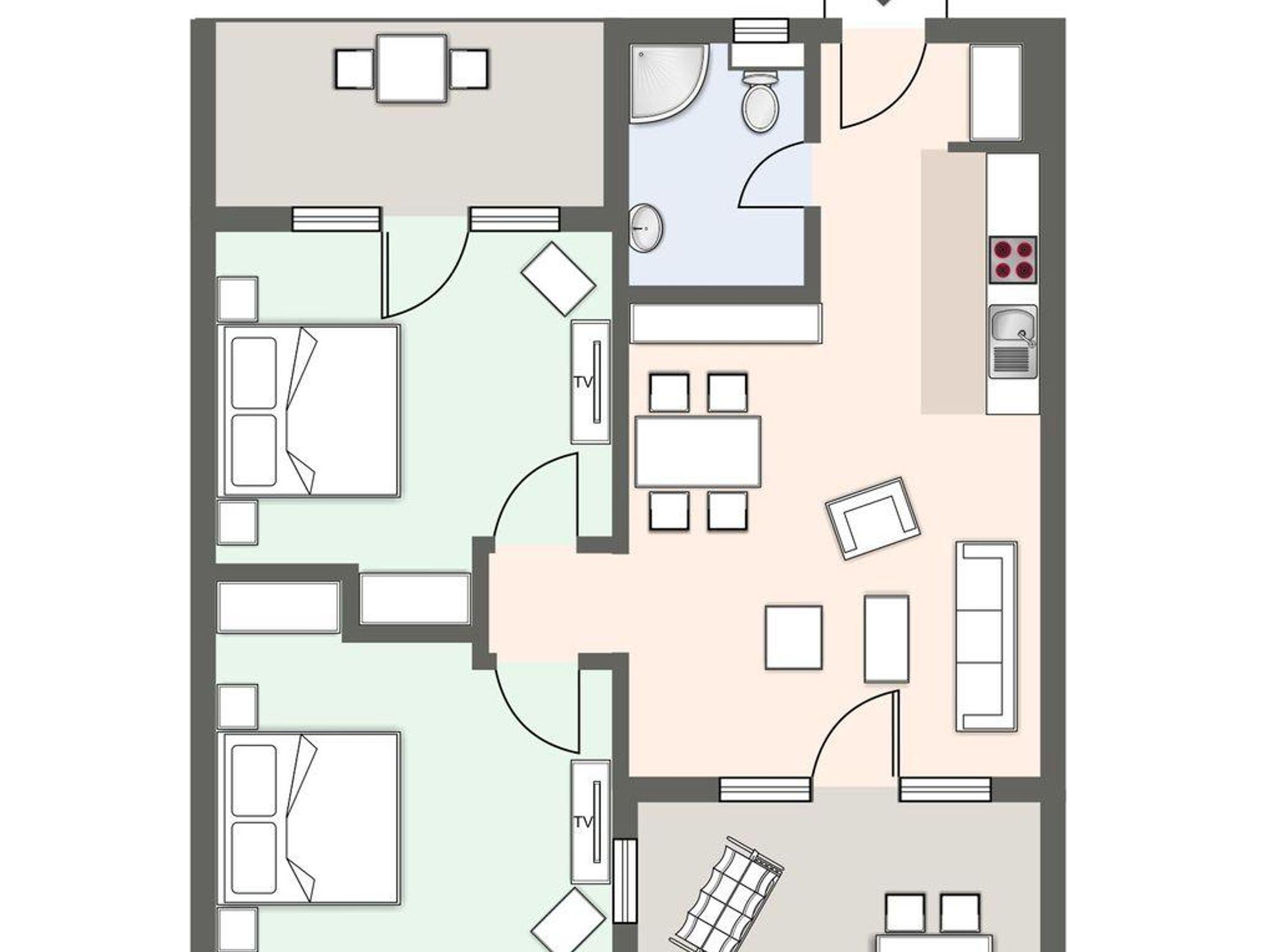Die beiden Schlafzimmer sind jeweils mit einem Doppelbett ausgestattet. Von einem Schlafzimmer gelangen Sie auf eine weitere gemütliche Terrasse.