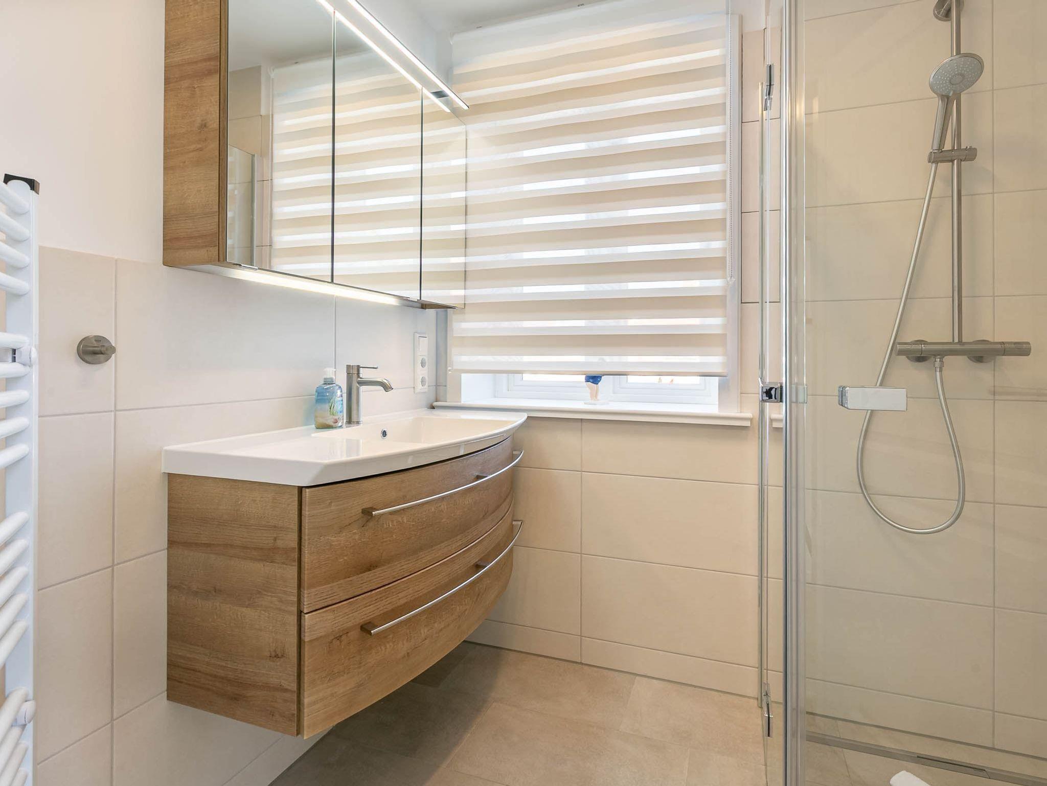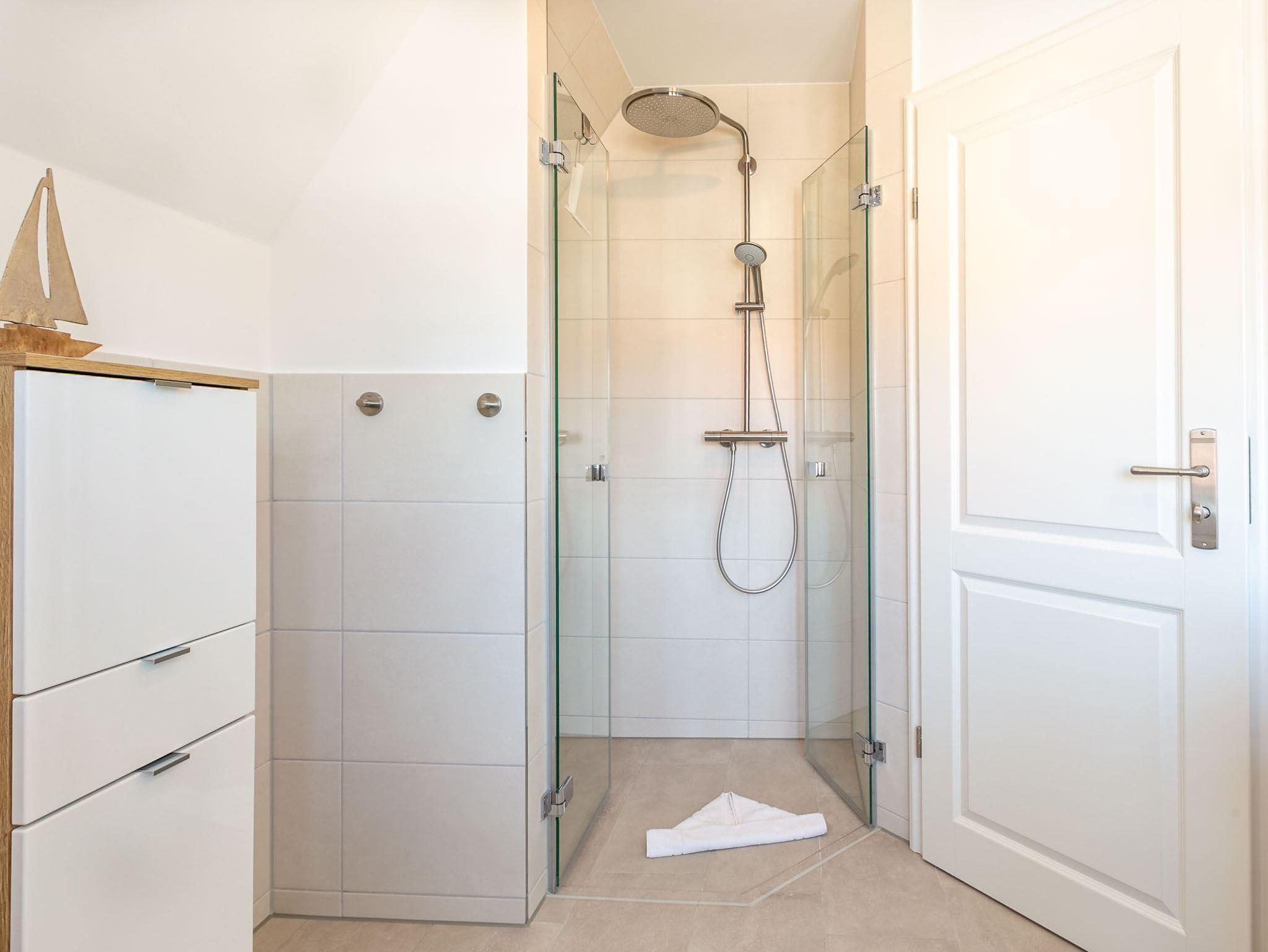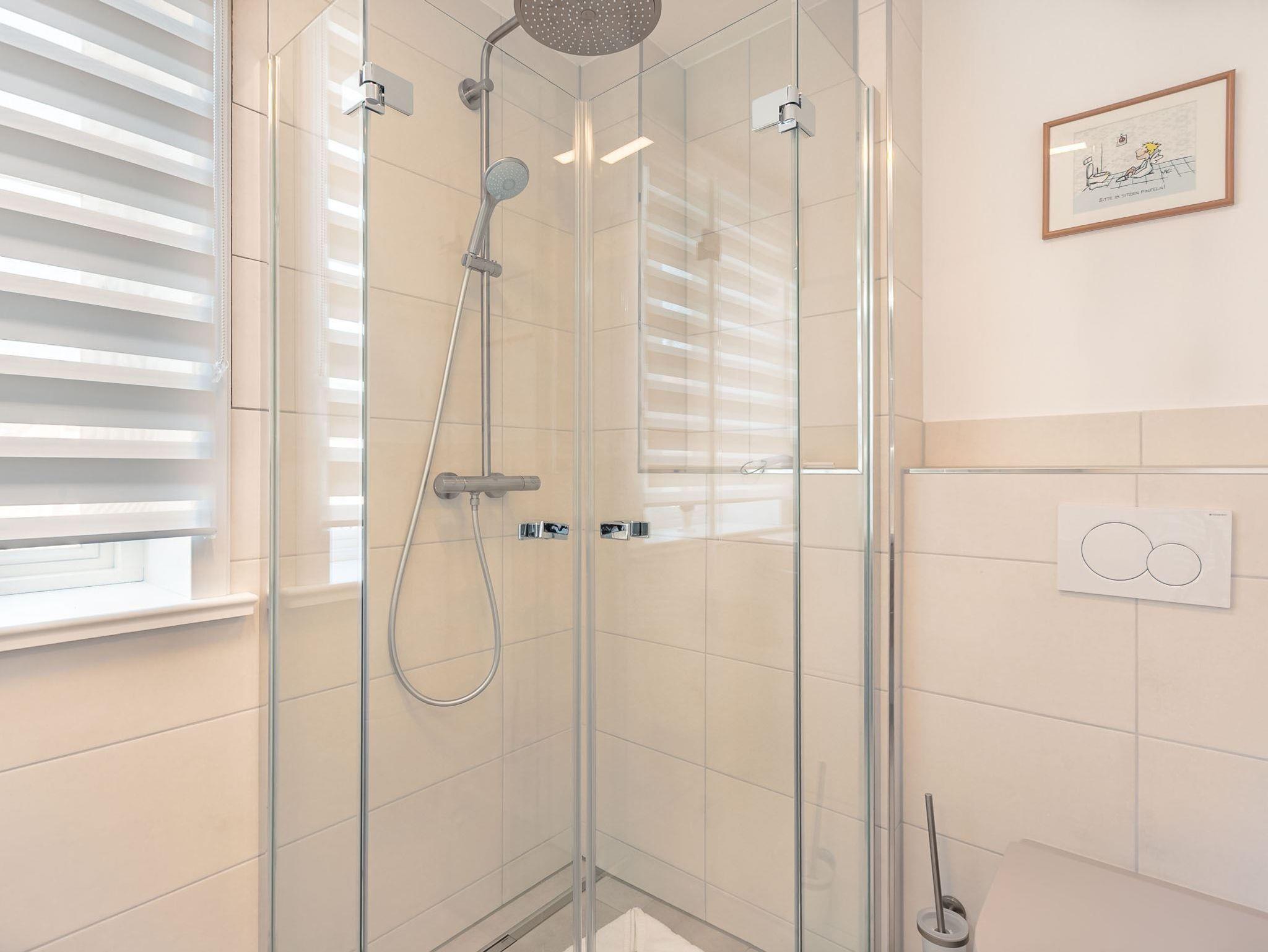 2. Bad (OG) mit ebenerdiger Regen-Dusche, WC, Handtuchwärmer, Tageslicht und Föhn.