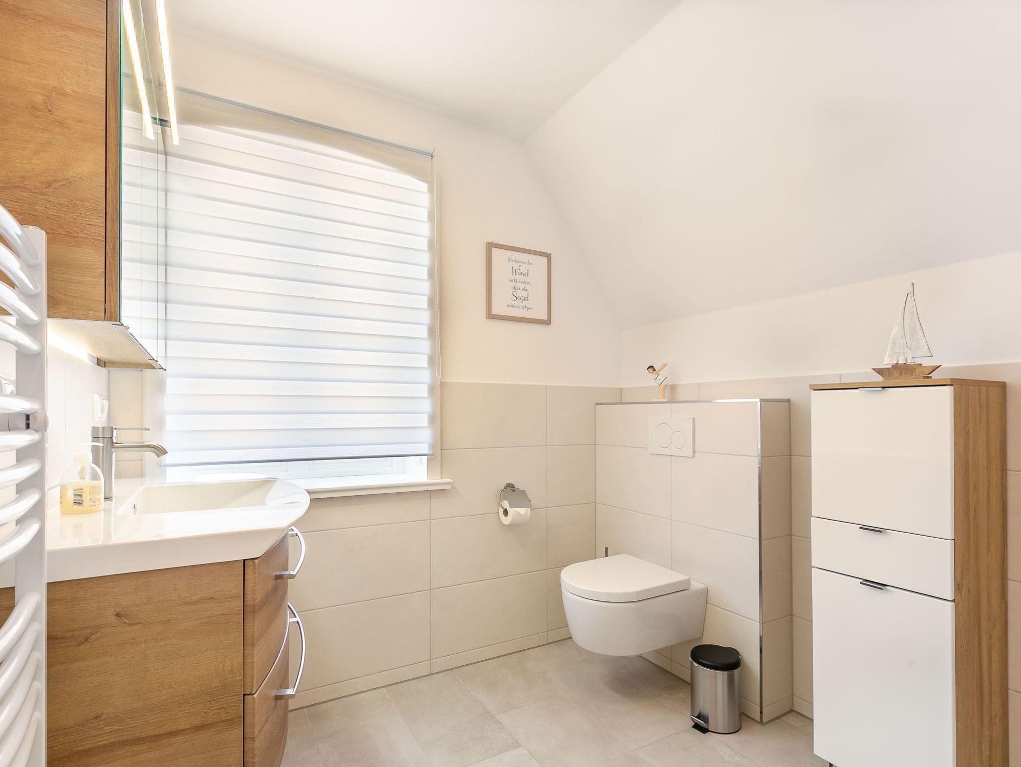 1. Bad (EG) mit ebenerdiger Regen-Dusche, WC, Handtuchwärmer und Tageslicht.