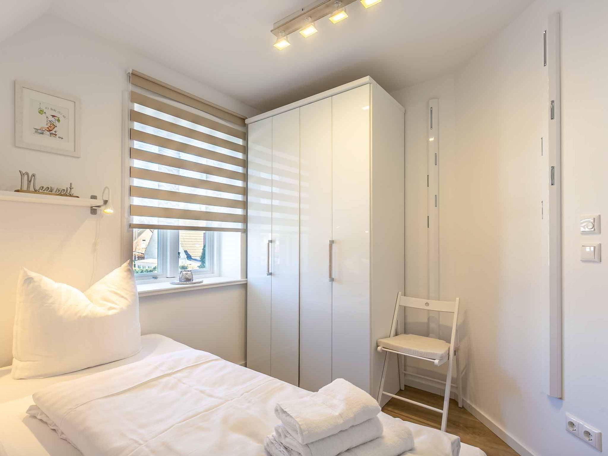 3. Schlafzimmer (OG) mit Doppelbett (2x 90x200cm), Kleiderschrank und Klappstuhl.