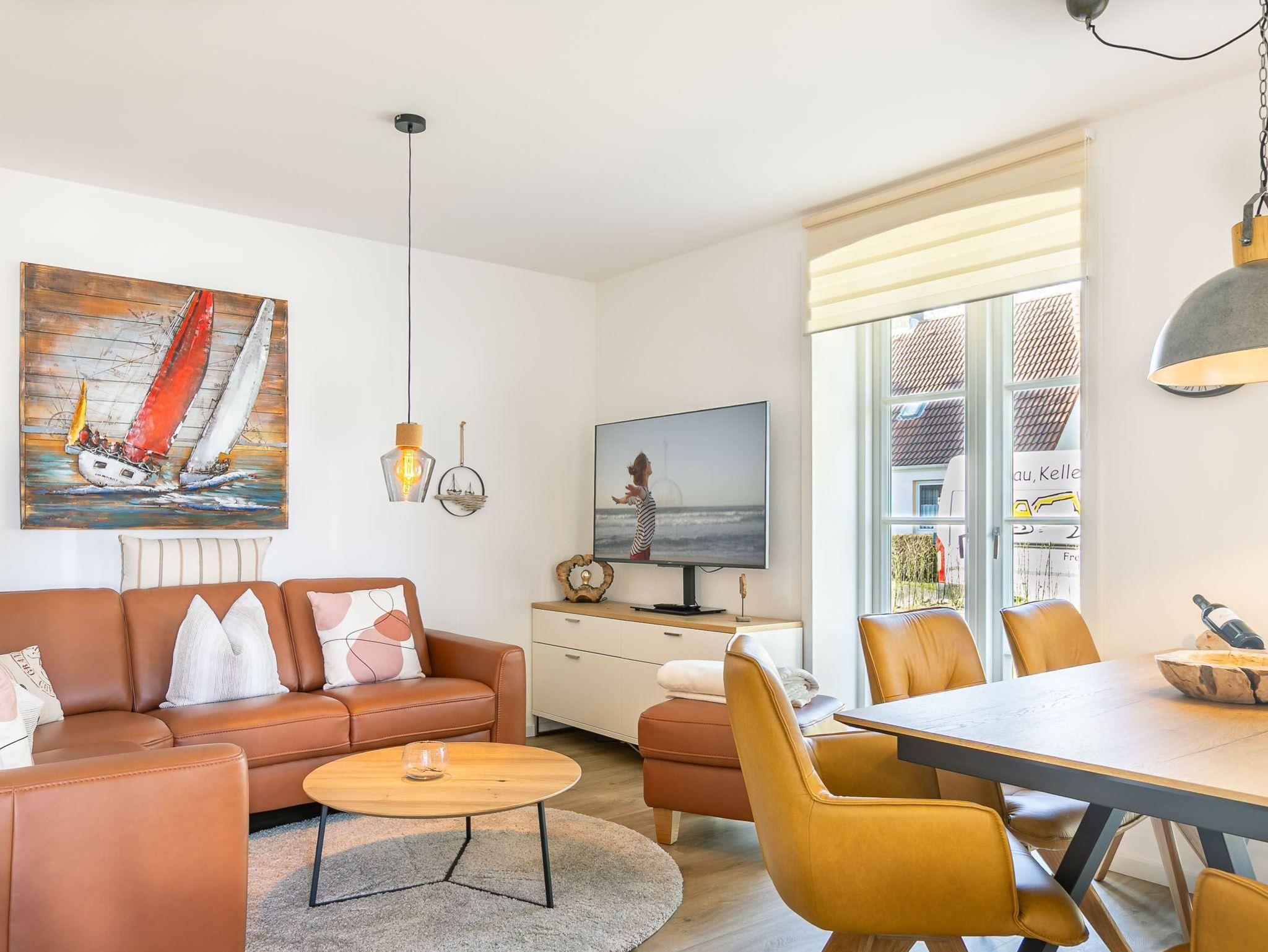 Wohnzimmer mit Lederecksofa, großem SMART-TV (Waipu), Esstisch mit 6 Stühlen und Austritt auf die West-Terrasse.